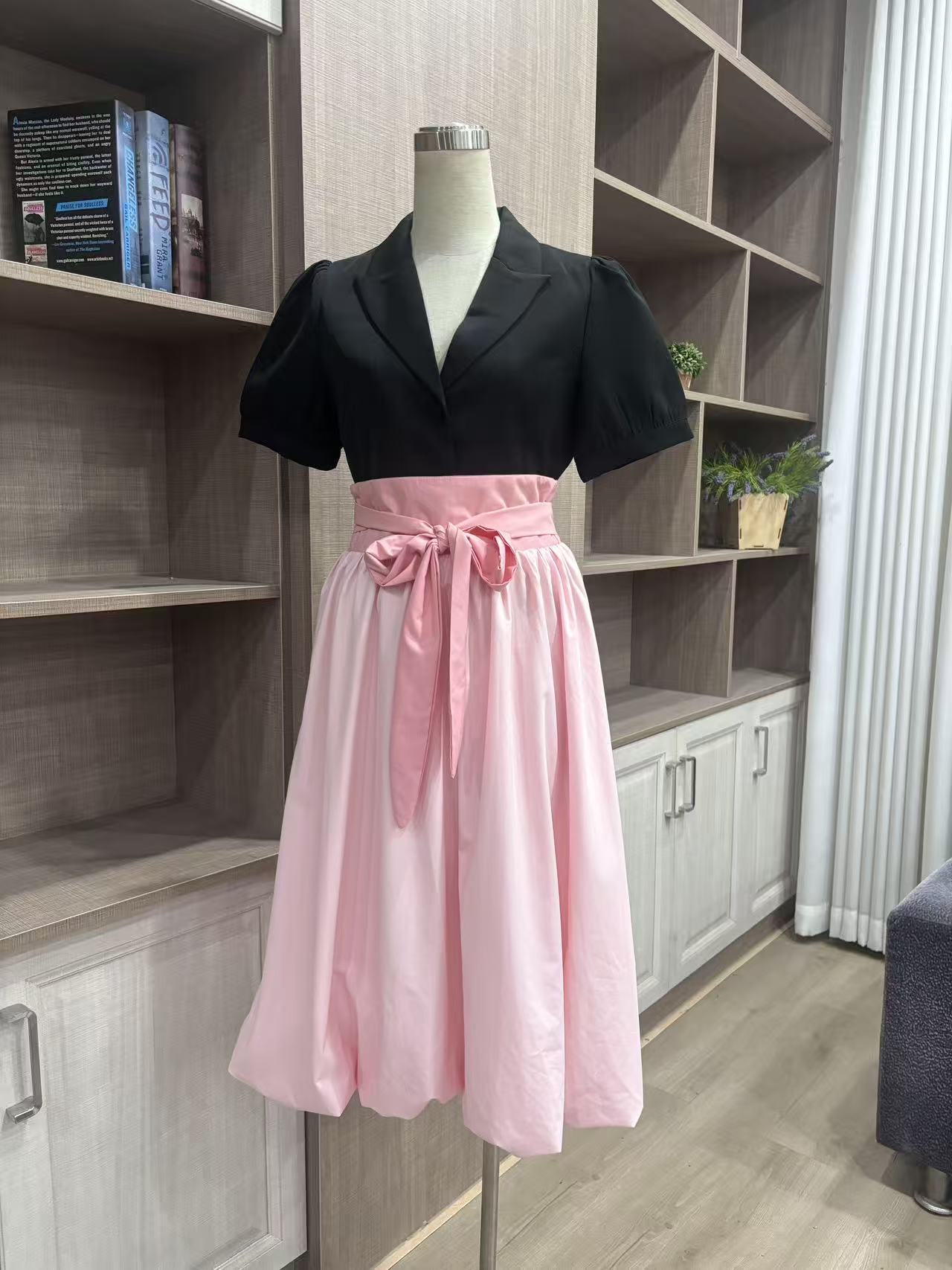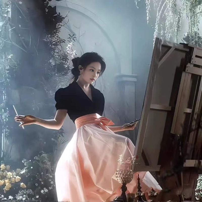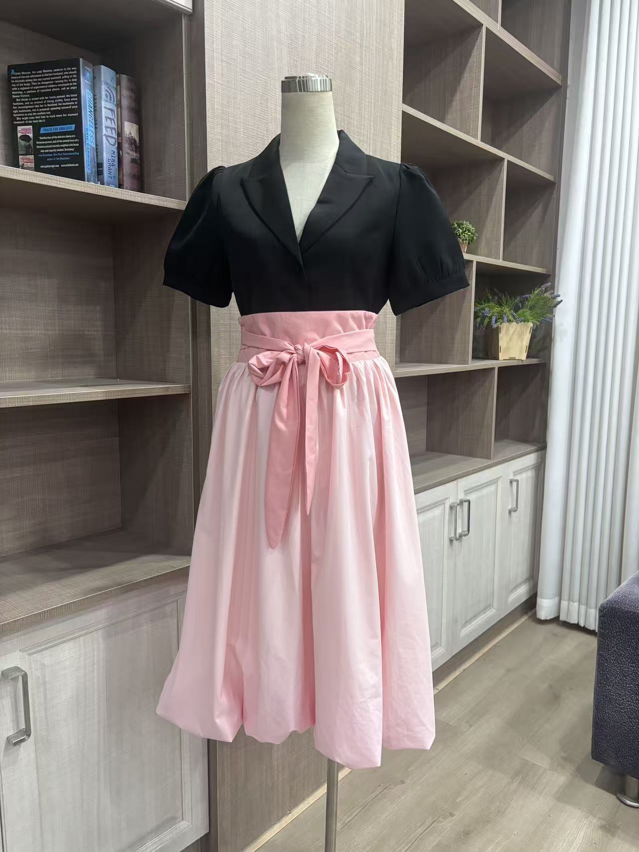 유이페이와 같은 스타일의 블랙 브이넥 셔츠 탑 여성용 여름 핑크 프렌치 스타일 퍼프 스커트 세트스토어 가기