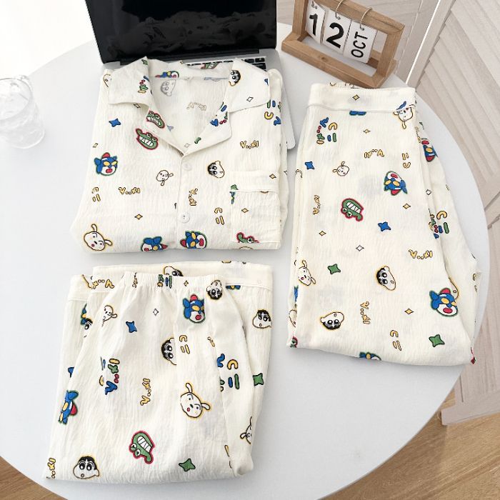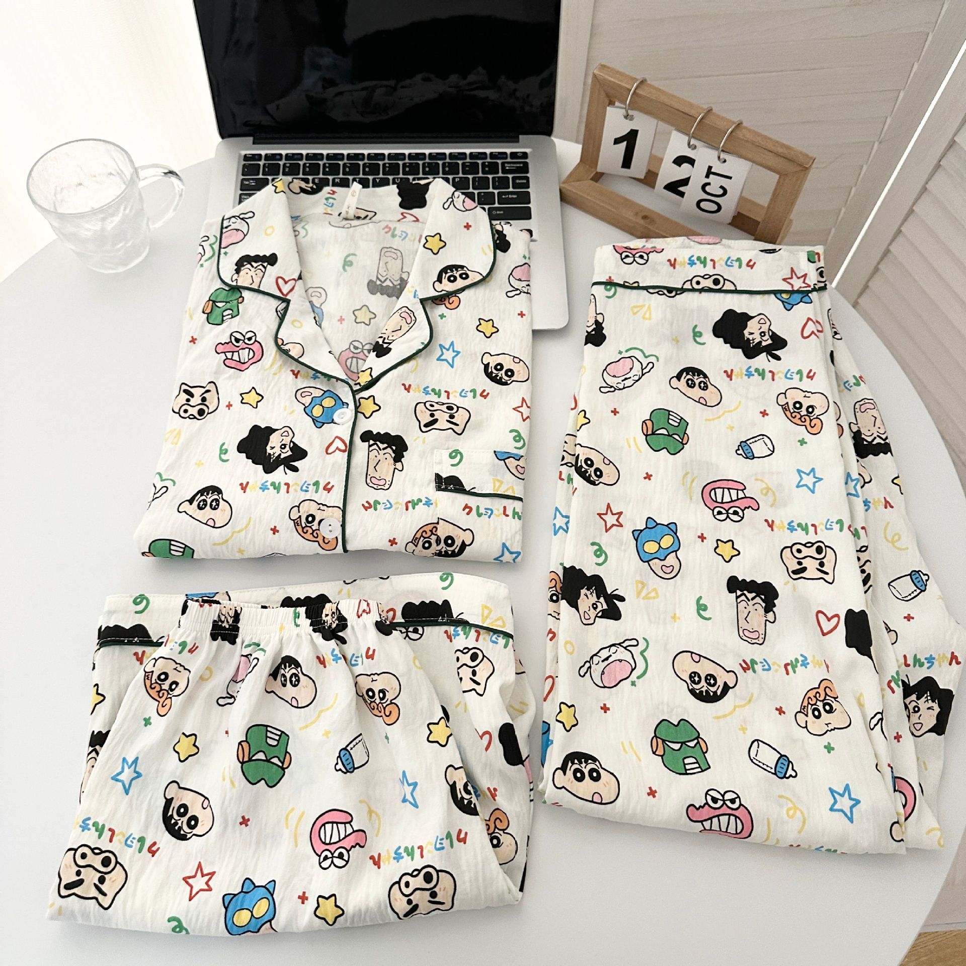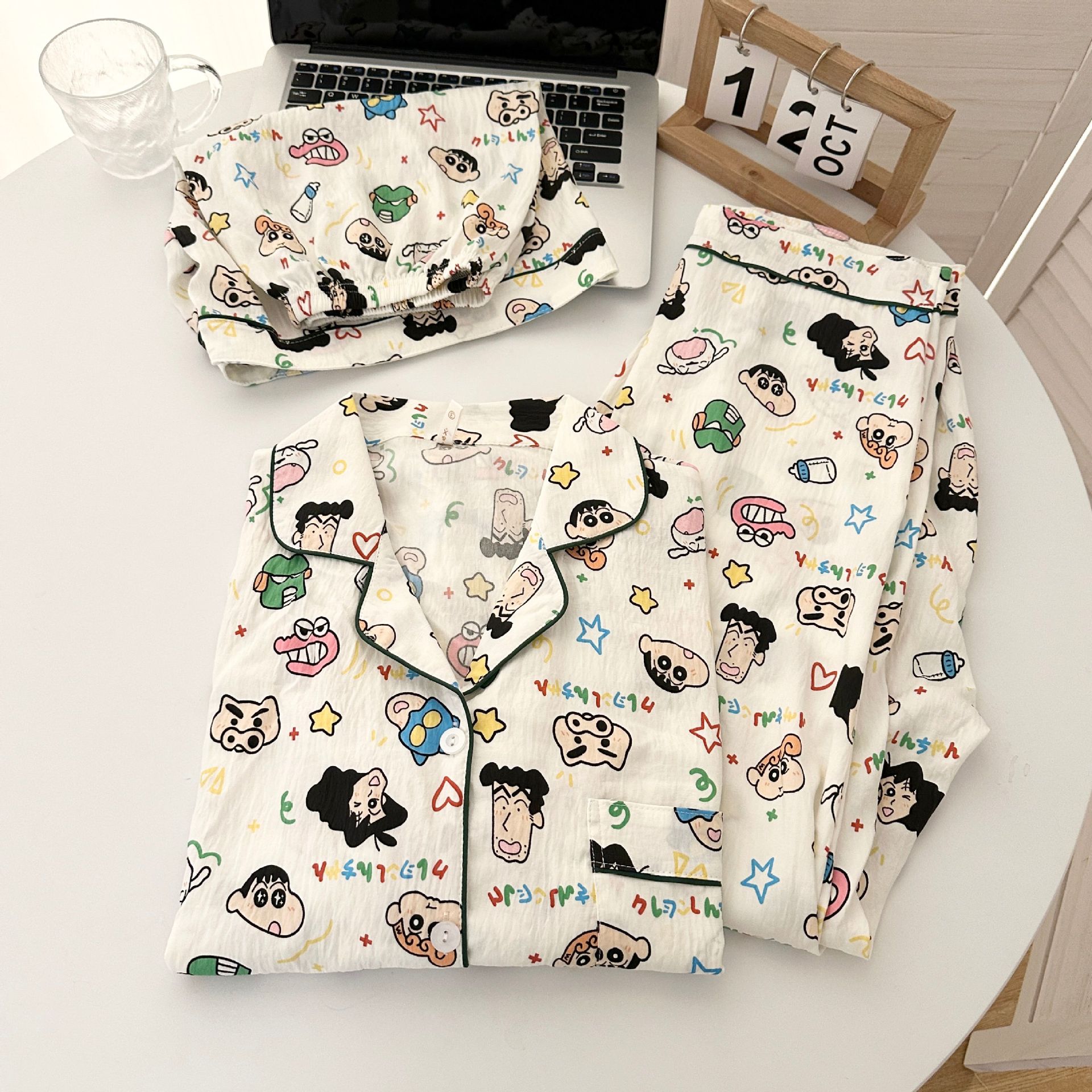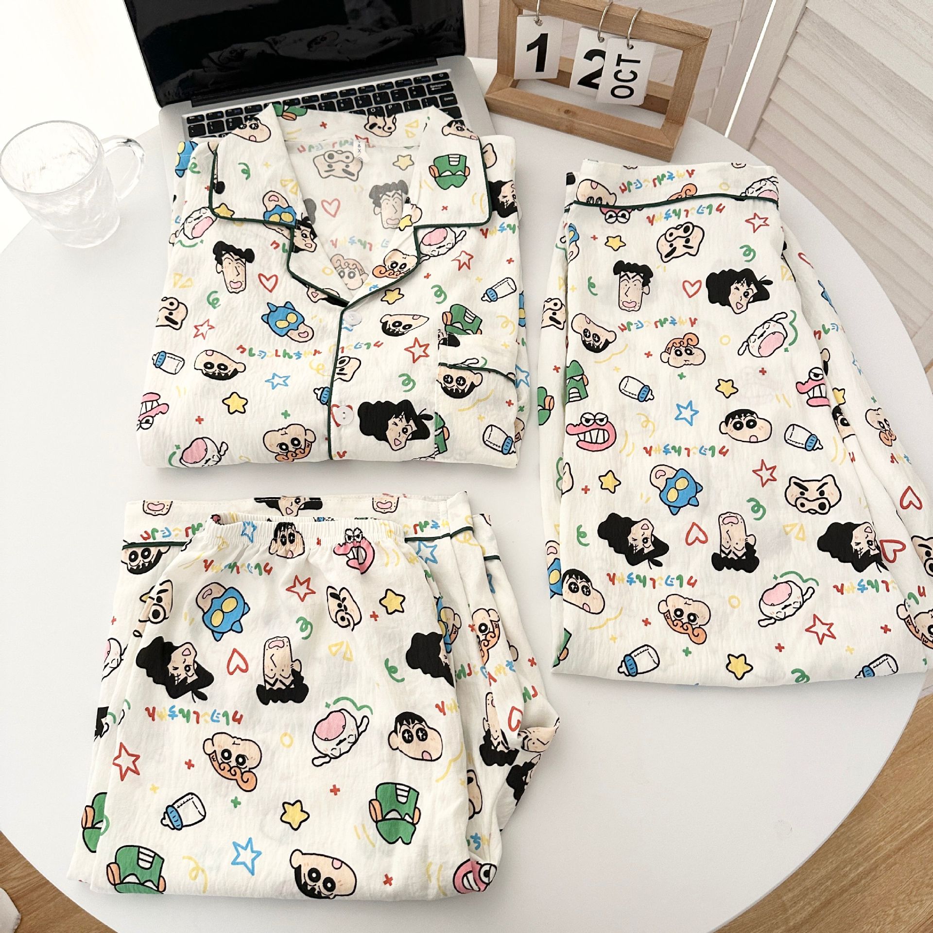 여름 새로운 클라우드 코튼 커플 잠옷 3 피스 세트 만화 Xiaoxin 반팔 옷깃 남성 홈웨어 3 피스 세트
