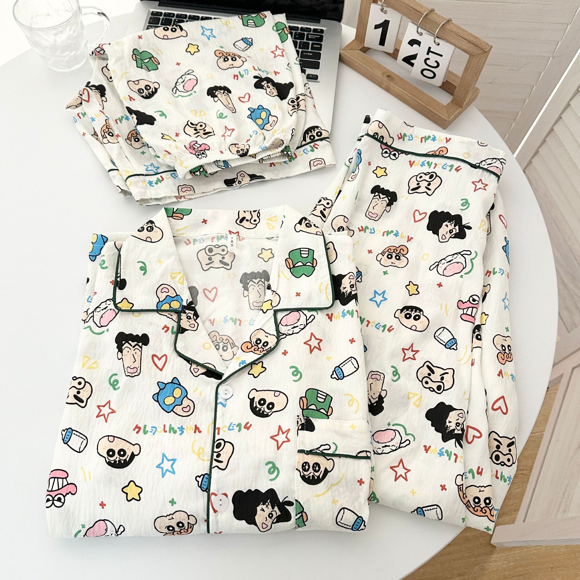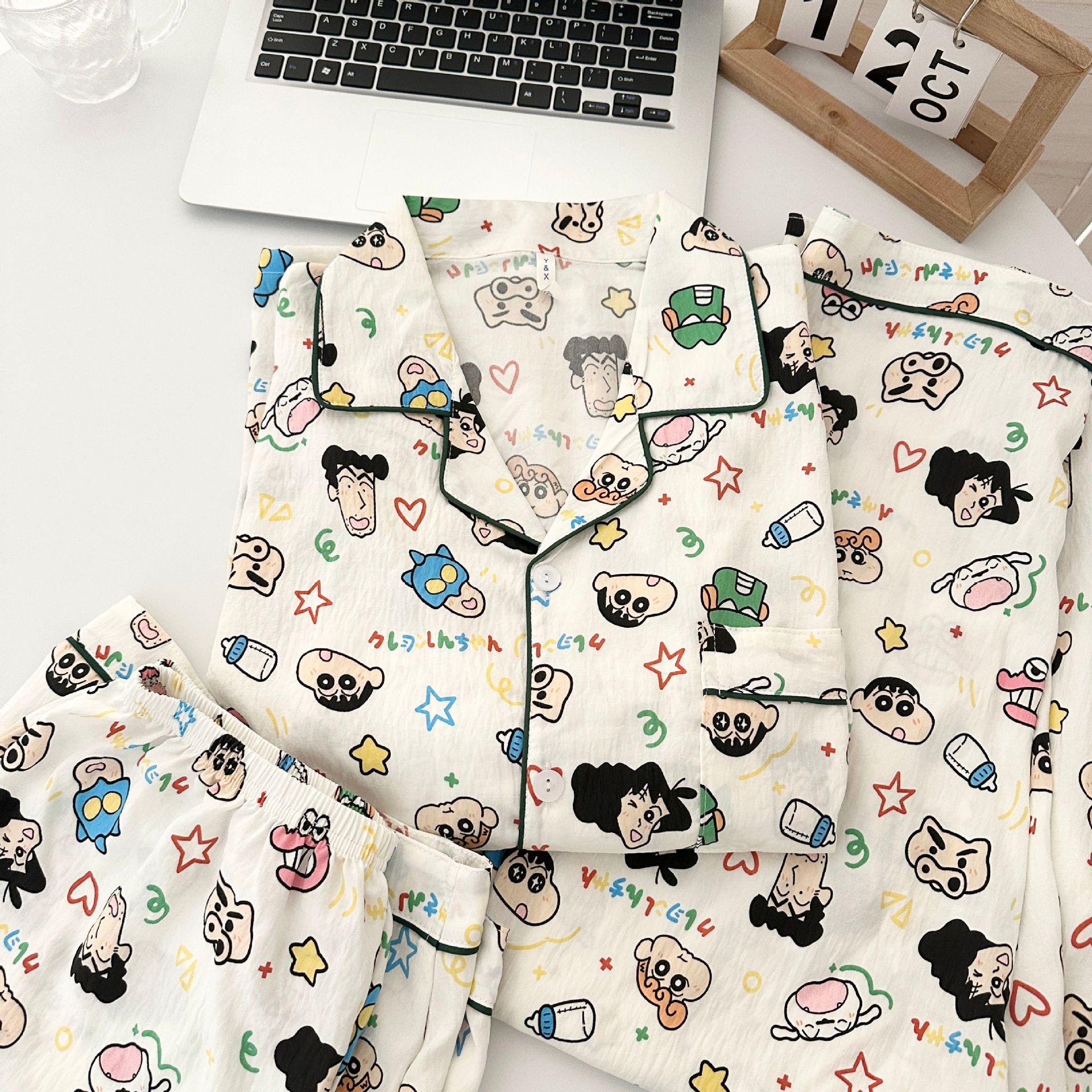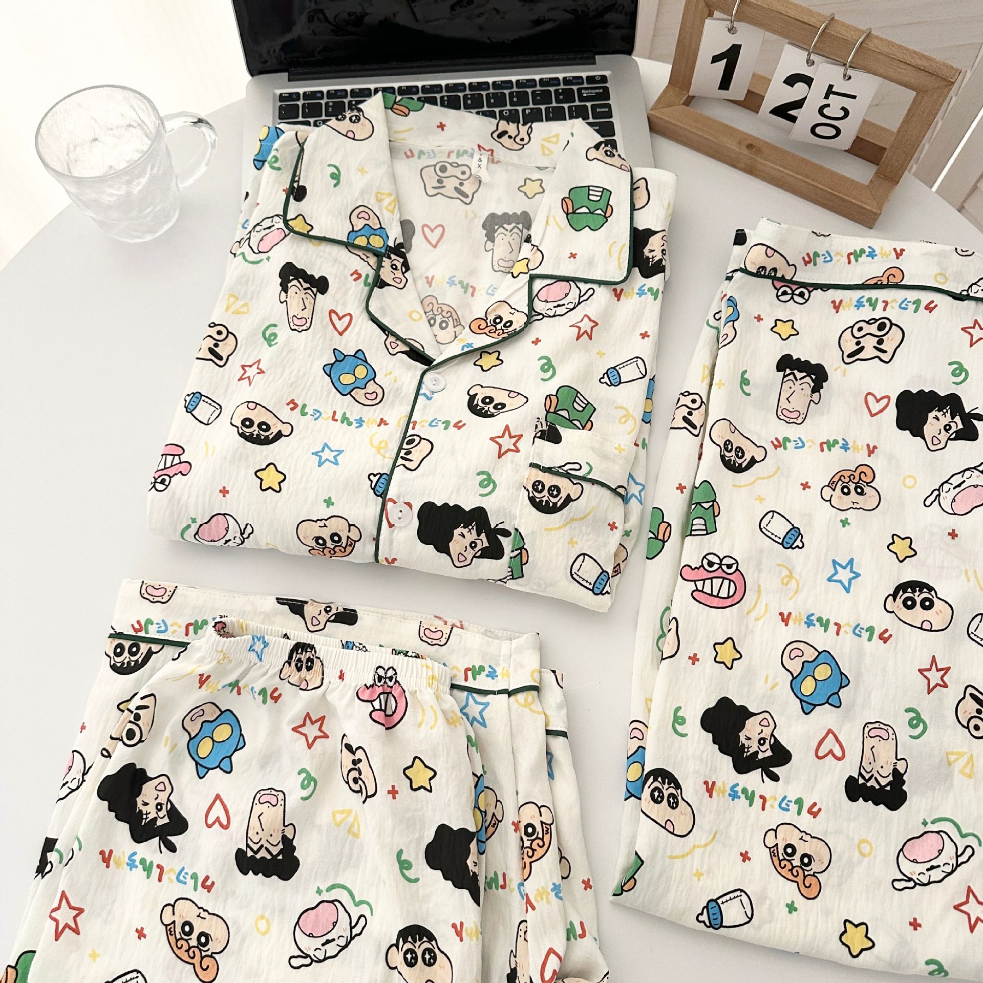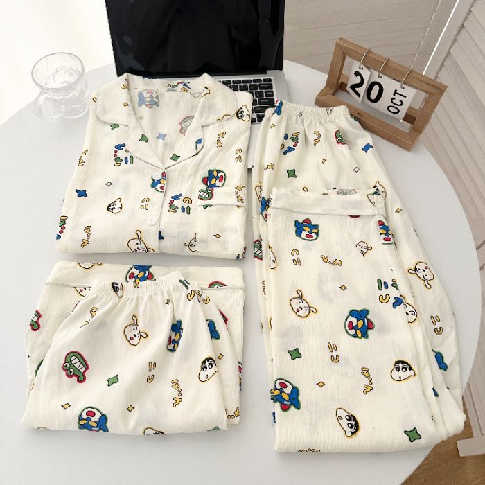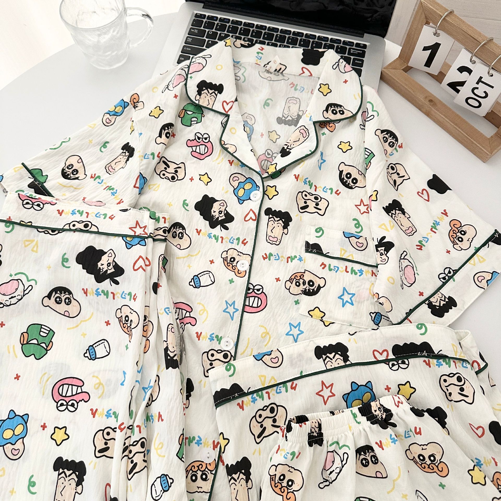 여름 새로운 클라우드 코튼 커플 잠옷 3 피스 세트 만화 Xiaoxin 반팔 옷깃 남성 홈웨어 3 피스 세트
