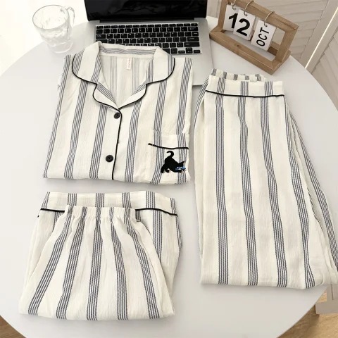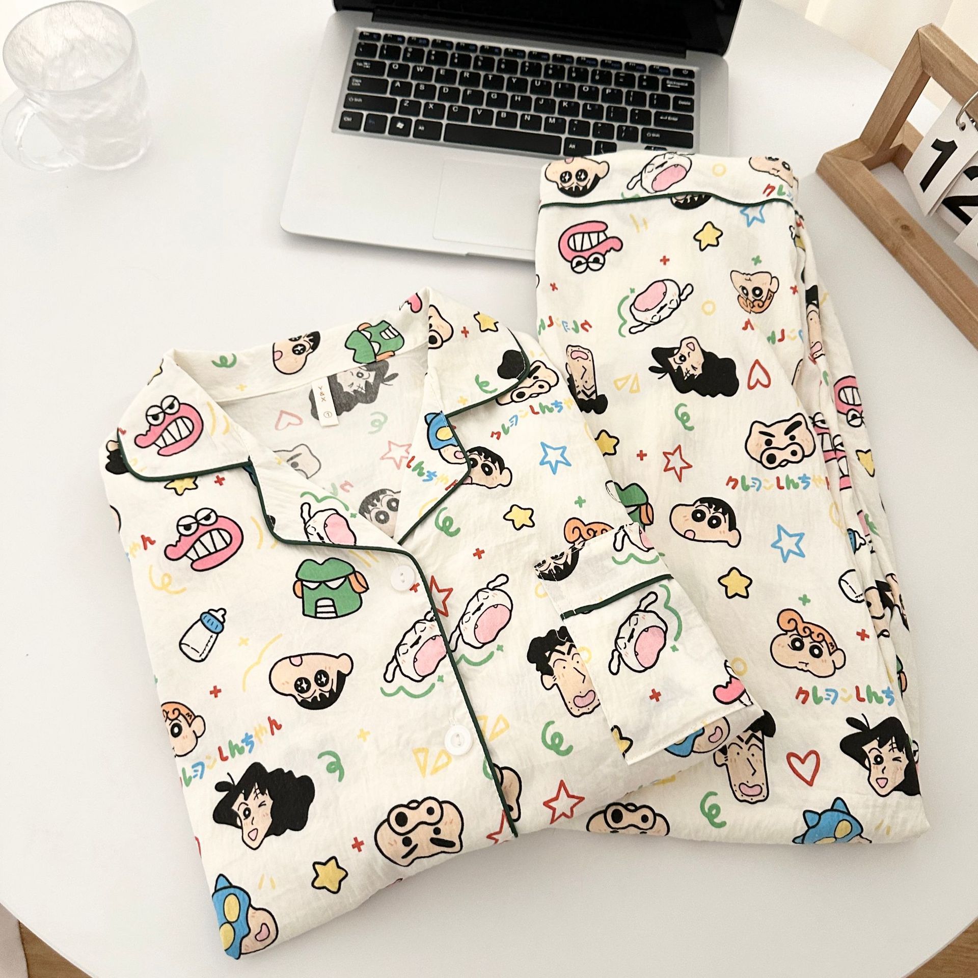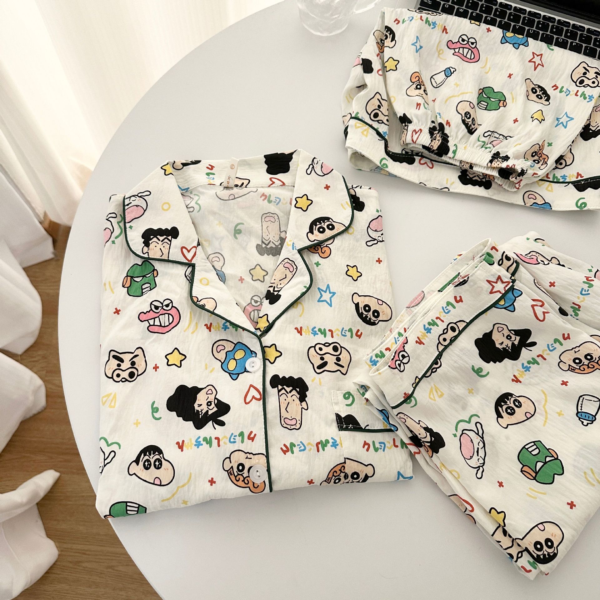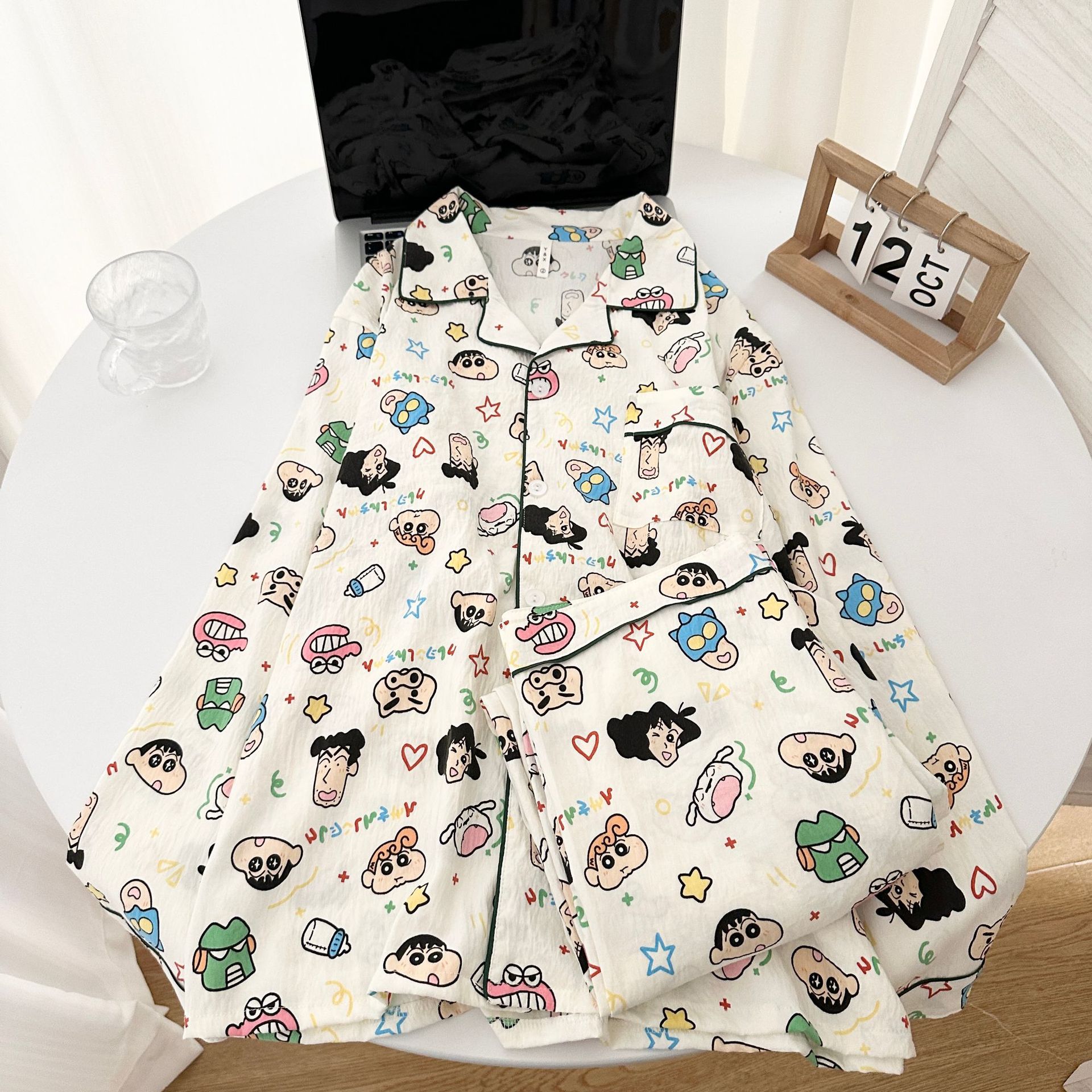 여름 새로운 클라우드 코튼 커플 잠옷 3 피스 세트 만화 Xiaoxin 반팔 옷깃 남성 홈웨어 3 피스 세트