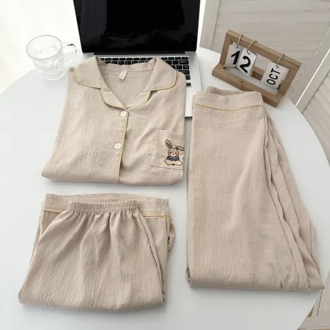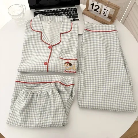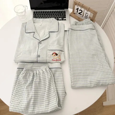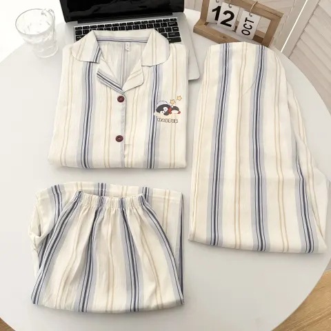 여름 새로운 클라우드 코튼 커플 잠옷 3 피스 세트 만화 Xiaoxin 반팔 옷깃 남성 홈웨어 3 피스 세트스토어 가기
