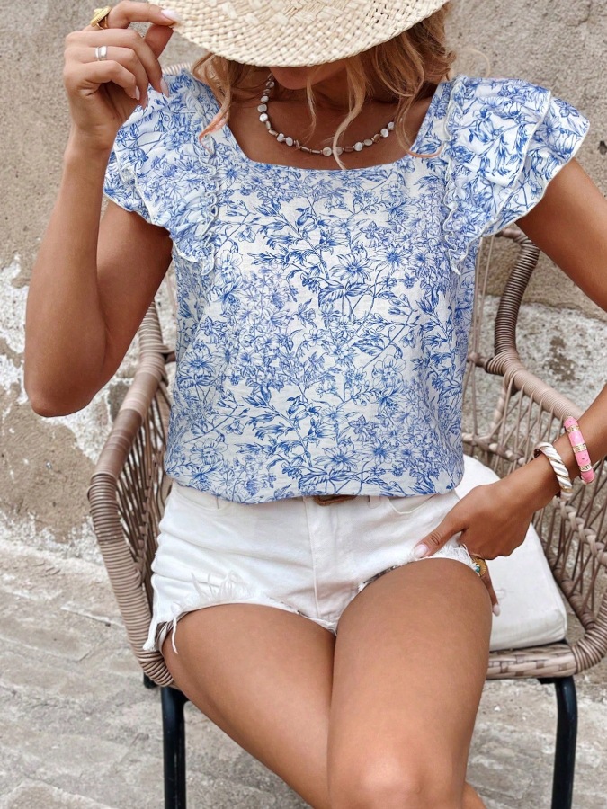 2026 유럽 및 미국 해외 여성복 아마존 프린트 여름 패션 뒷면 리본 장식 이중 주름 반팔 셔츠스토어 가기