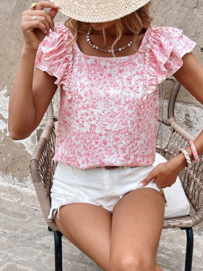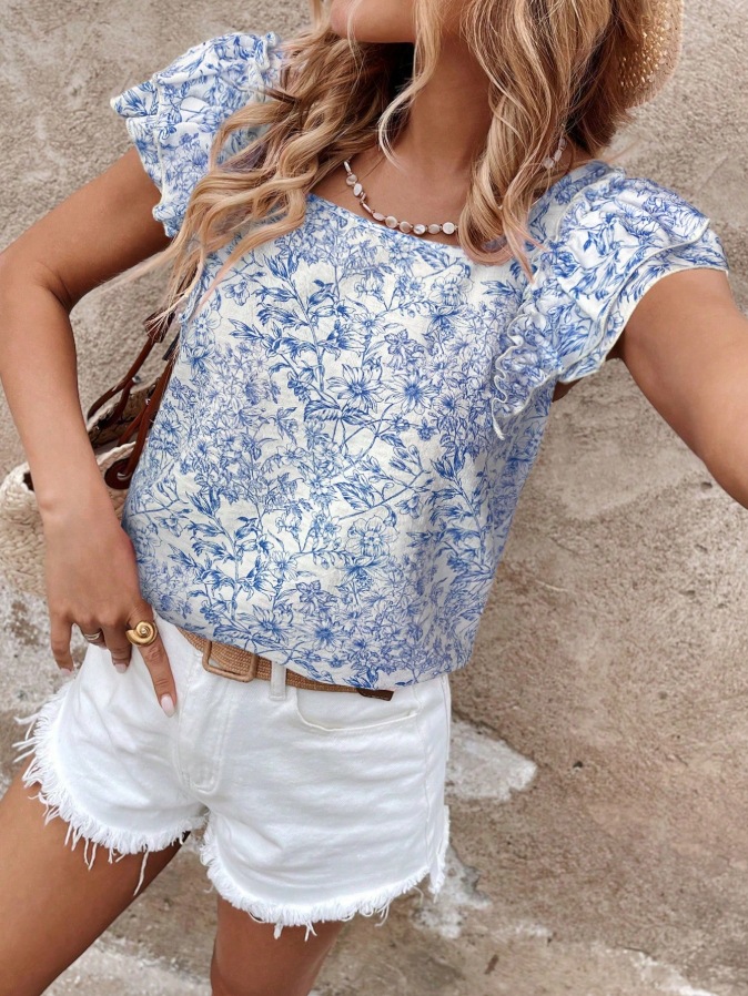 2026 유럽 및 미국 해외 여성복 아마존 프린트 여름 패션 뒷면 리본 장식 이중 주름 반팔 셔츠