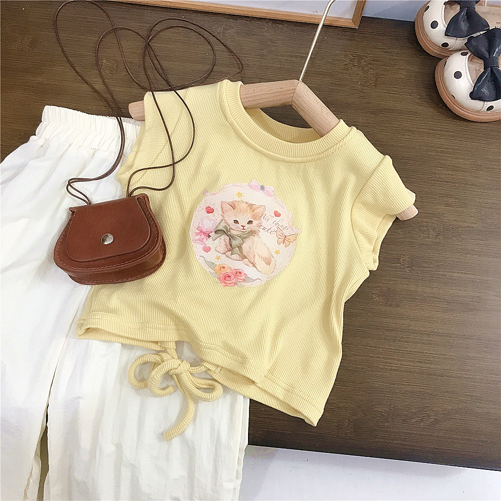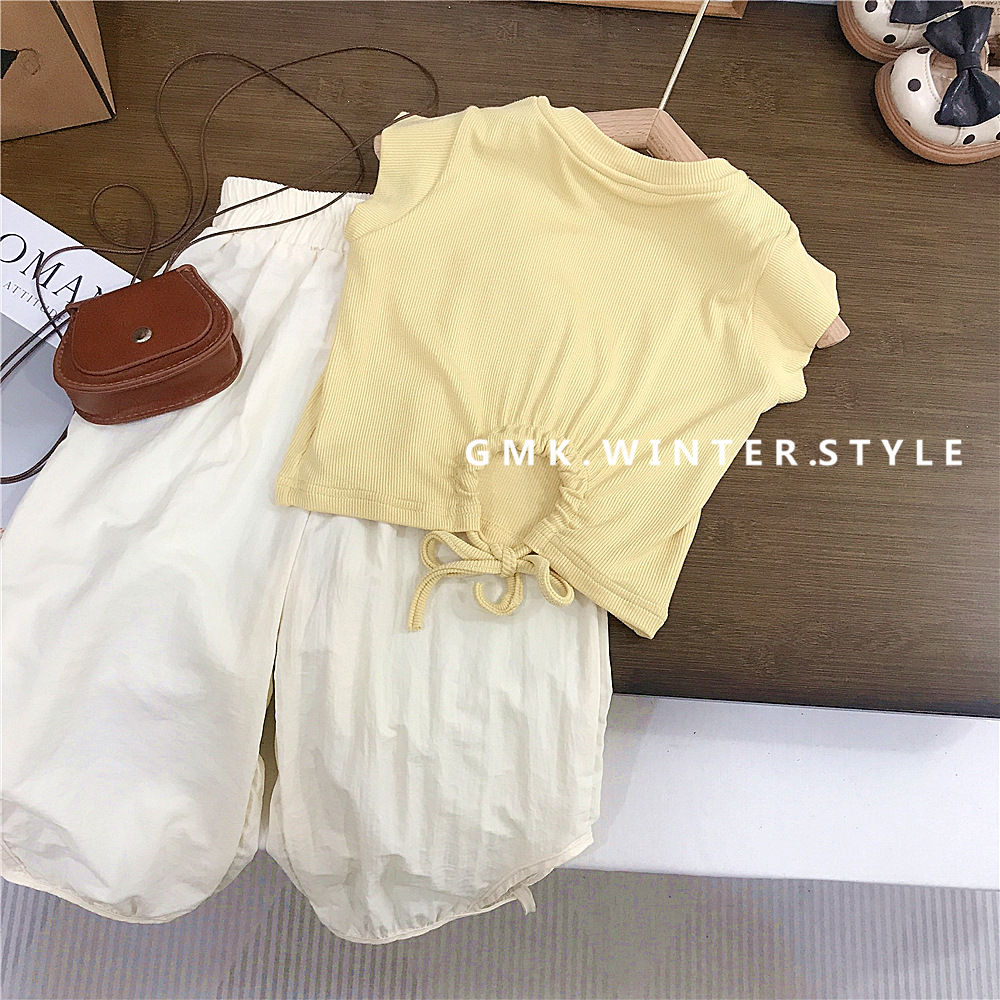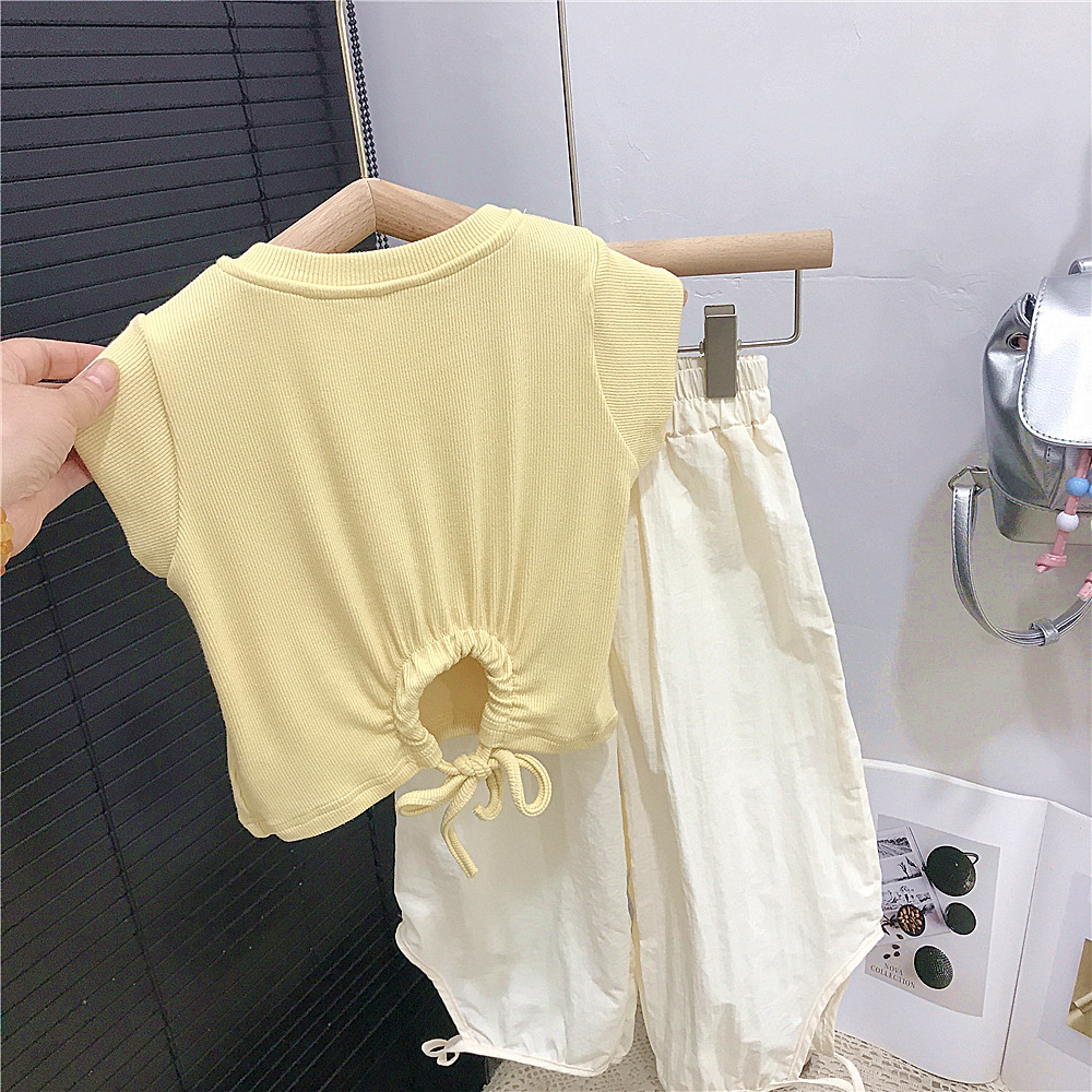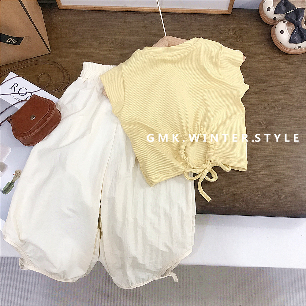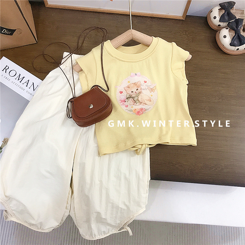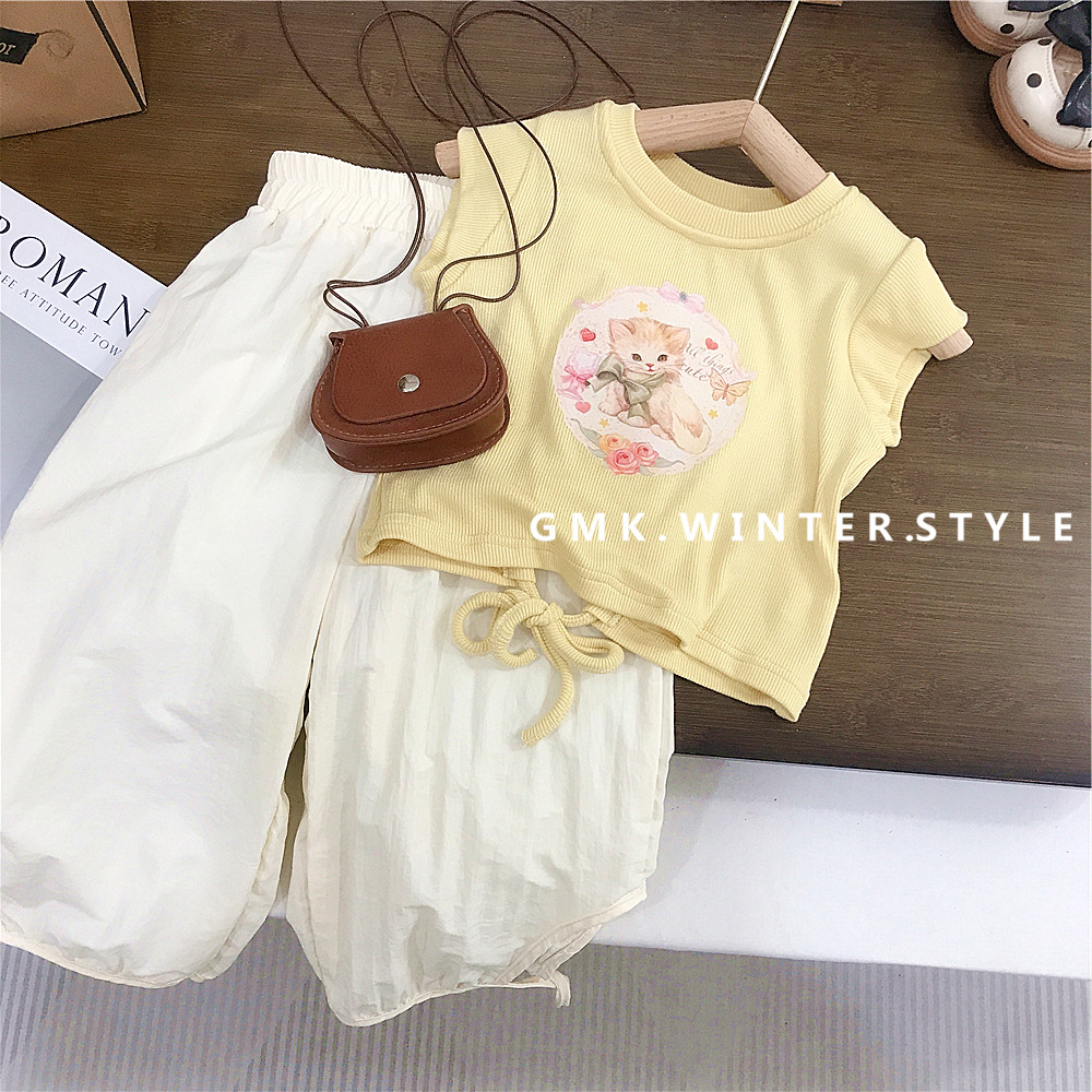 여아 정장 여름 새로운 스타일 한국 캐주얼 반팔 티셔츠 안티 패턴 바지 여아 캐주얼 투피스 세트 유행 대외 무역