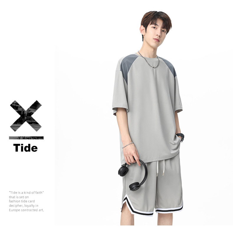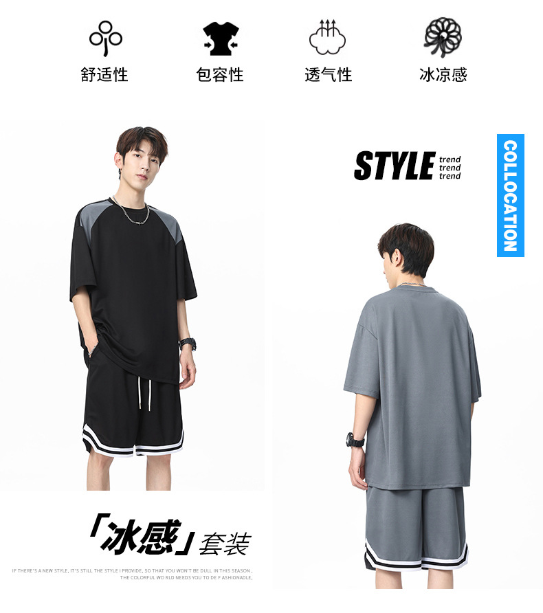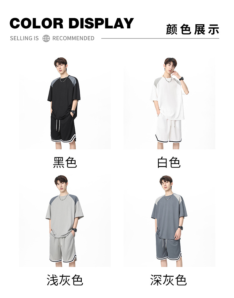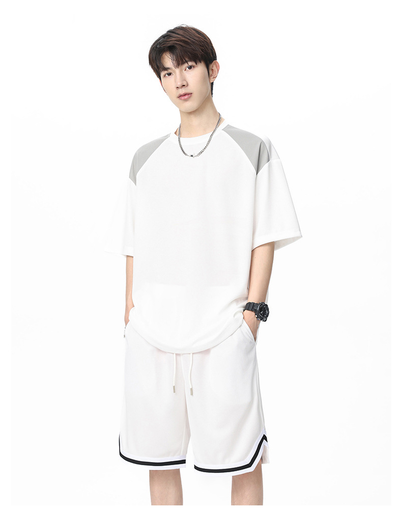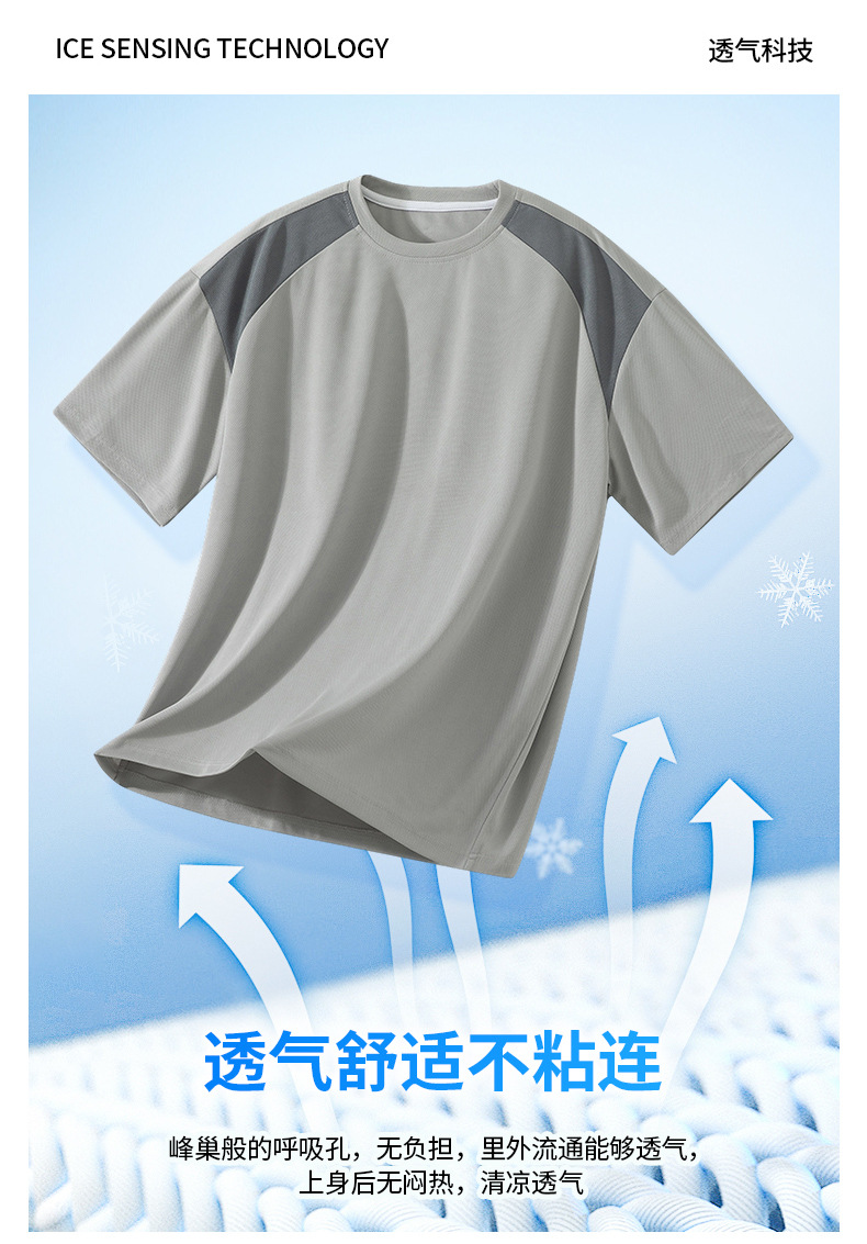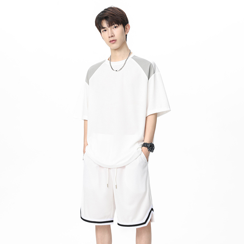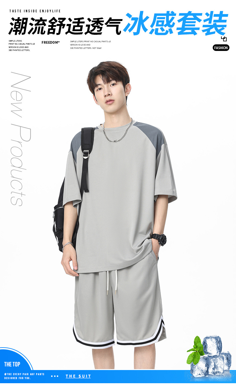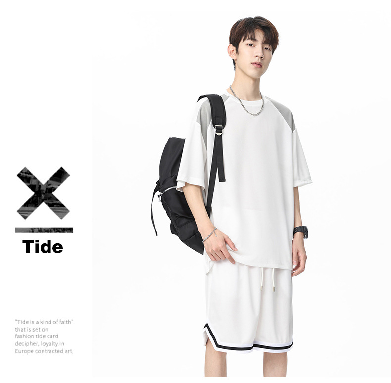아이스 실크 정장 남성용 아메리칸 콘트라스트 컬러 티셔츠 남성용 여름 2025 새로운 커플 착용 반팔 루즈한 옷