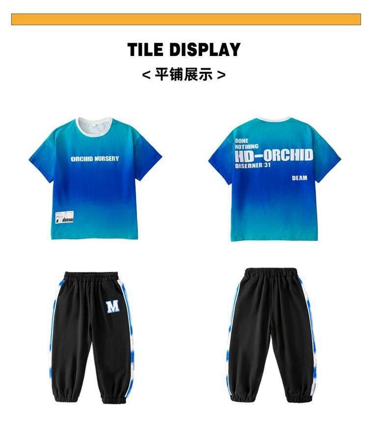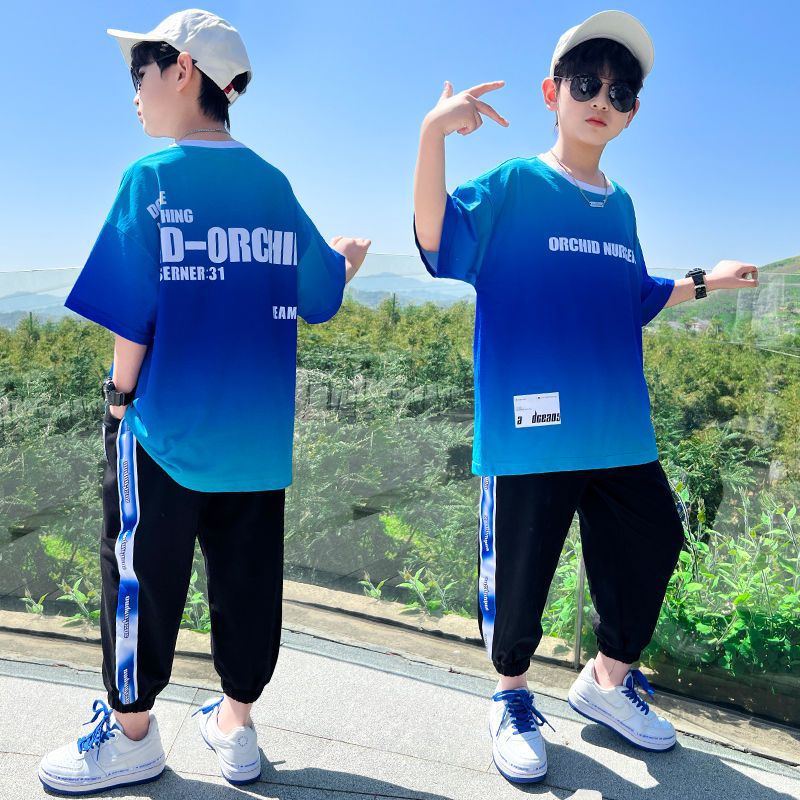 남아용 여름 한국식 반팔 그라데이션 슈트, 큰 남아용 시원하고 멋진 운동복, 레깅스, 투피스 트렌디 세트