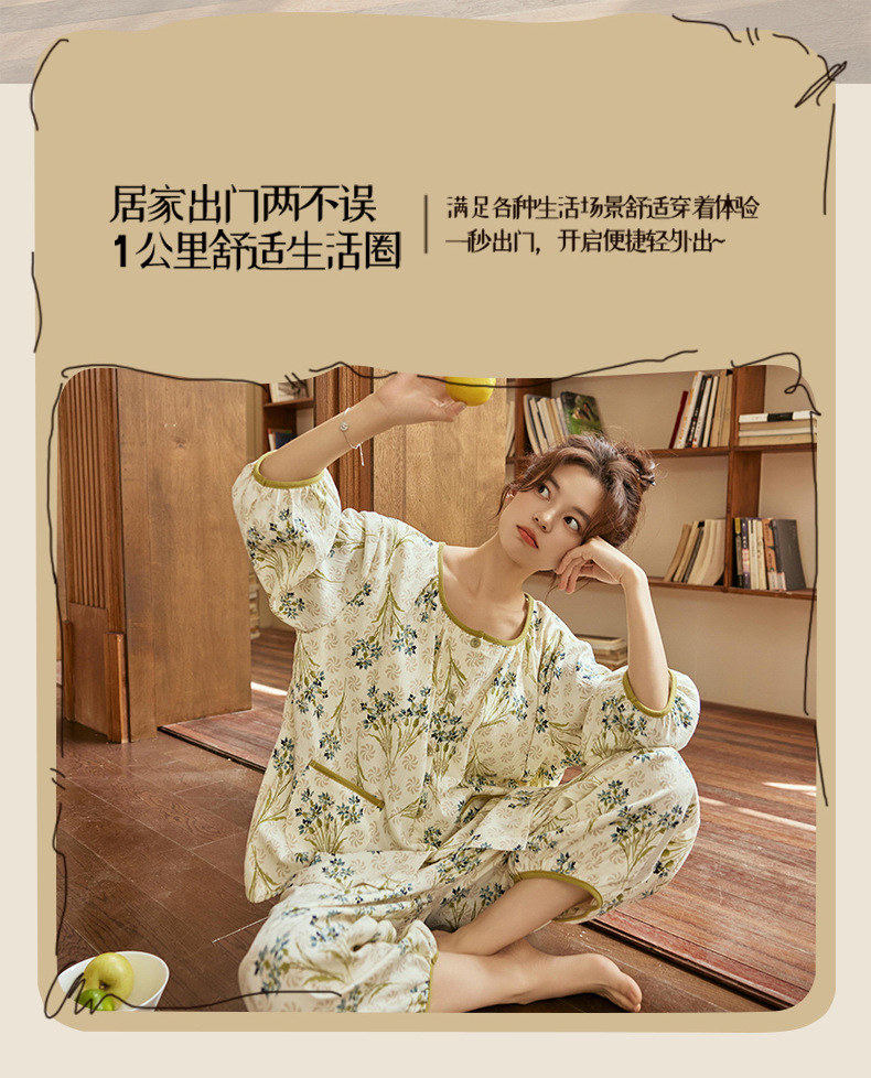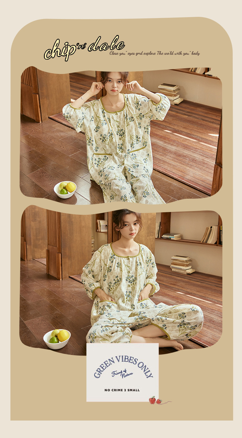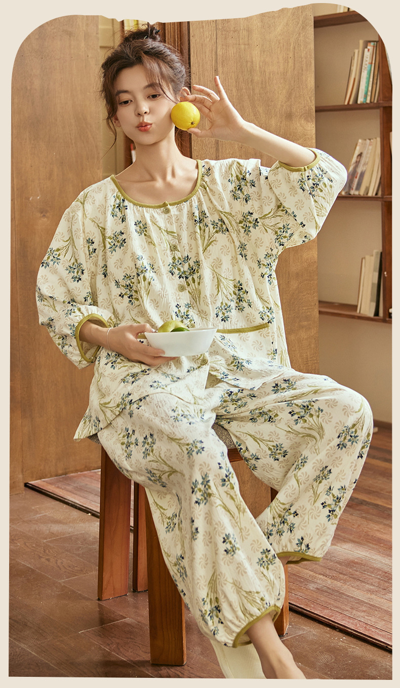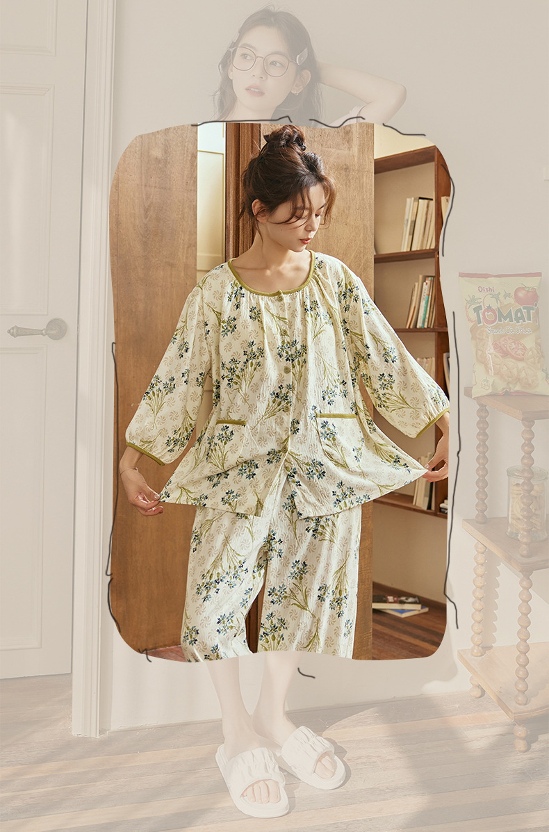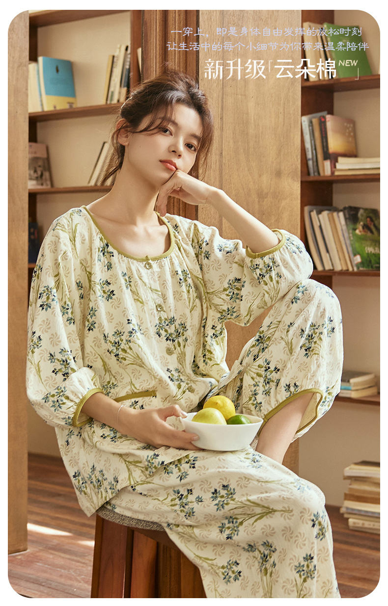 여름 여성을 위한 에어컨 룸 잠옷, 가슴 패드가 있는 7부 소매 클라우드 코튼 새로운 목가적 스타일 여성 홈웨어 세트스토어 가기
