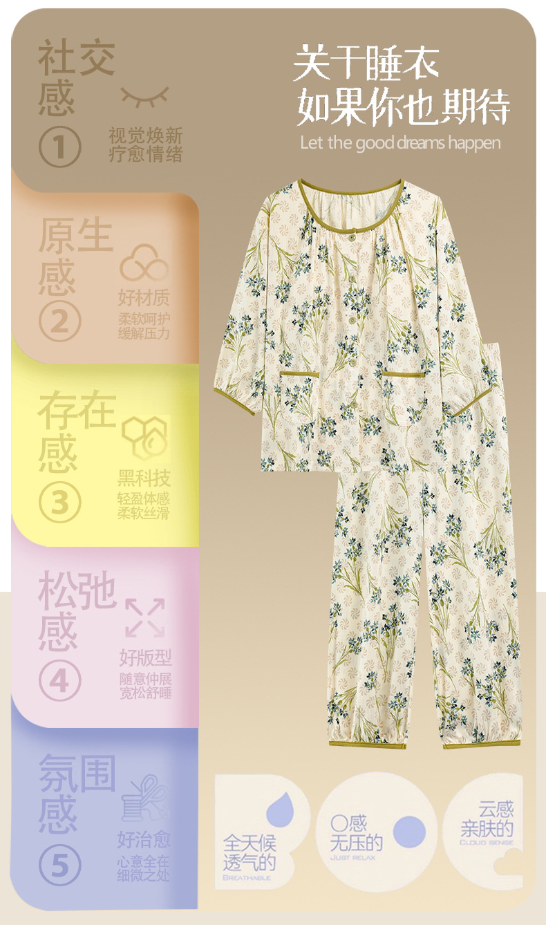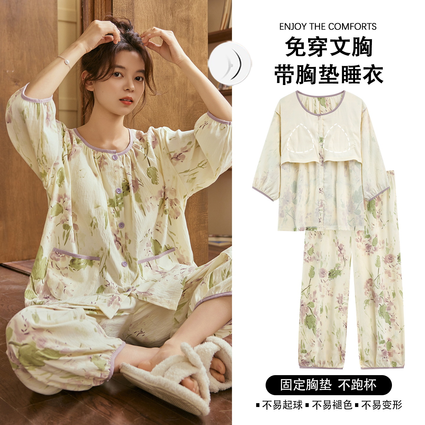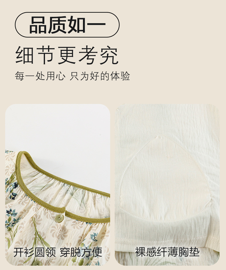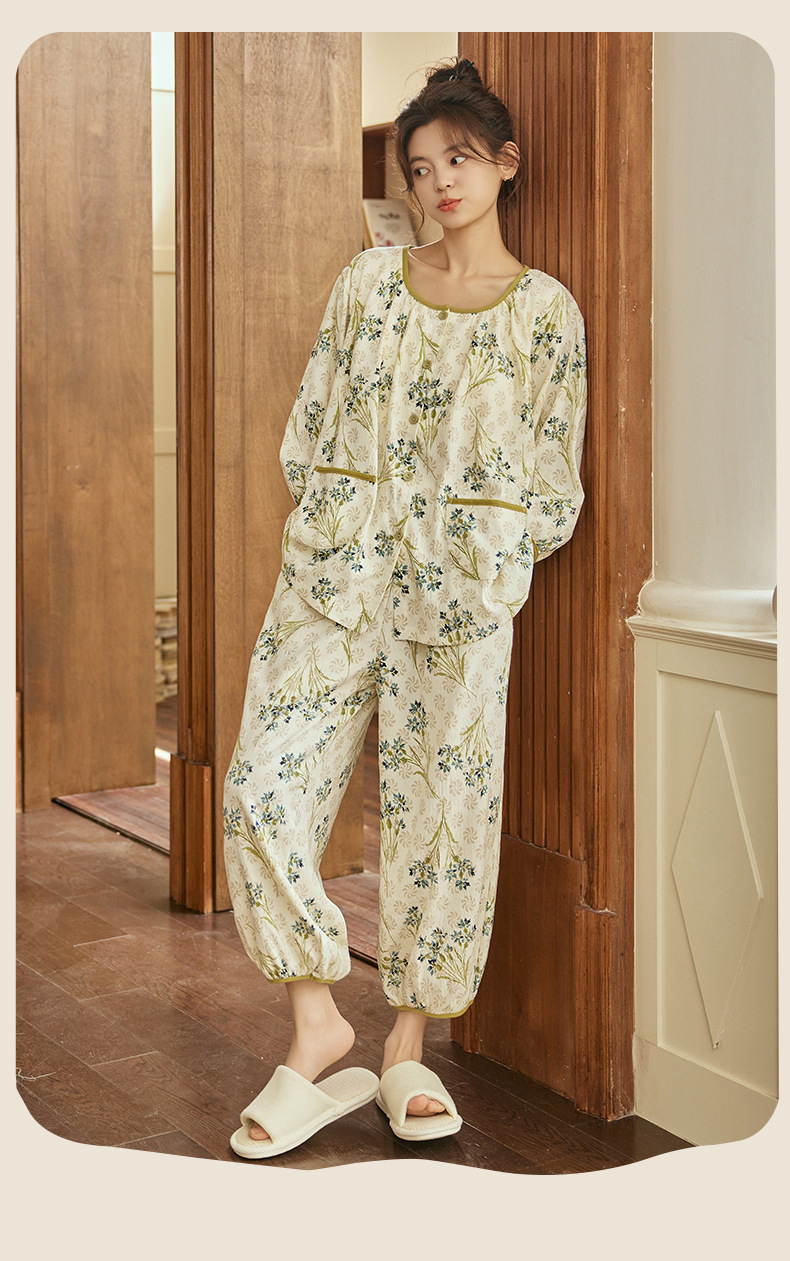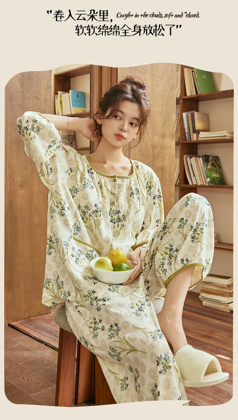 여름 여성을 위한 에어컨 룸 잠옷, 가슴 패드가 있는 7부 소매 클라우드 코튼 새로운 목가적 스타일 여성 홈웨어 세트스토어 가기