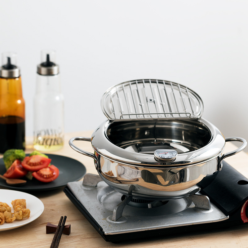 304 스테인레스 스틸 일본식 튀김 냄비 가정용 뚜껑 및 온도계 온도 조절 플립 커버로 오일 필터링 및 연료 절약 가능