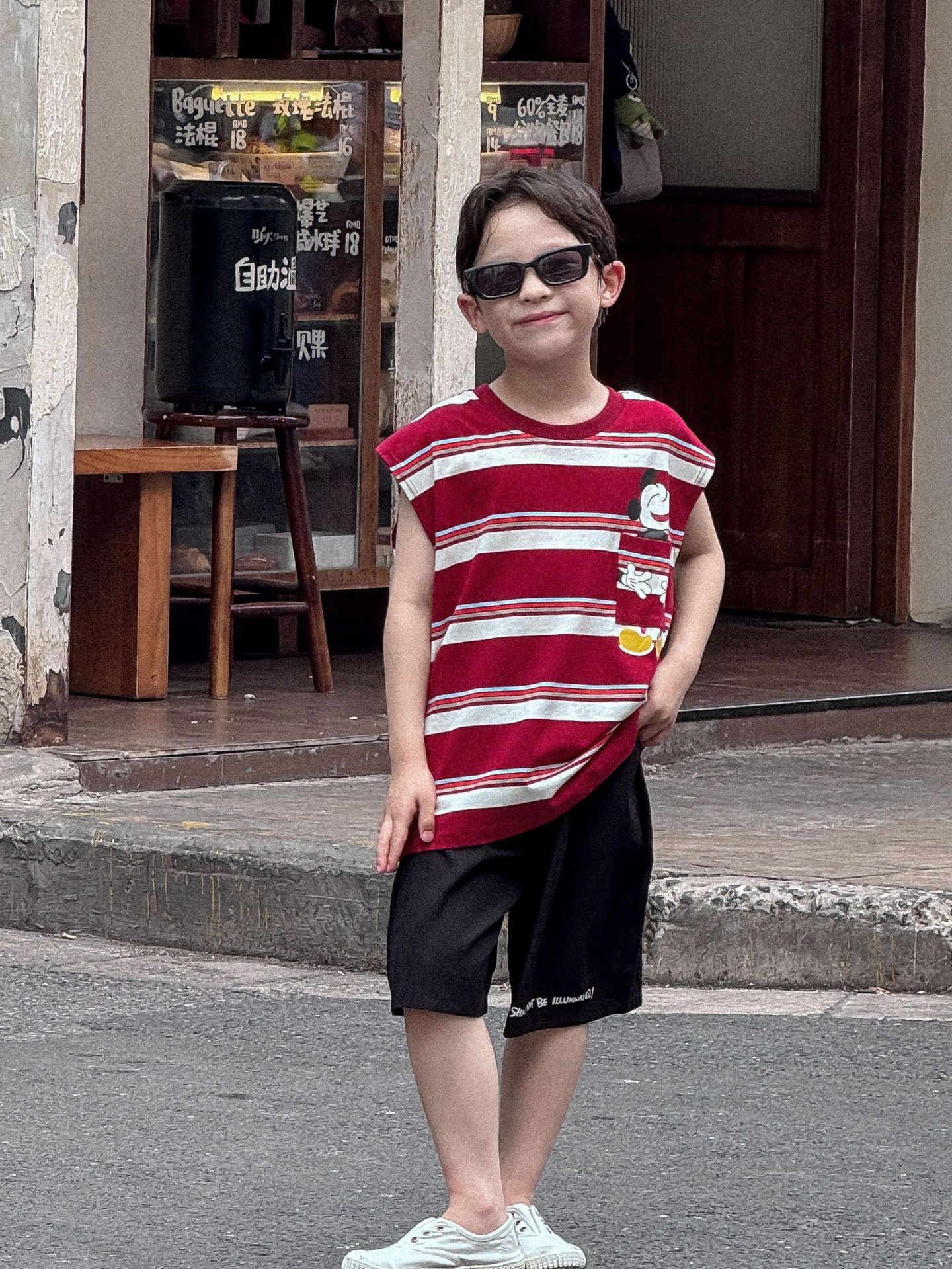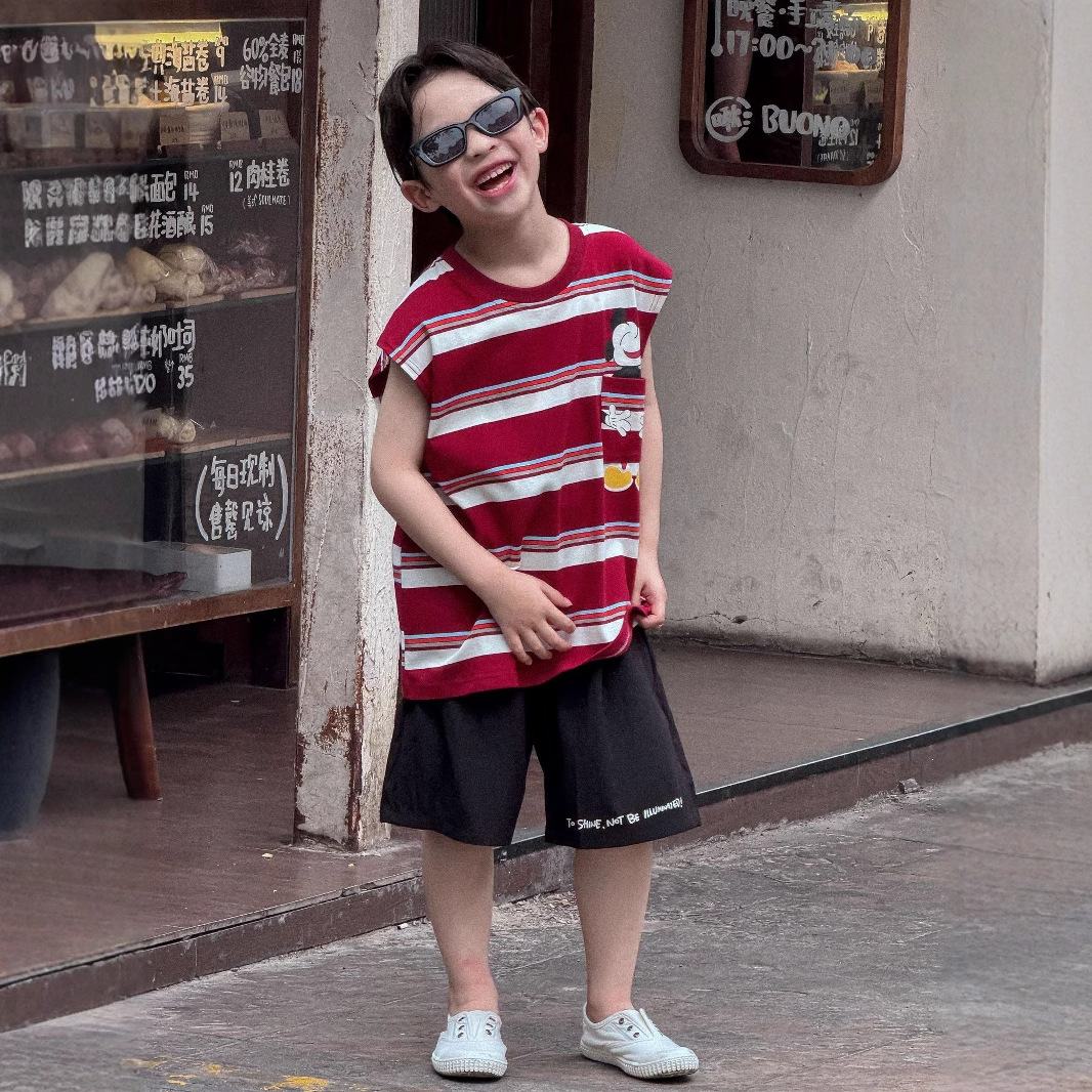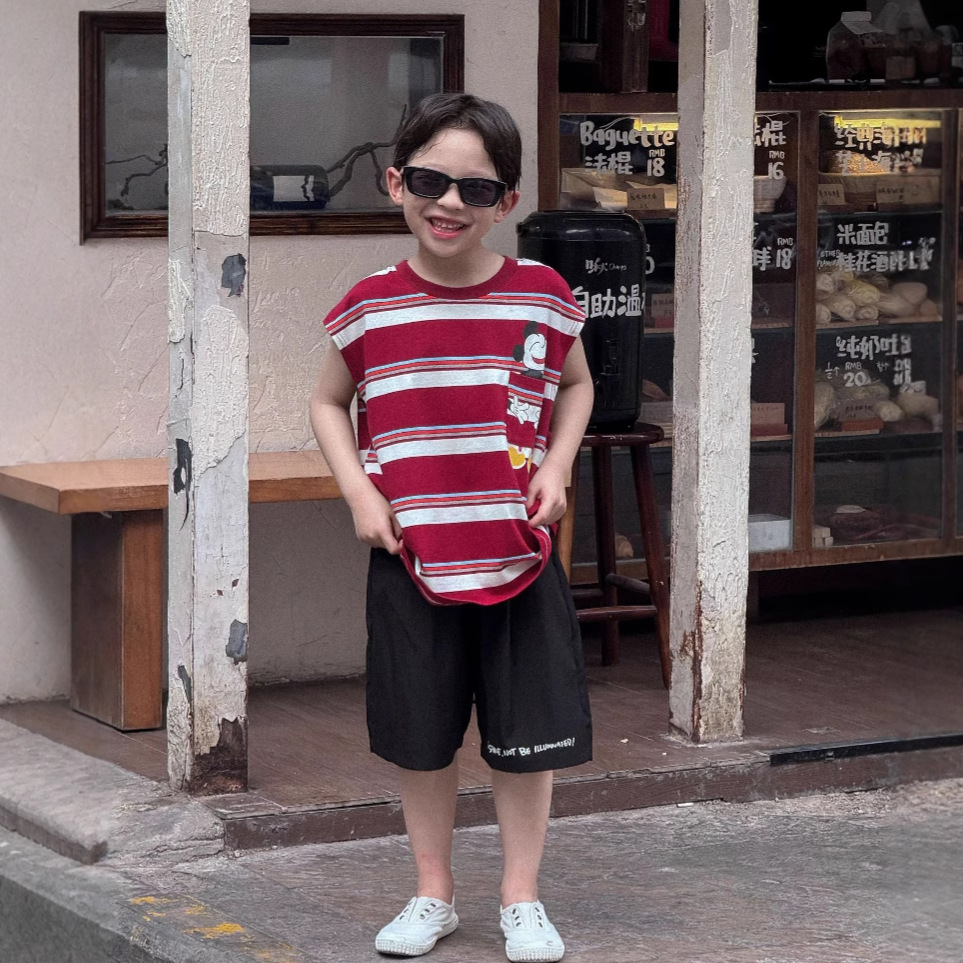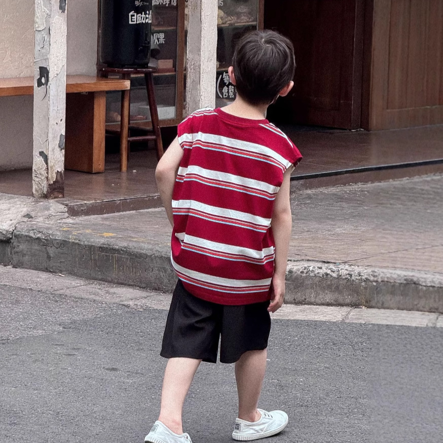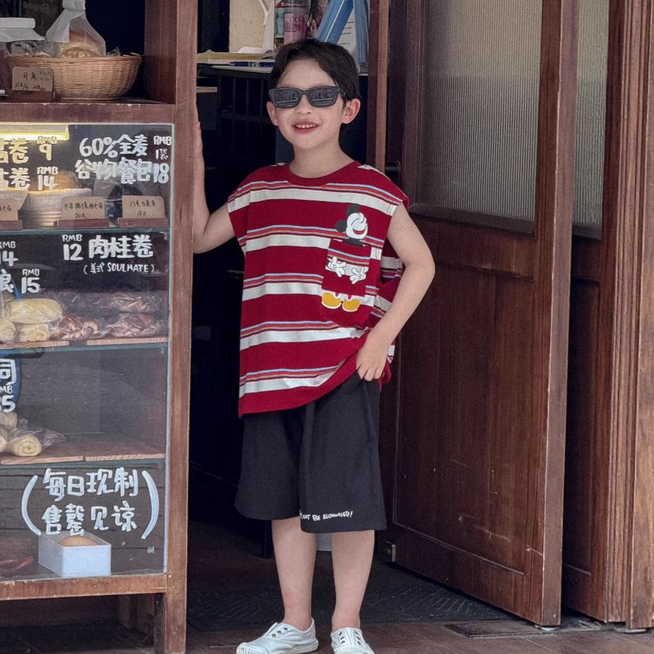 Lanyu 25 여름 한국 아동복 소년과 소녀를위한 빨간 줄무늬 만화 프린트 포켓 민소매 조끼 탑스토어 가기