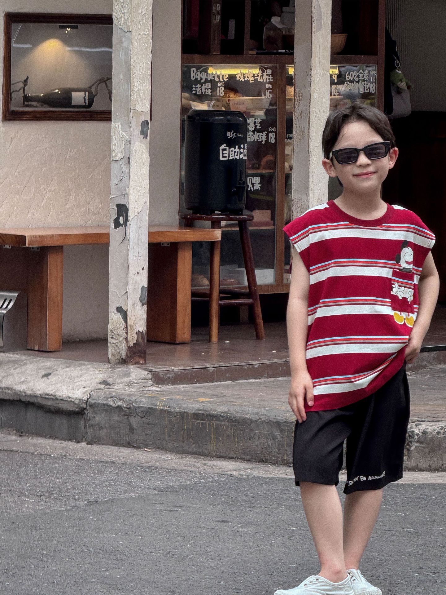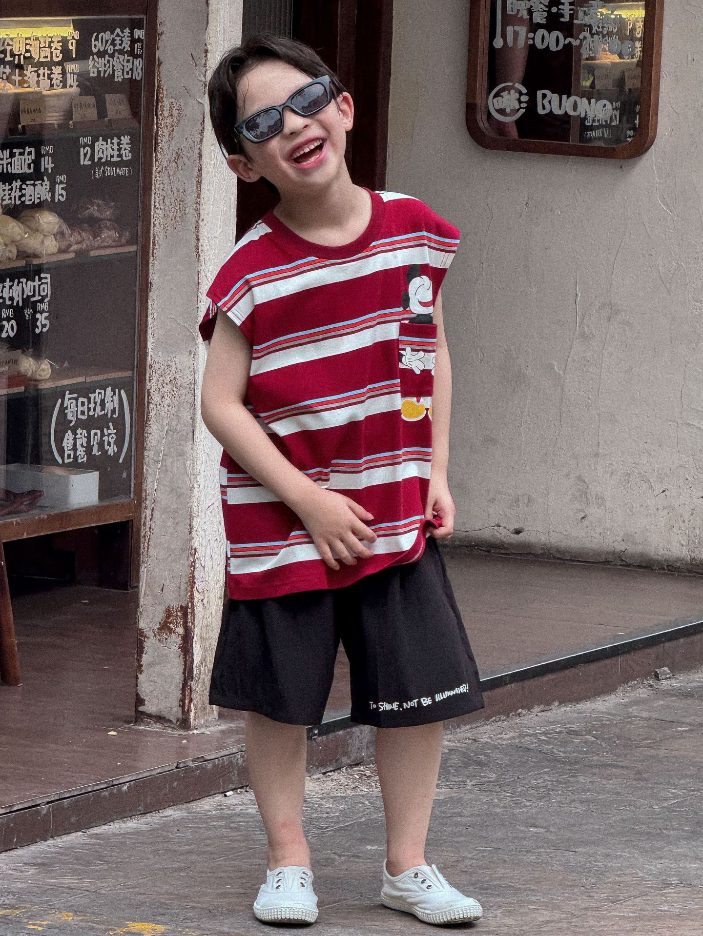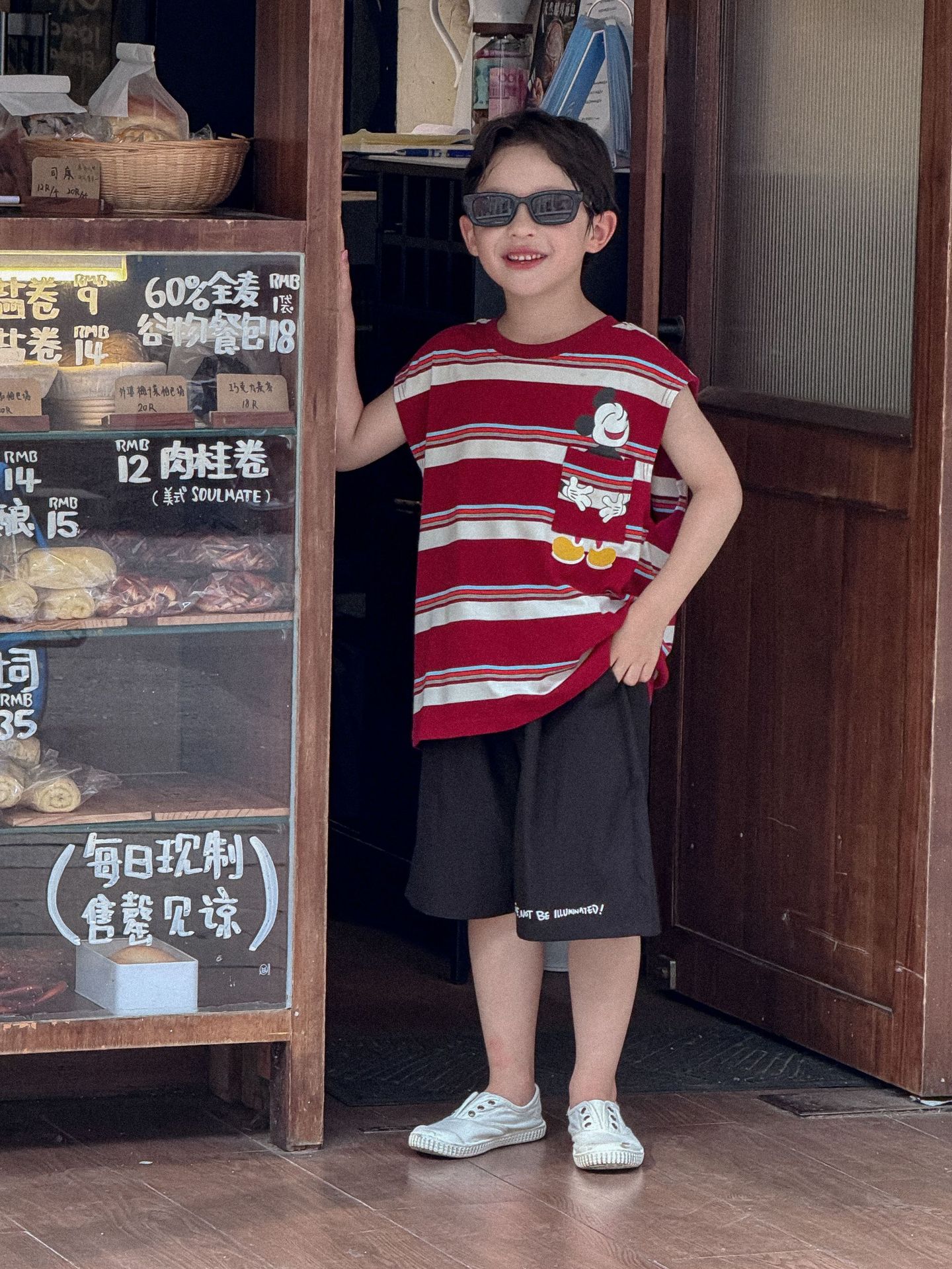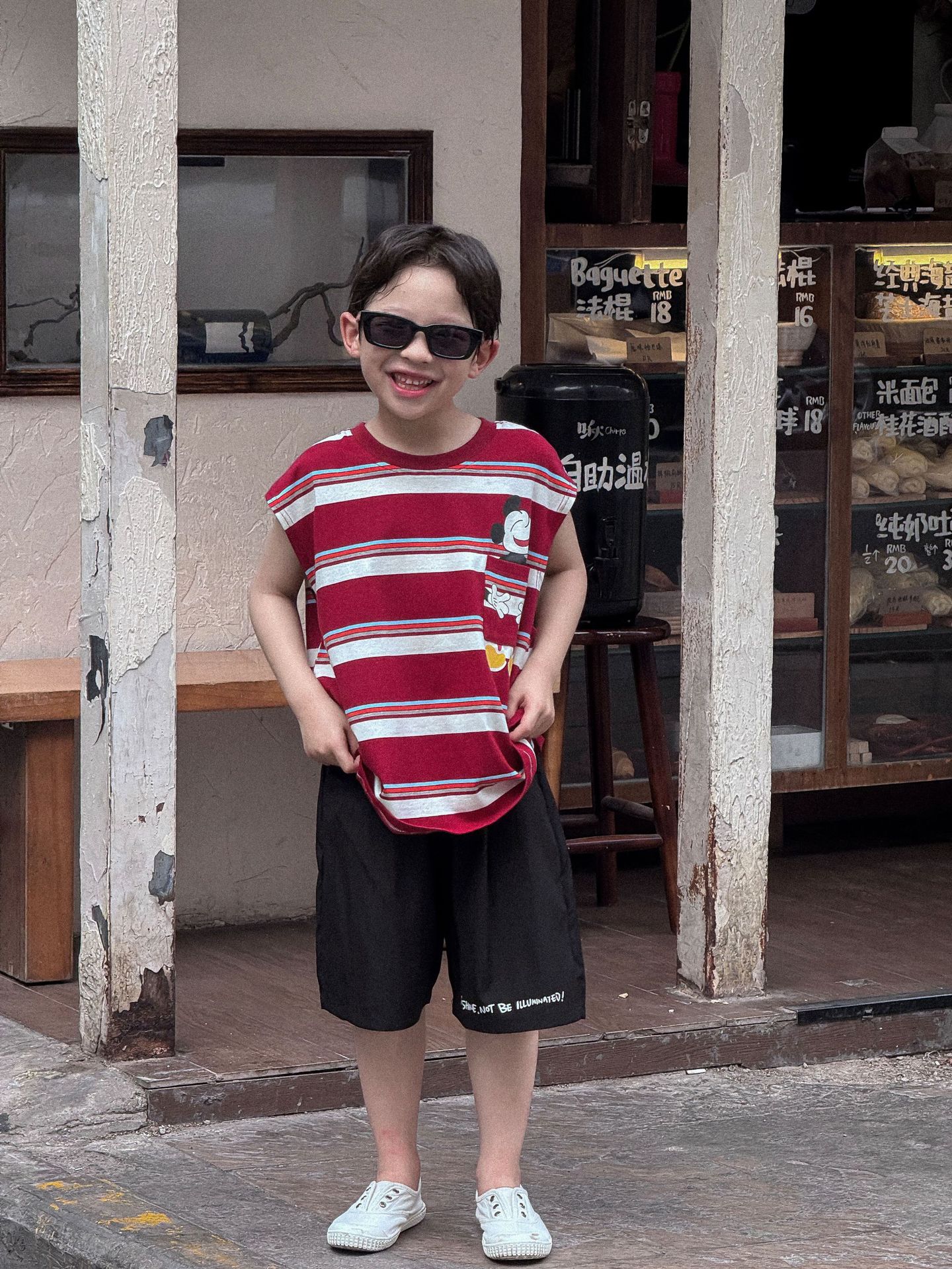 Lanyu 25 여름 한국 아동복 소년과 소녀를위한 빨간 줄무늬 만화 프린트 포켓 민소매 조끼 탑스토어 가기