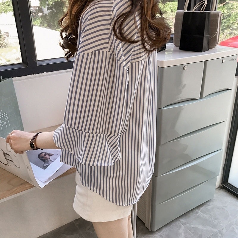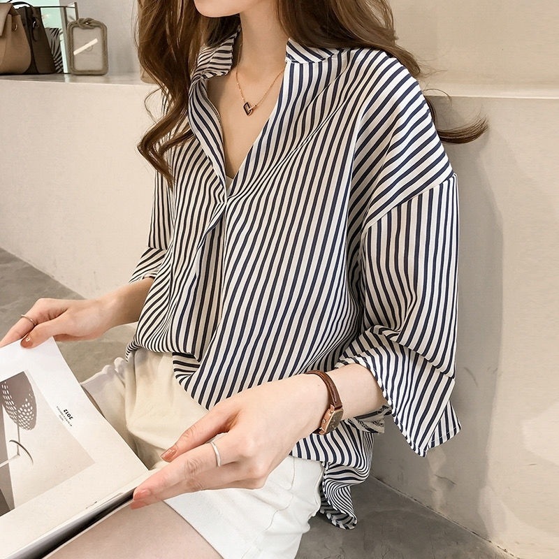 레트로 홍콩 스타일 스트라이프 패션 부드러운 스타일 쉬폰 셔츠 여성 디자인 틈새 반팔 탑 여름 가볍고 성숙한 프랑스 스타일