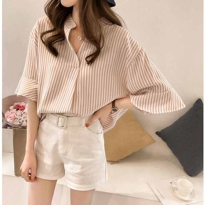 레트로 홍콩 스타일 스트라이프 패션 부드러운 스타일 쉬폰 셔츠 여성 디자인 틈새 반팔 탑 여름 가볍고 성숙한 프랑스 스타일스토어 가기