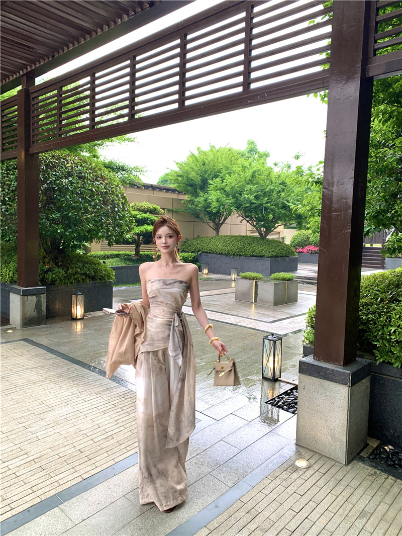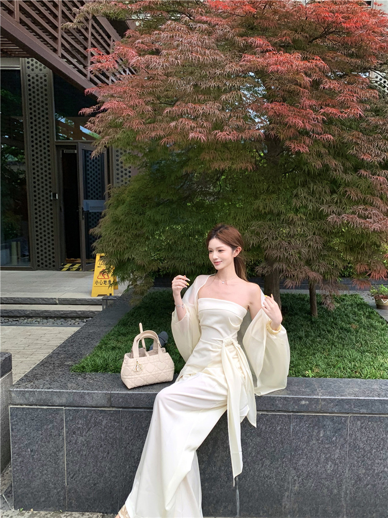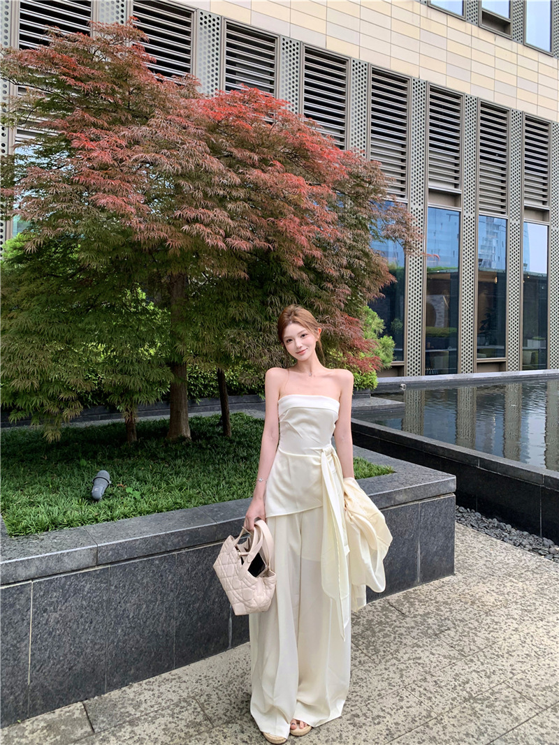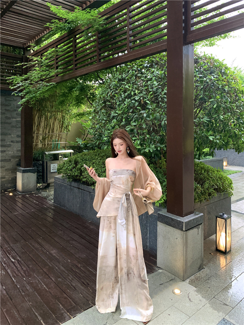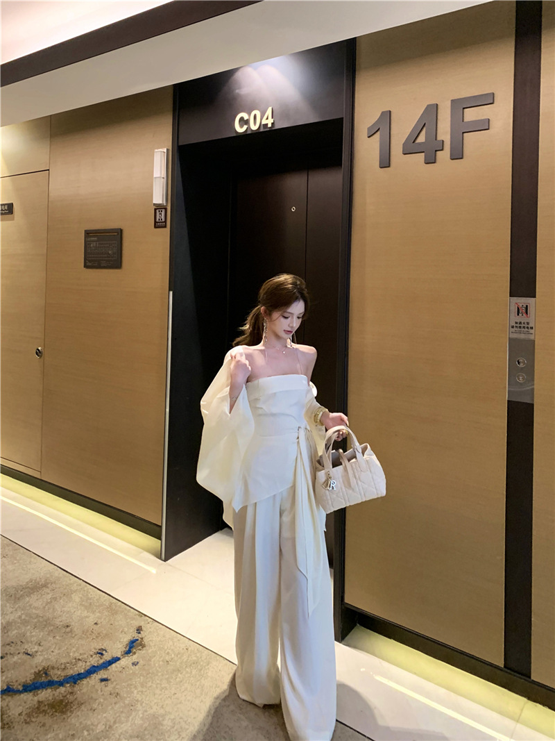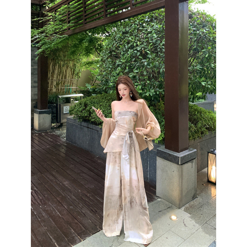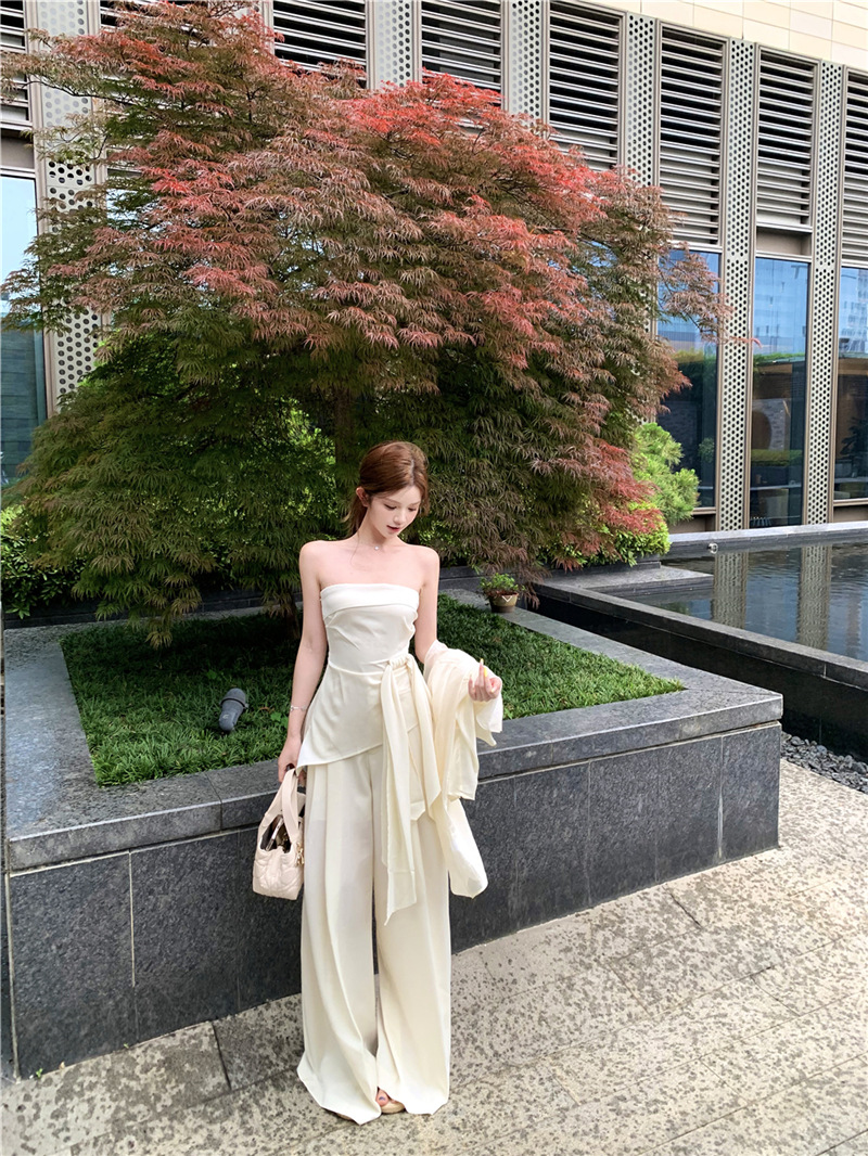 원 숄더 튜브 탑 + 하이 웨이스트 스트레이트 캐주얼 바지 + 여성용 다용도 자외선 차단 카디건 패션 슈트