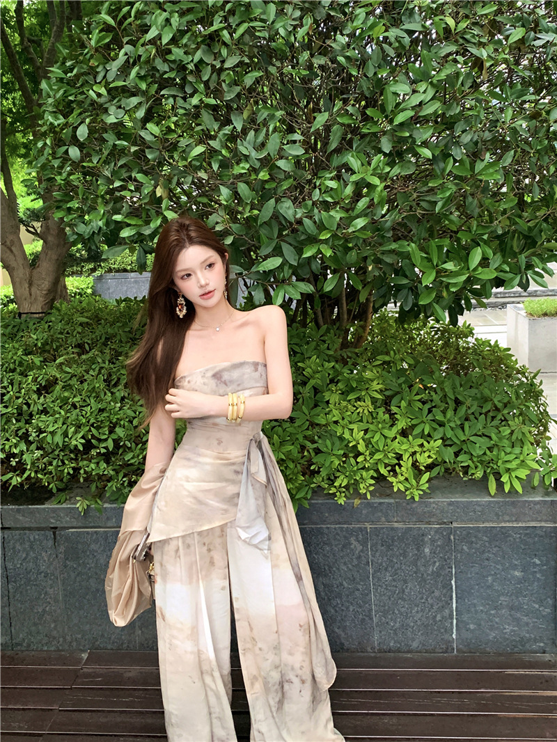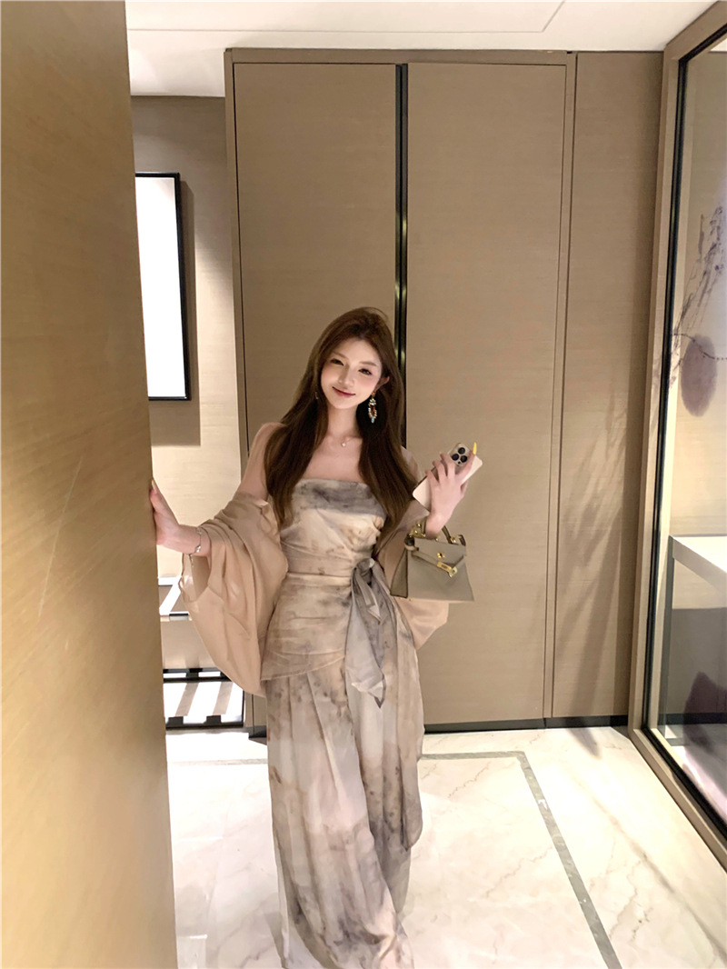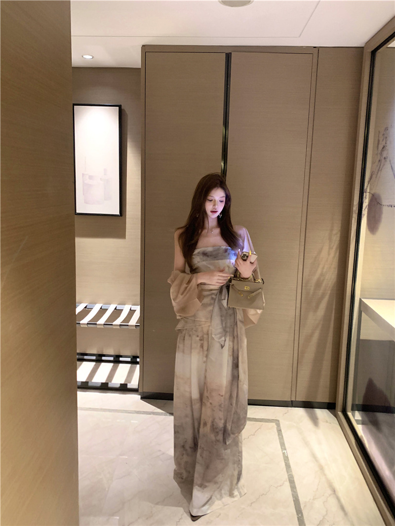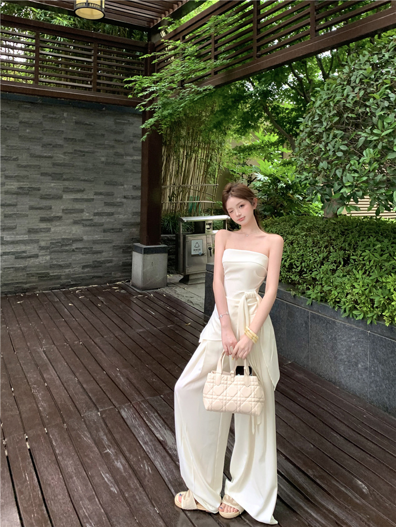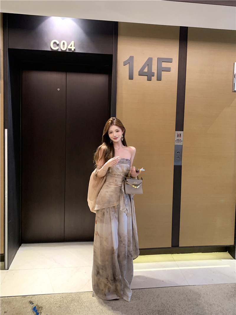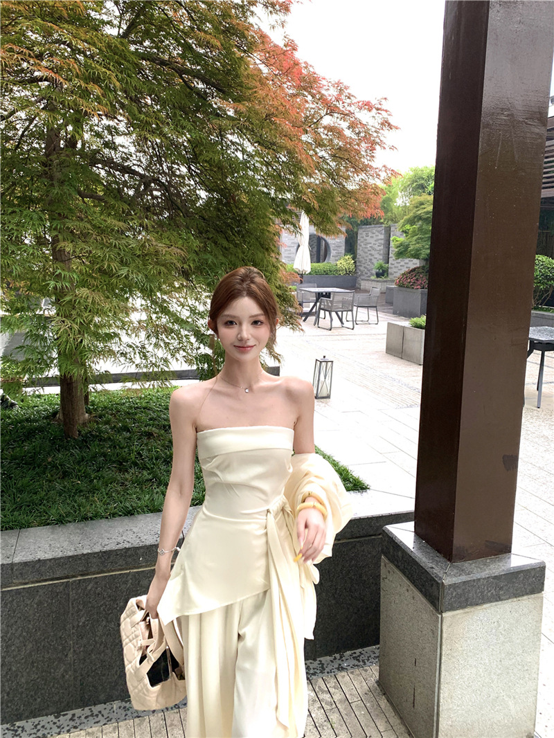원 숄더 튜브 탑 + 하이 웨이스트 스트레이트 캐주얼 바지 + 여성용 다용도 자외선 차단 카디건 패션 슈트