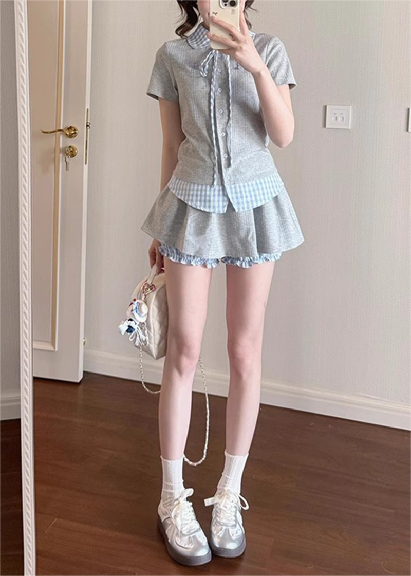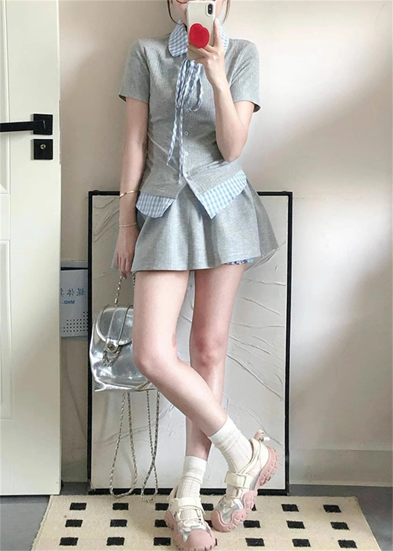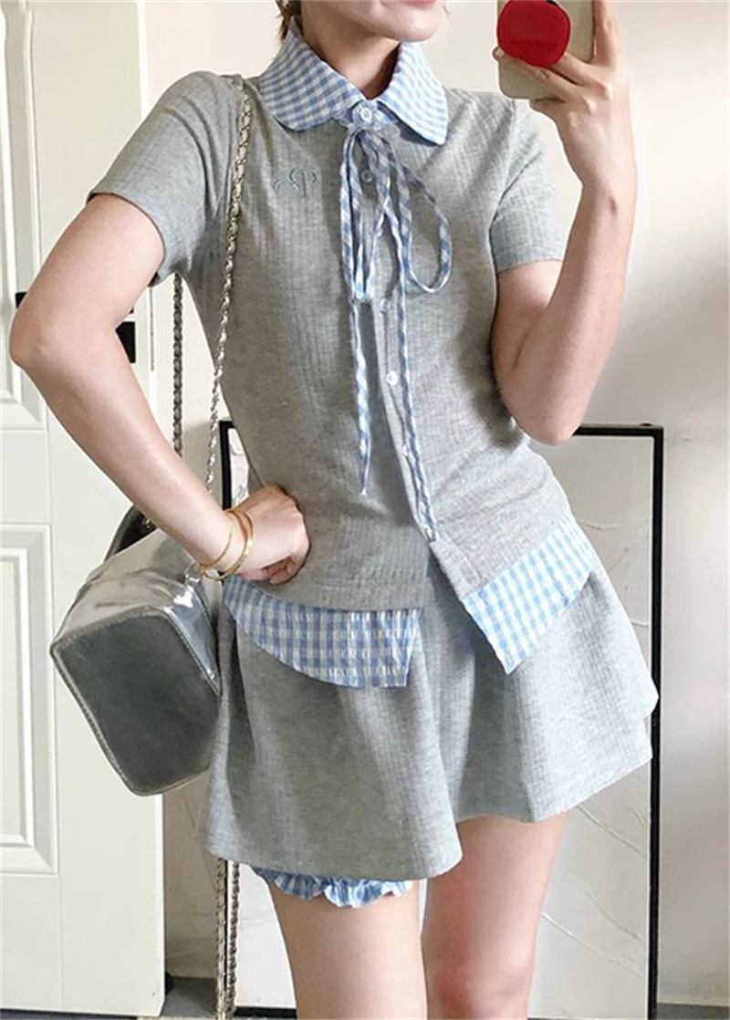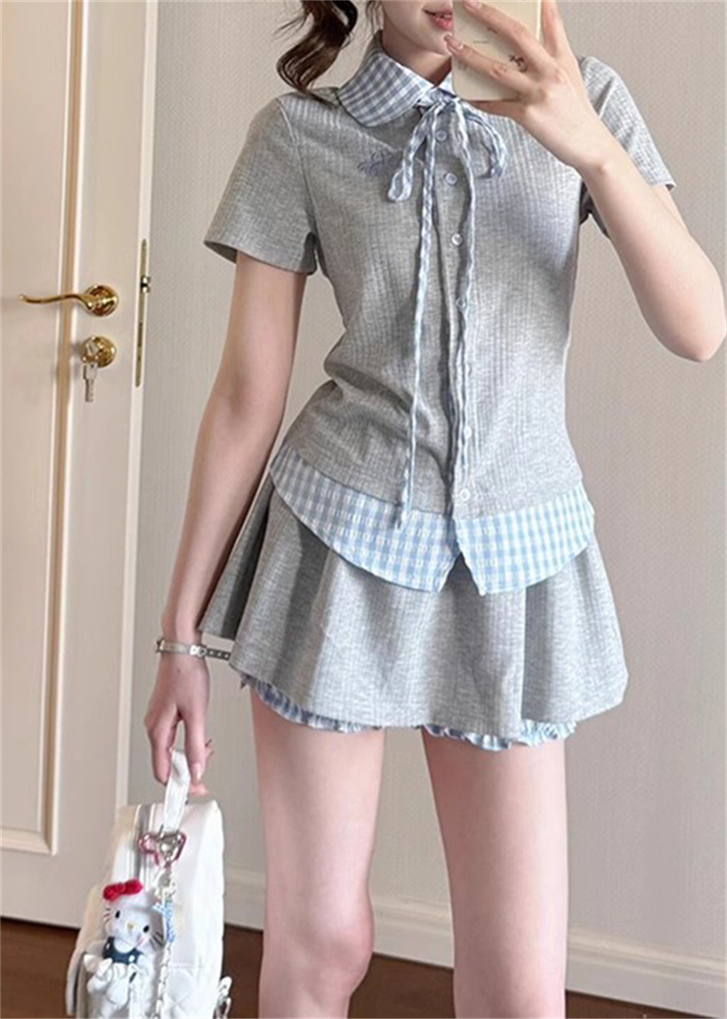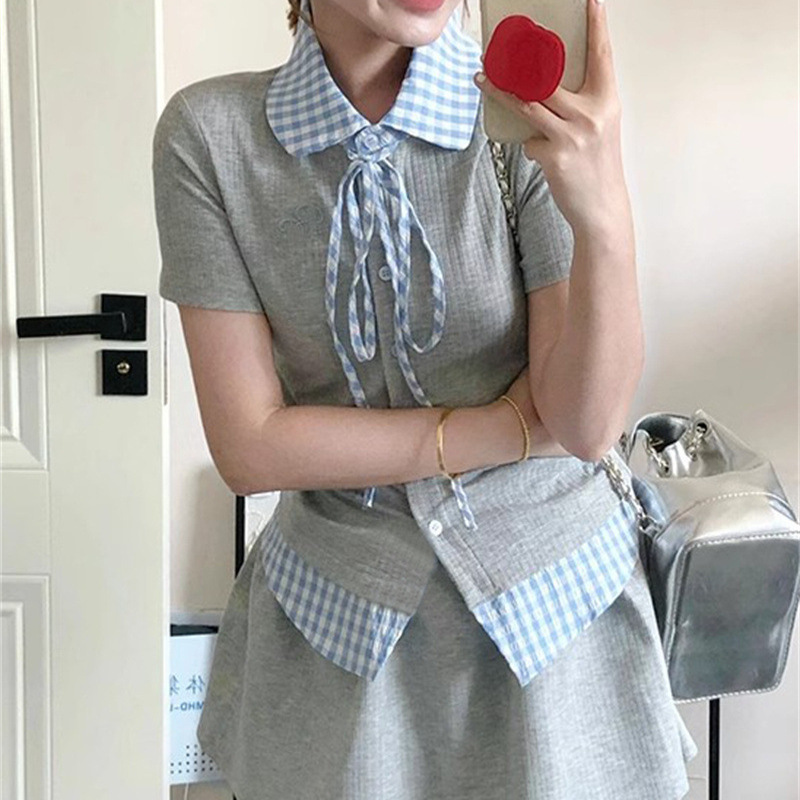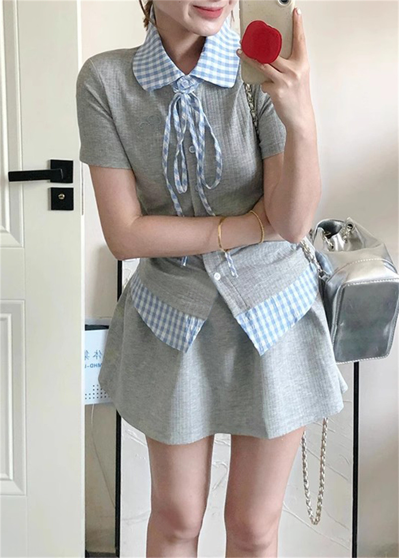 작은 여성을 위한 여름 새로운 달콤한 대학 스타일 스플 라이스 격자 무늬 가짜 투피스 반팔 셔츠 스커트 슈트