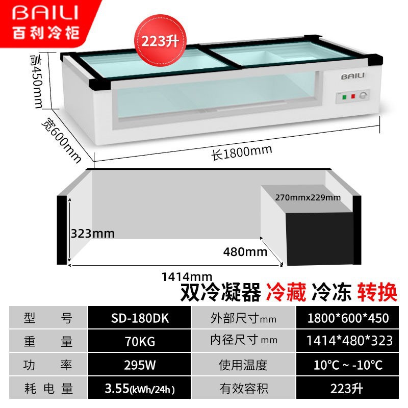 • 1.8m창형 + 3색조명 + 냉장 및 냉동 (길이 1800*가로 700*높이 350mm)