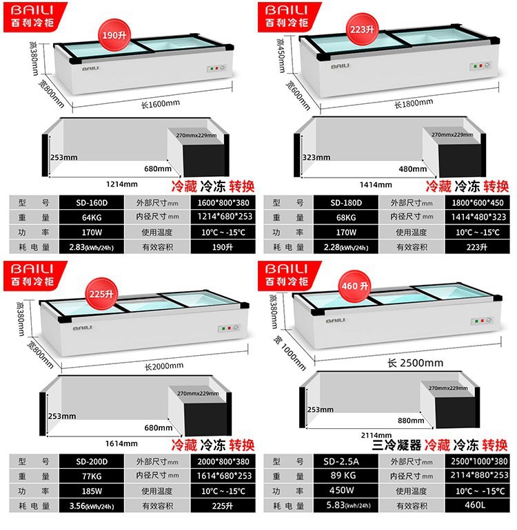 • 2.0m창형 + 3색조명 + 냉장 및 냉동 (길이 2000*가로 800*높이 380mm)