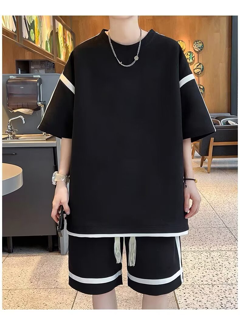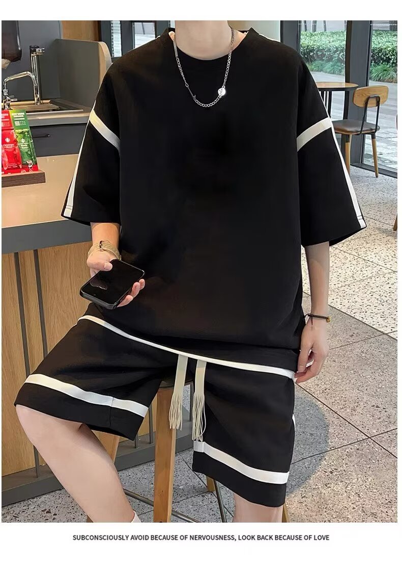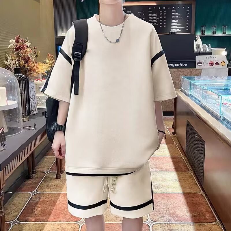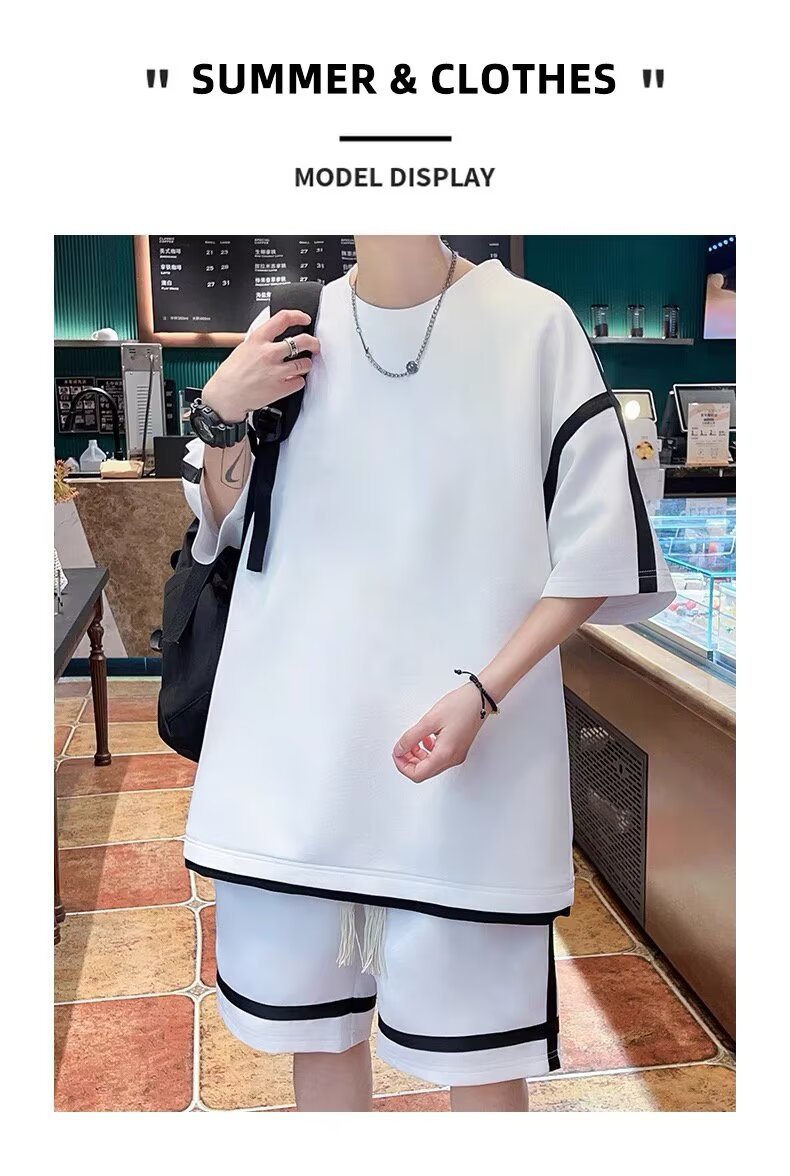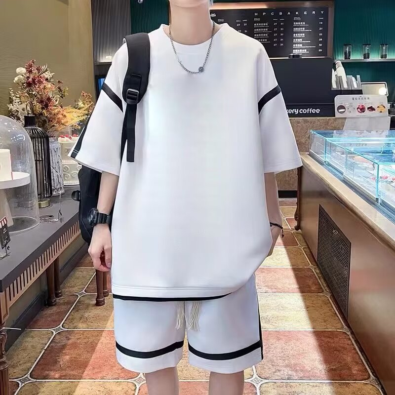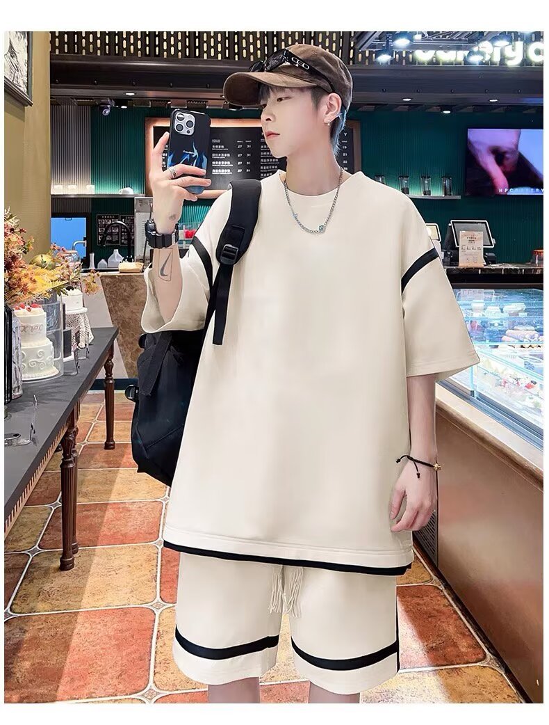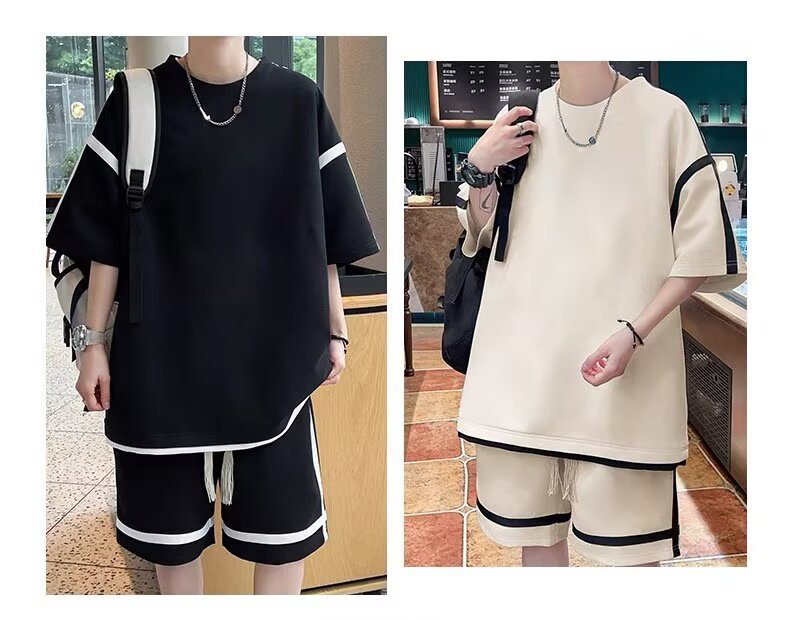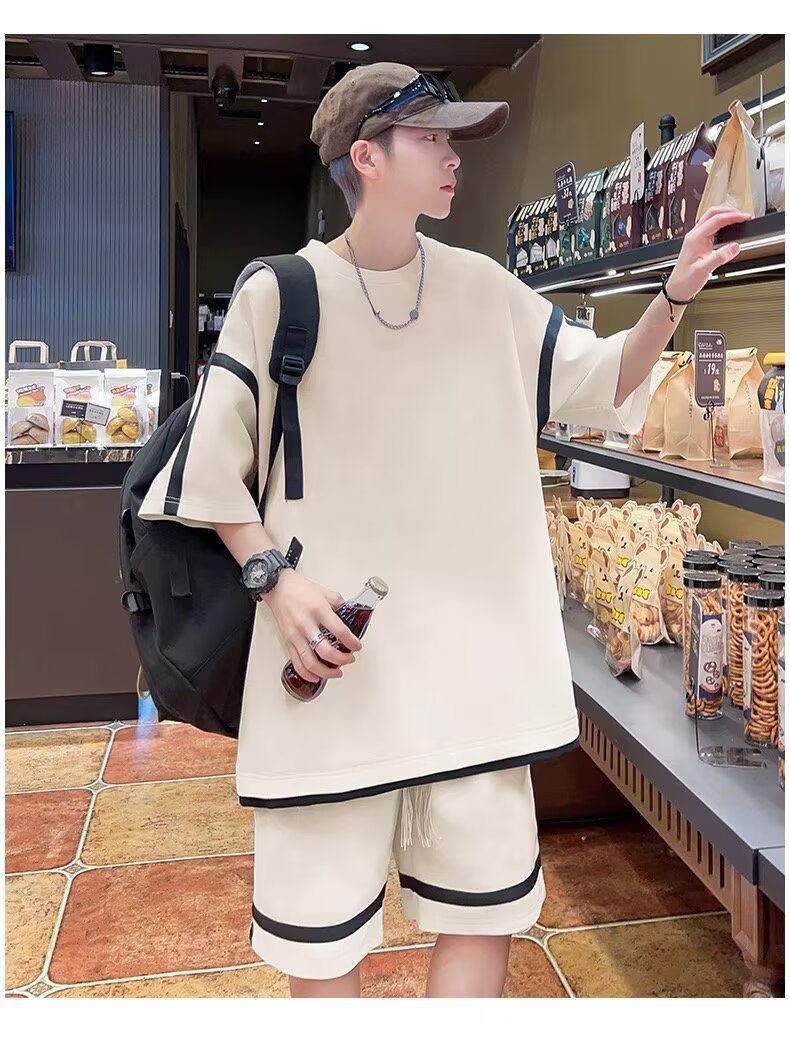 재고 도매 홍콩 스타일 남성 여름 세트 청소년 레저 루즈 티셔츠 패션 브랜드 레저 스포츠 여름 세트