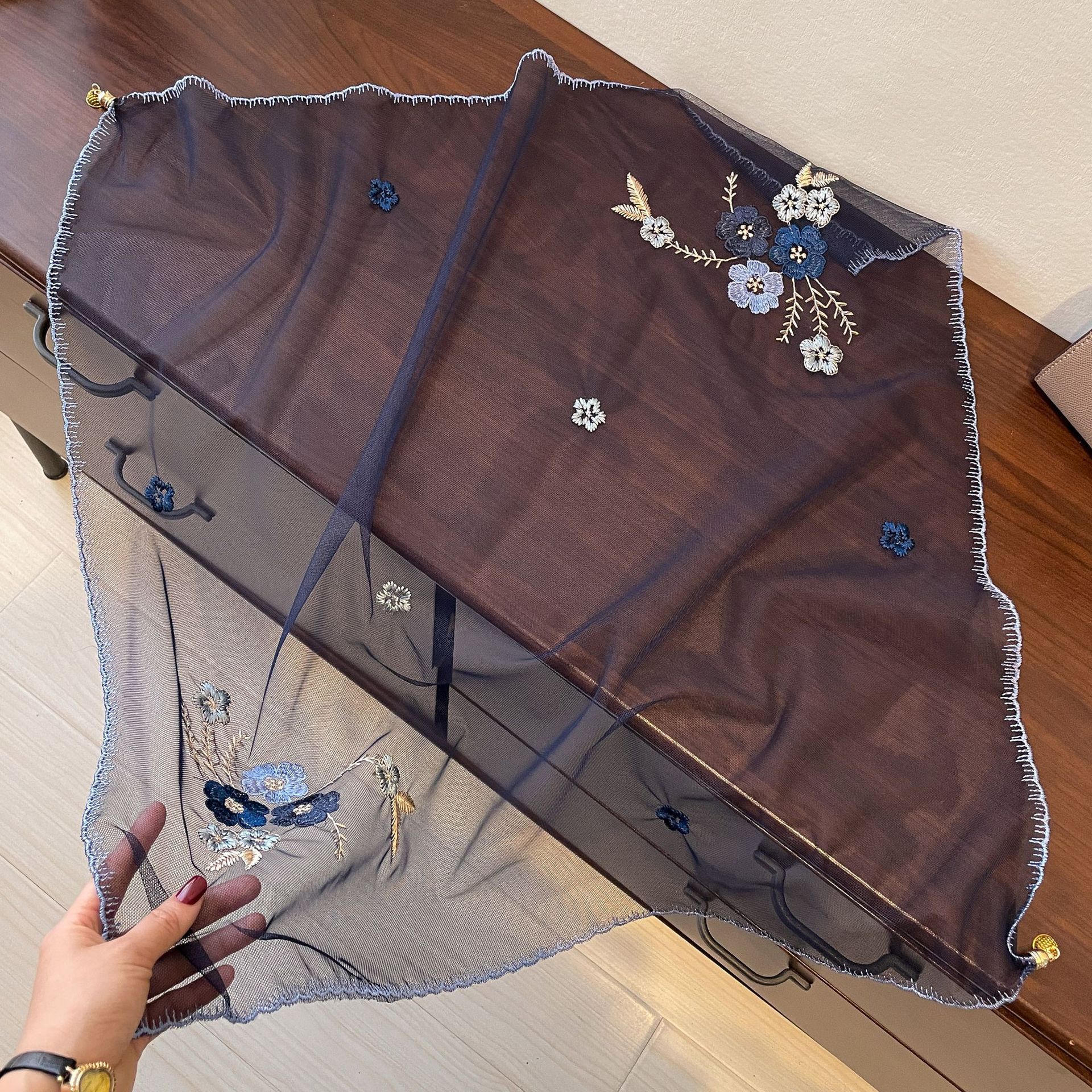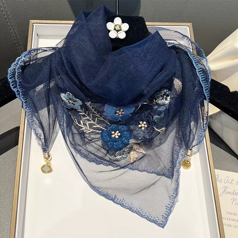 • 파란색 비즈 자수 실크 스카프