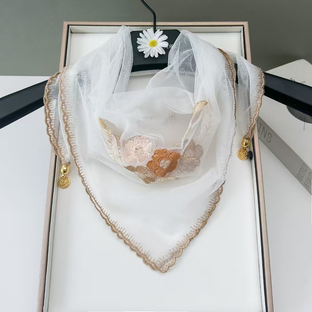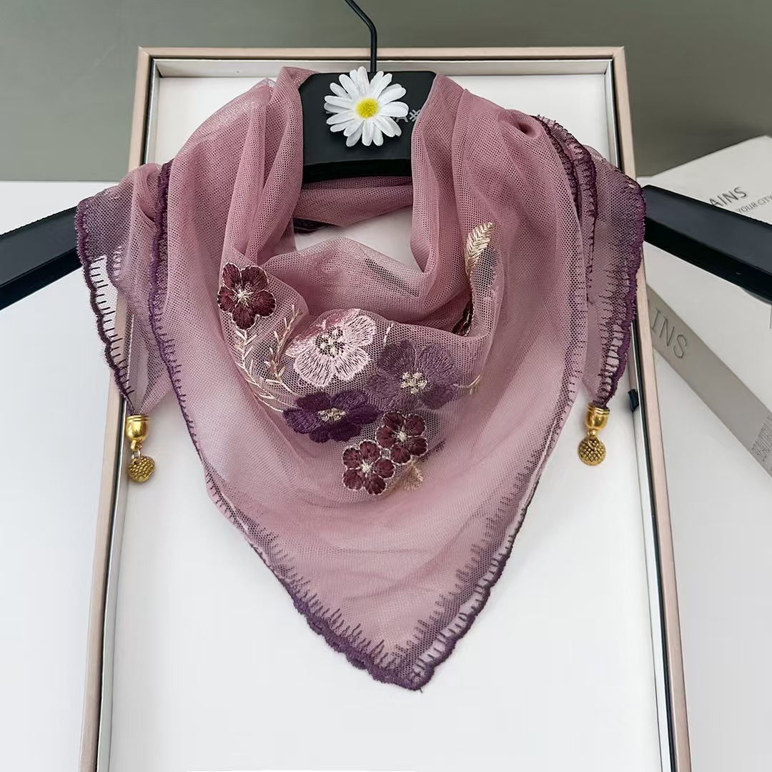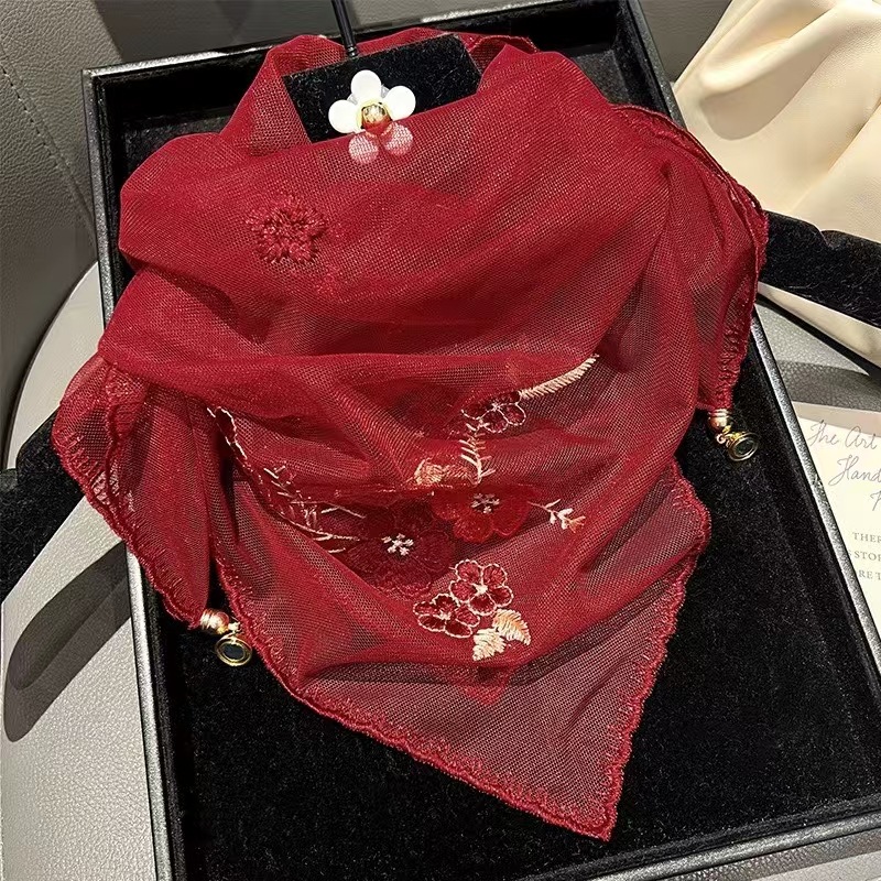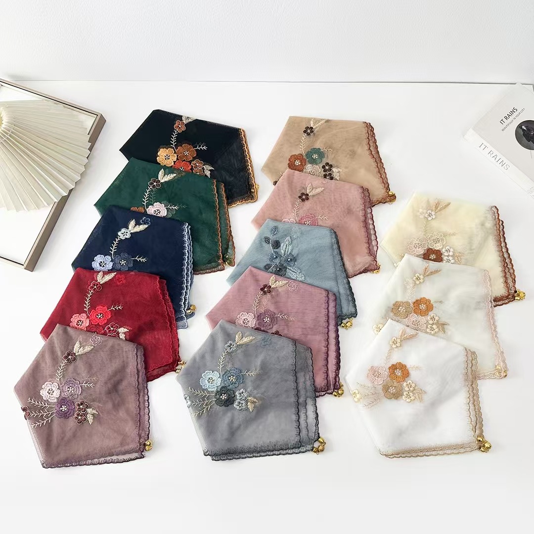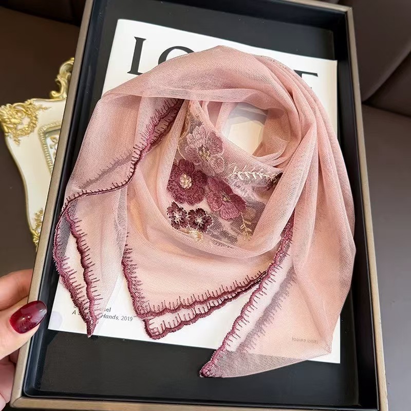 새로운 모조 실크 베고니아 꽃 자수 구슬 실크 스카프 봄과 여름 분위기 레이스 작은 레이스 다용도 스퀘어 스카프