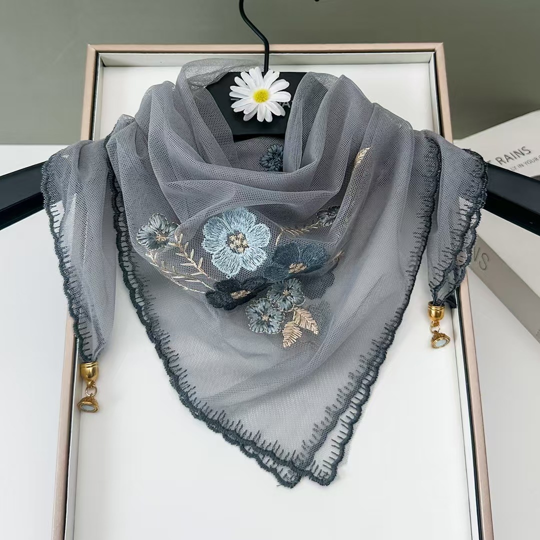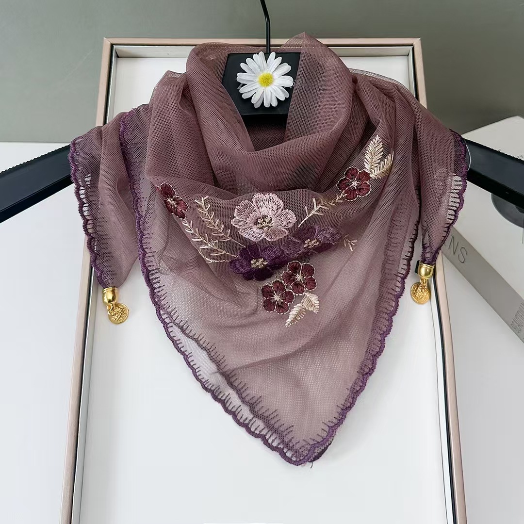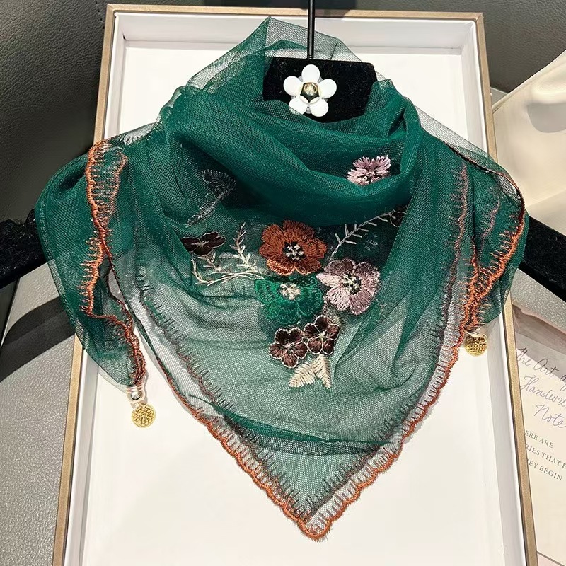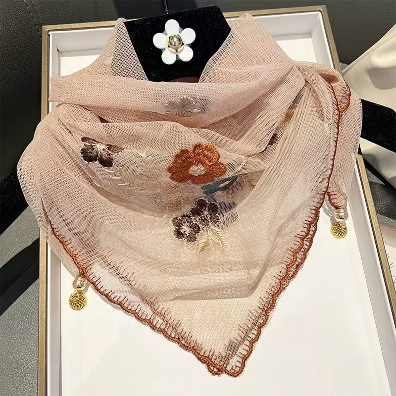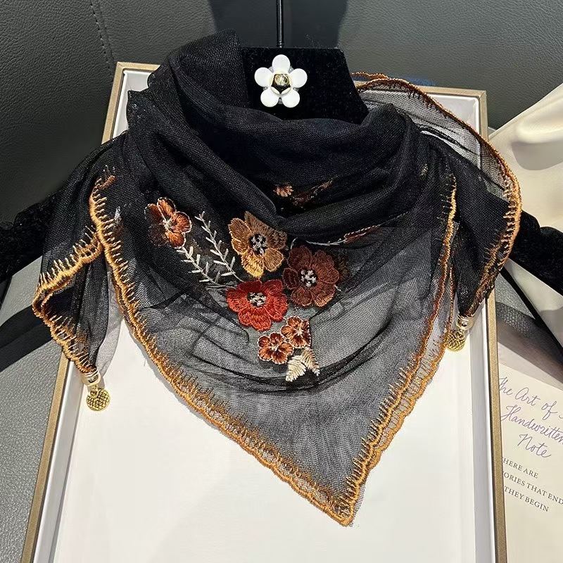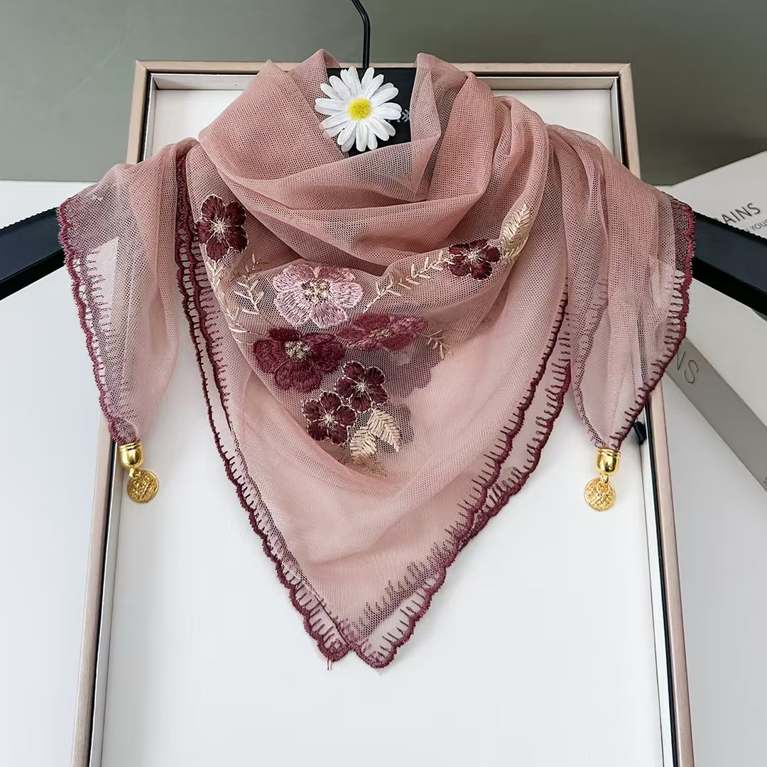 새로운 모조 실크 베고니아 꽃 자수 구슬 실크 스카프 봄과 여름 분위기 레이스 작은 레이스 다용도 스퀘어 스카프
