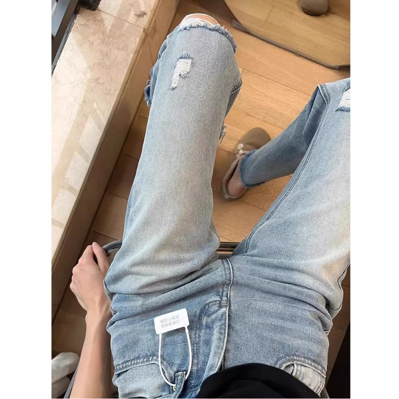 여성을위한 레트로 워시 찢어진 로우 엣지 부츠 컷 청바지 2025 여름 하이 웨이스트 슬림 피트 바닥 길이 플레어 바지스토어 가기