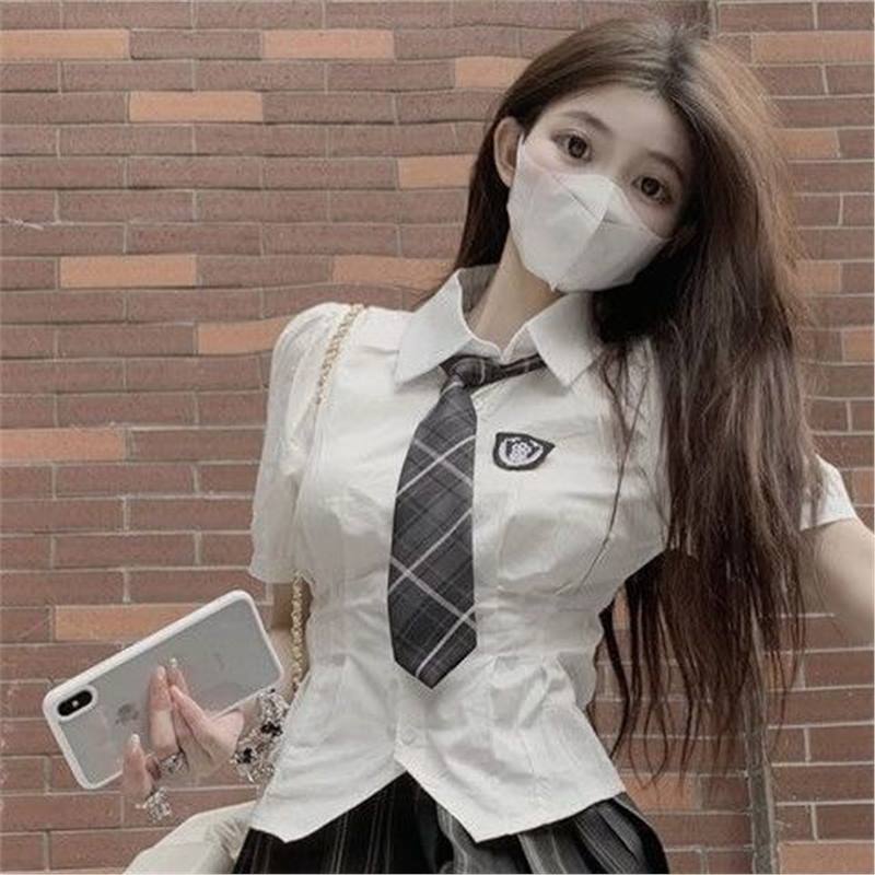 달콤하고 매운 스트리트 컬리지 스타일 jk 유니폼 여성 정장 여름 허리 셔츠 한국 유니폼 격자 무늬 스커트 투피스 세트