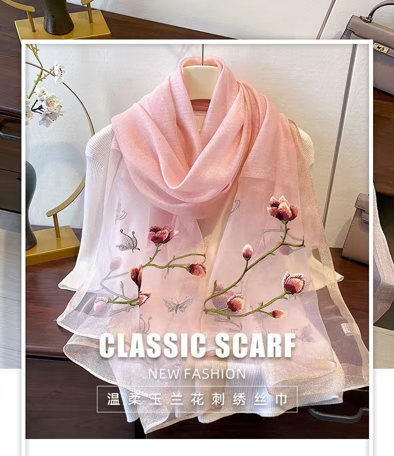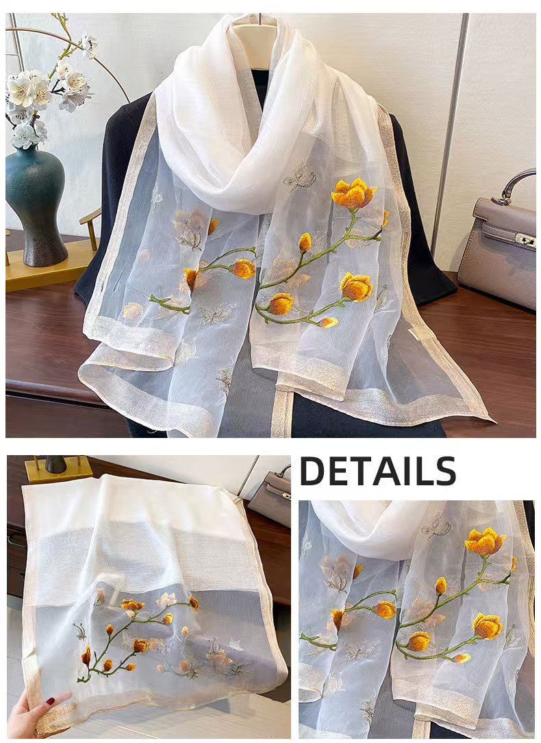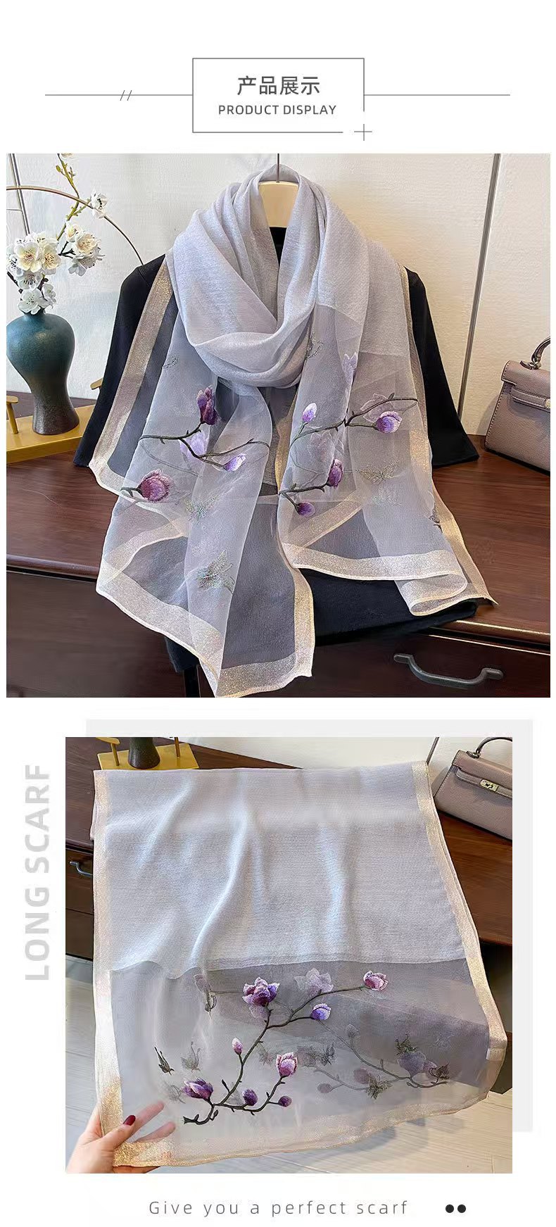 봄 신작 실크 울 스카프 여성 목련 꽃 다목적 뷰티 숄 복고풍 부드러운 자수 꽃 거즈 스카프