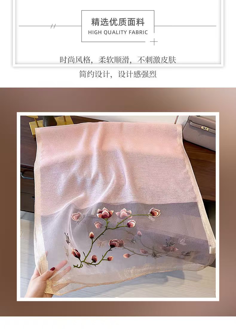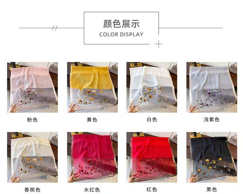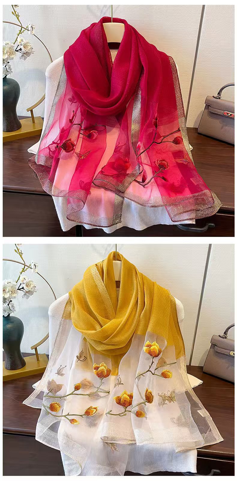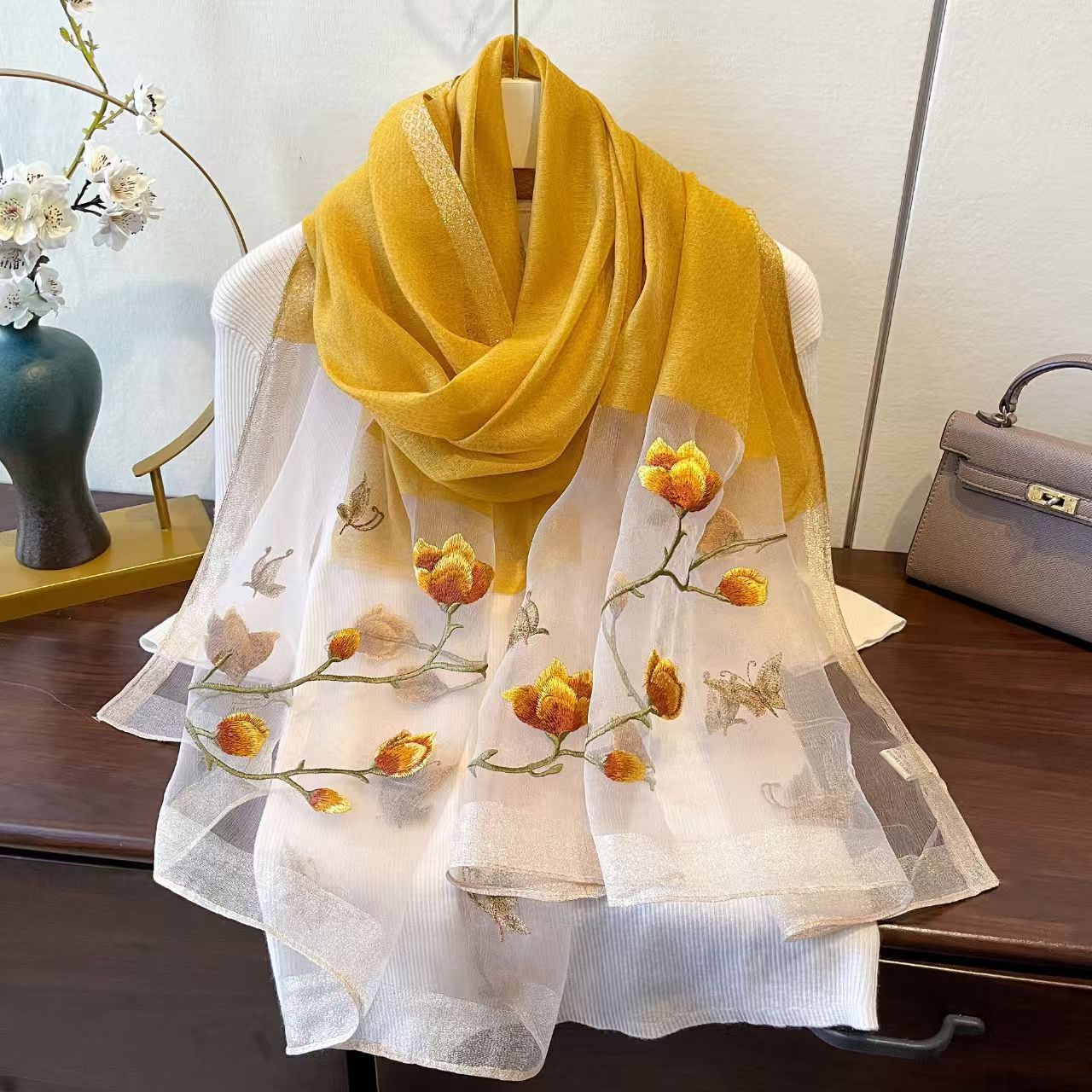 봄 신작 실크 울 스카프 여성 목련 꽃 다목적 뷰티 숄 복고풍 부드러운 자수 꽃 거즈 스카프