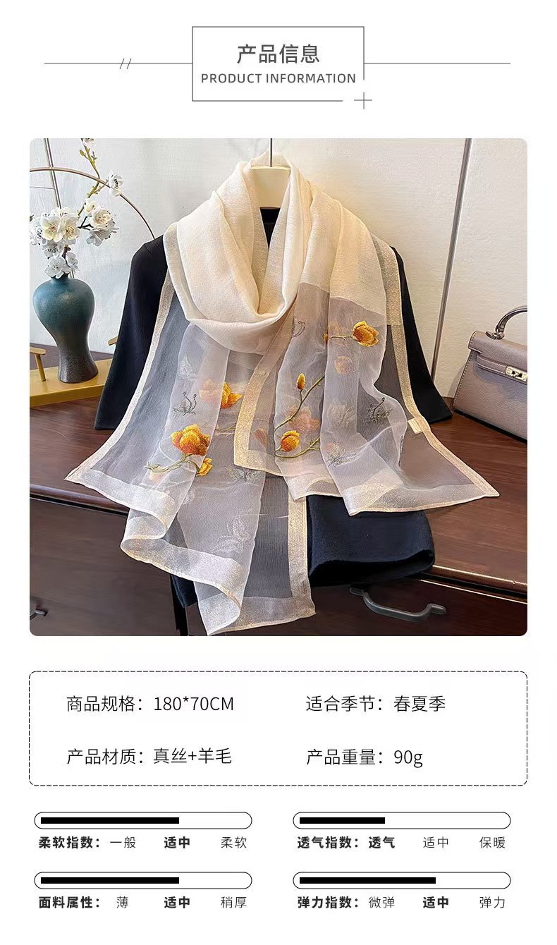 봄 신작 실크 울 스카프 여성 목련 꽃 다목적 뷰티 숄 복고풍 부드러운 자수 꽃 거즈 스카프스토어 가기