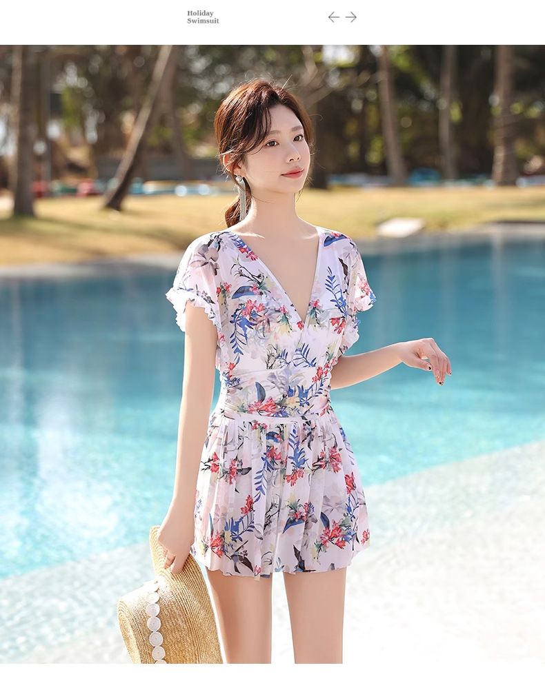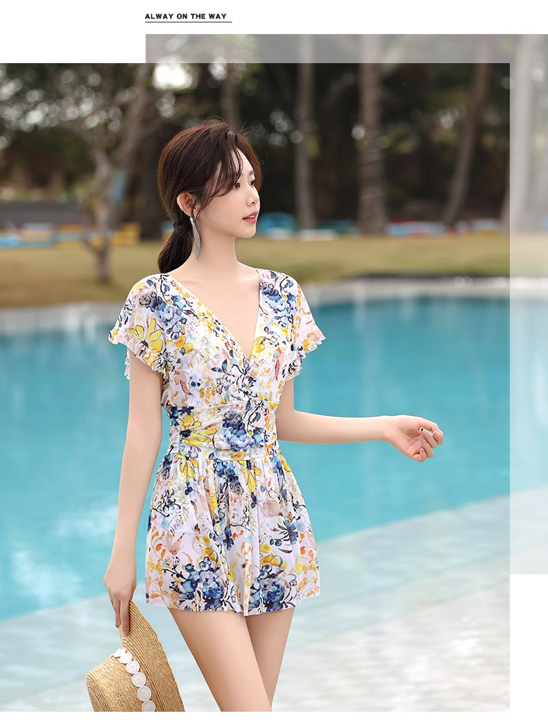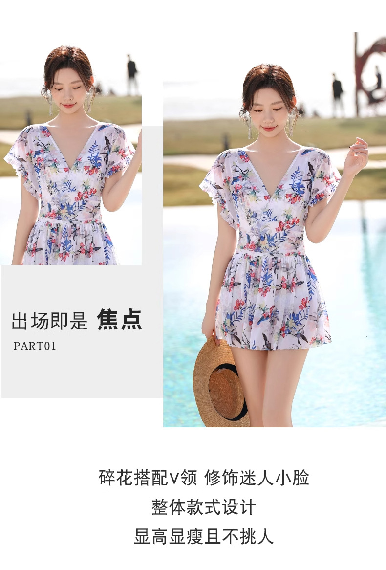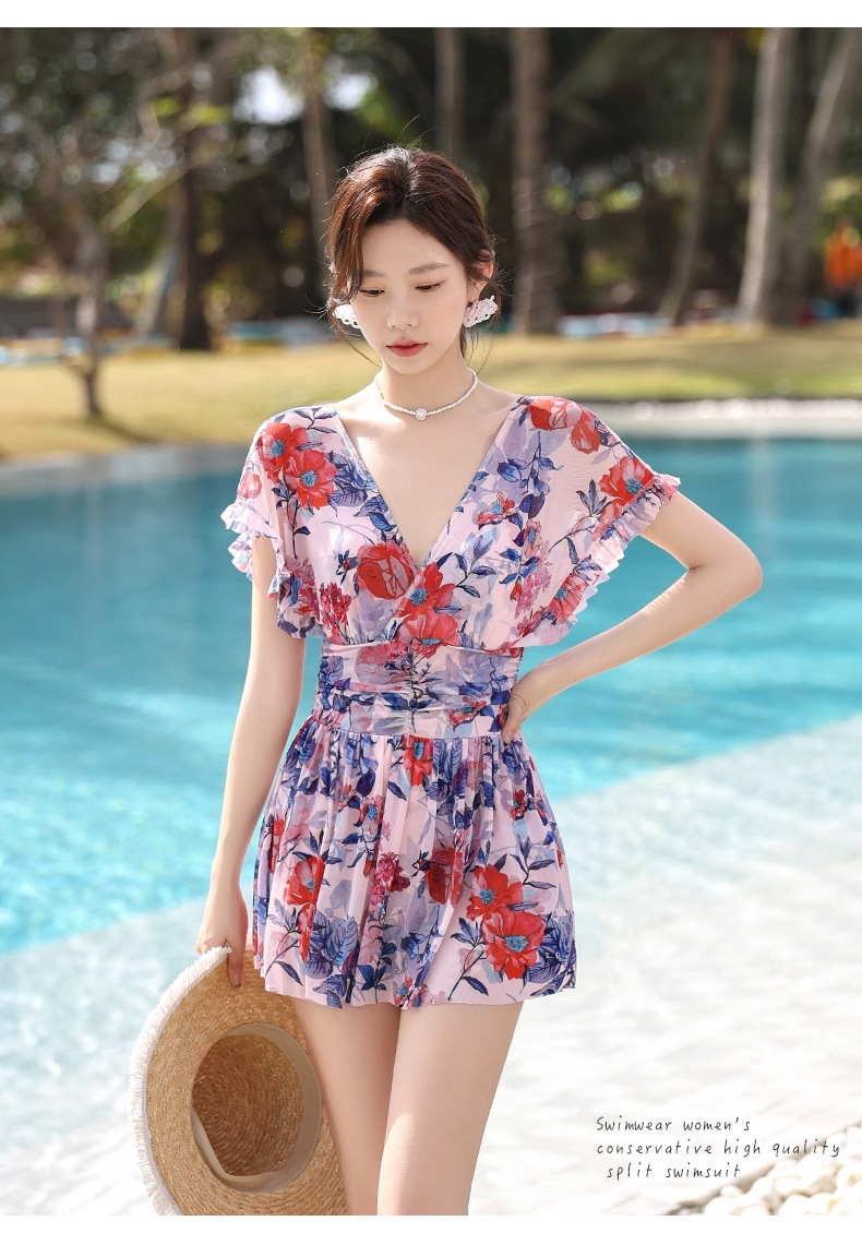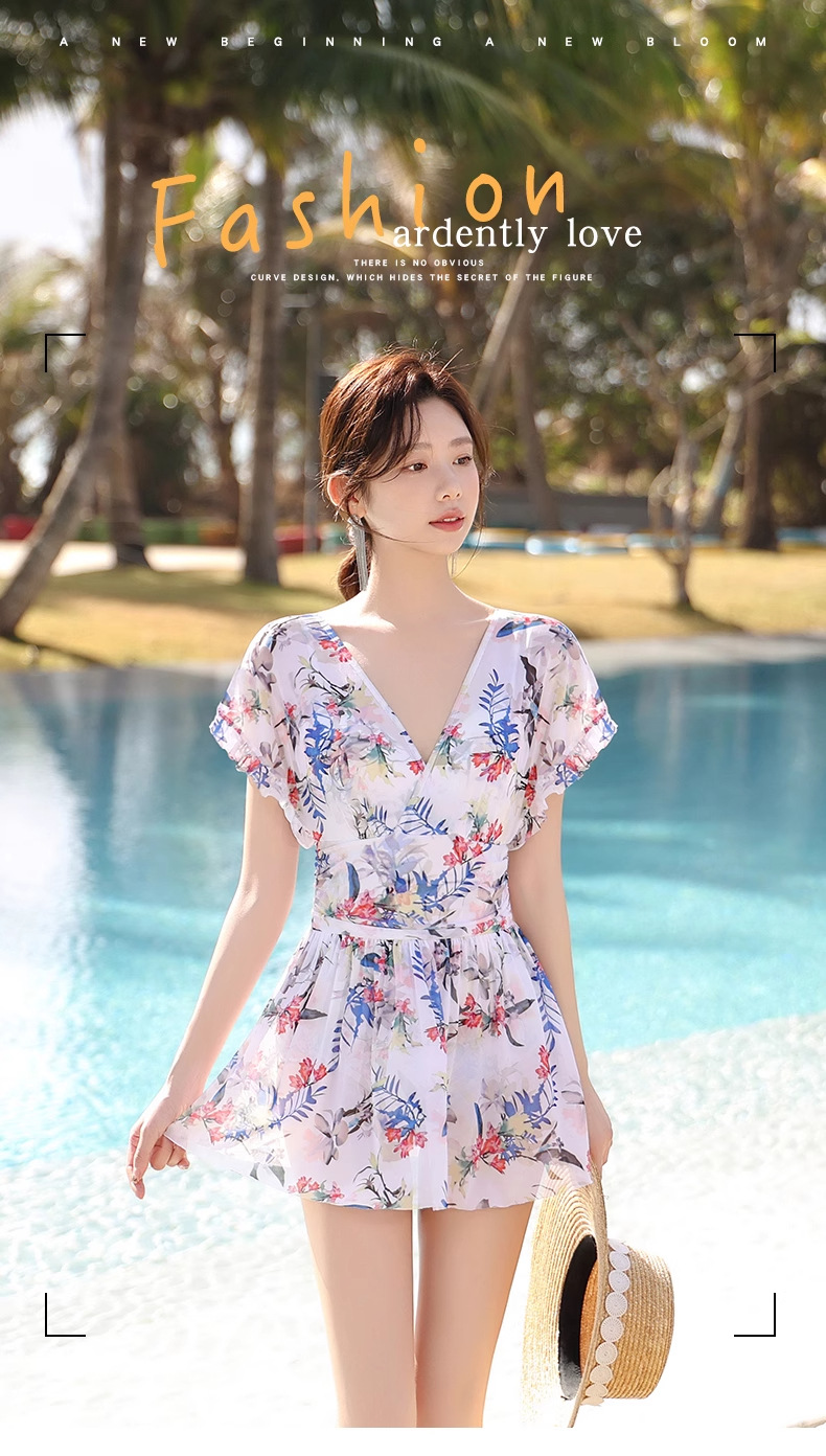 여성 수영복 플러스 사이즈 꽃무늬 INS 배 커버 슬리밍 요정 스타일 섹시한 브이넥 원피스 스커트 스타일 온천 수영복스토어 가기