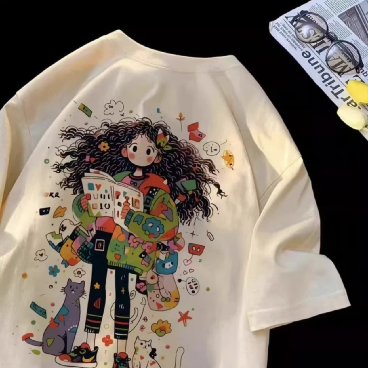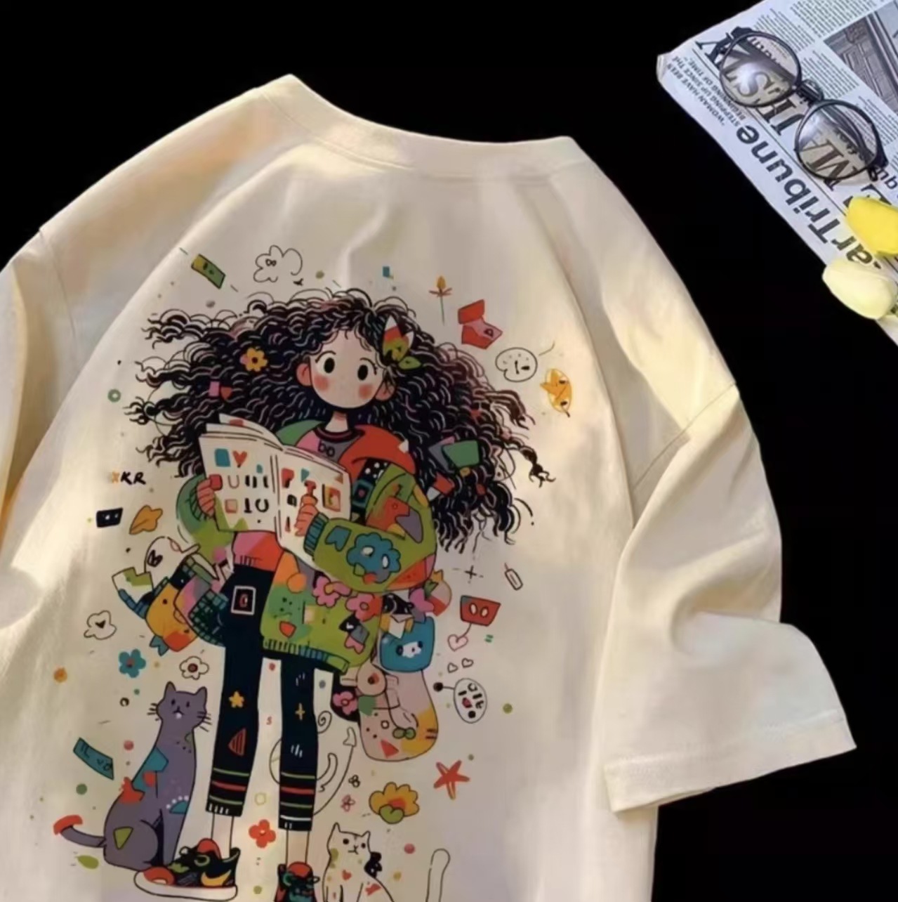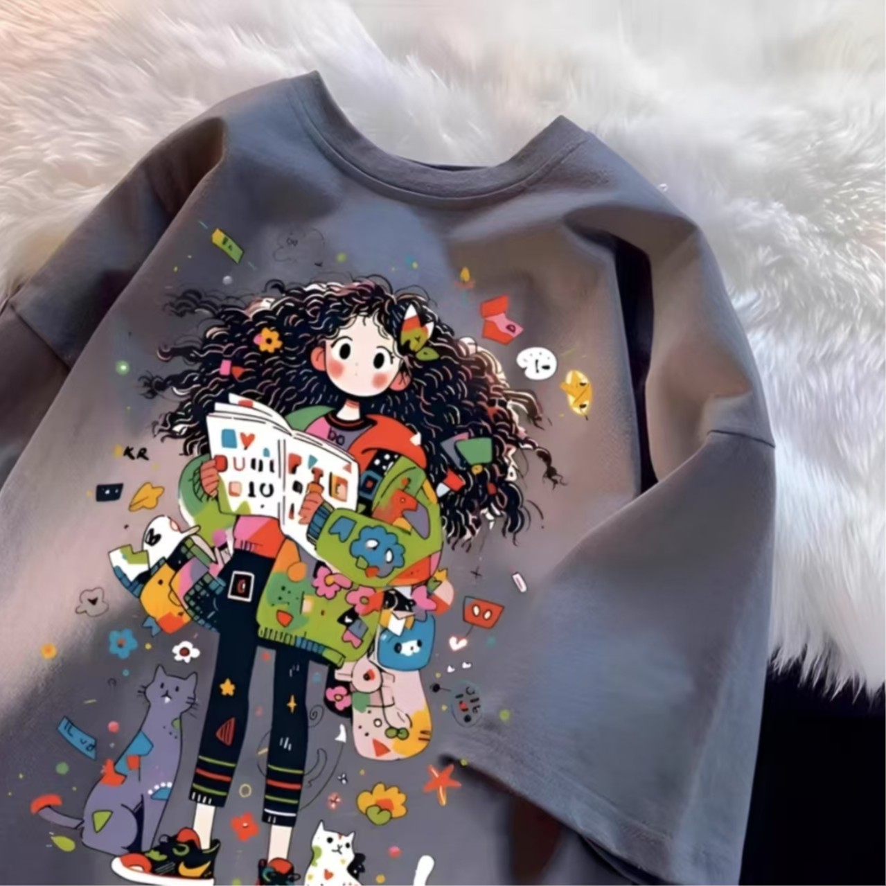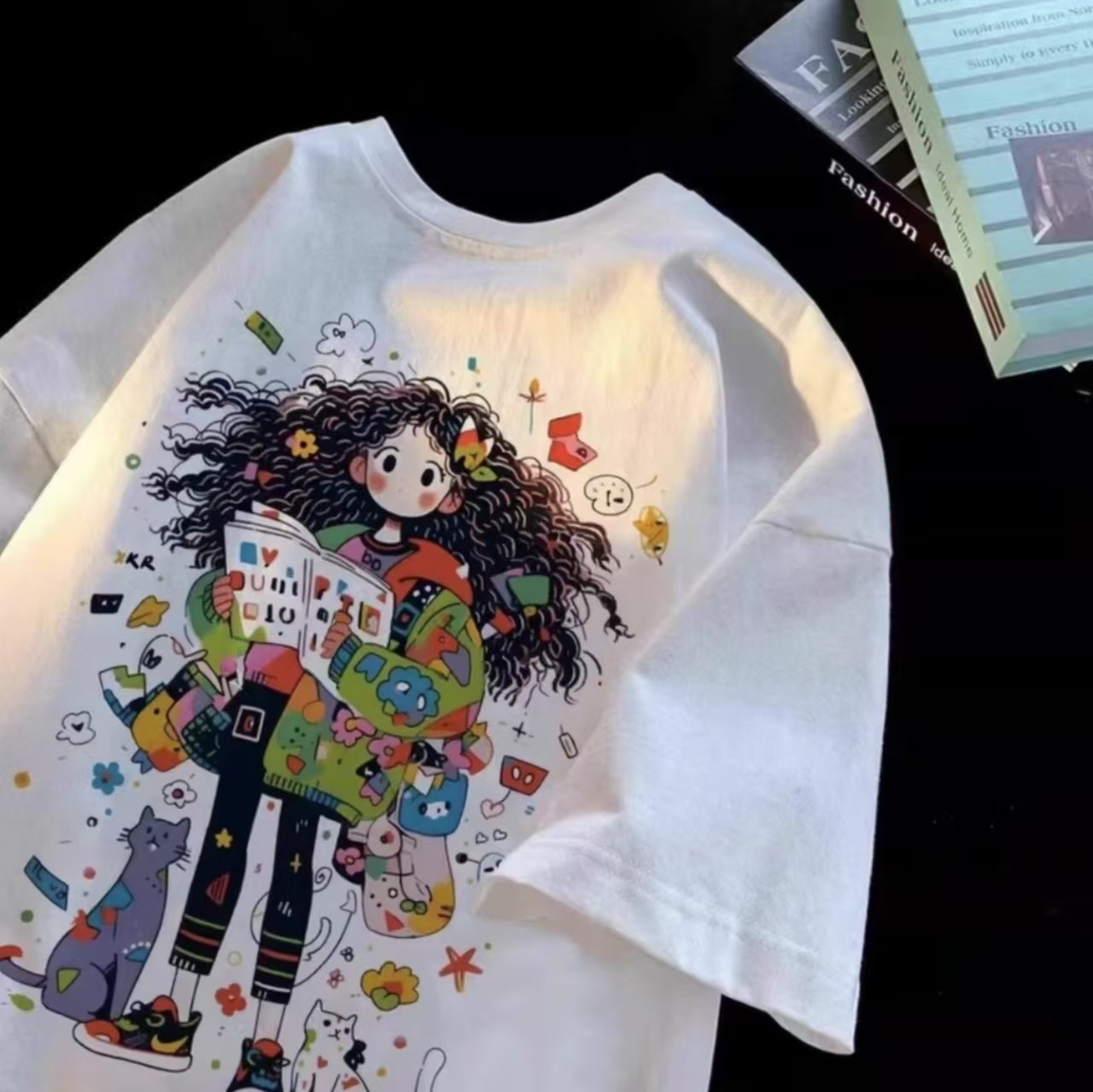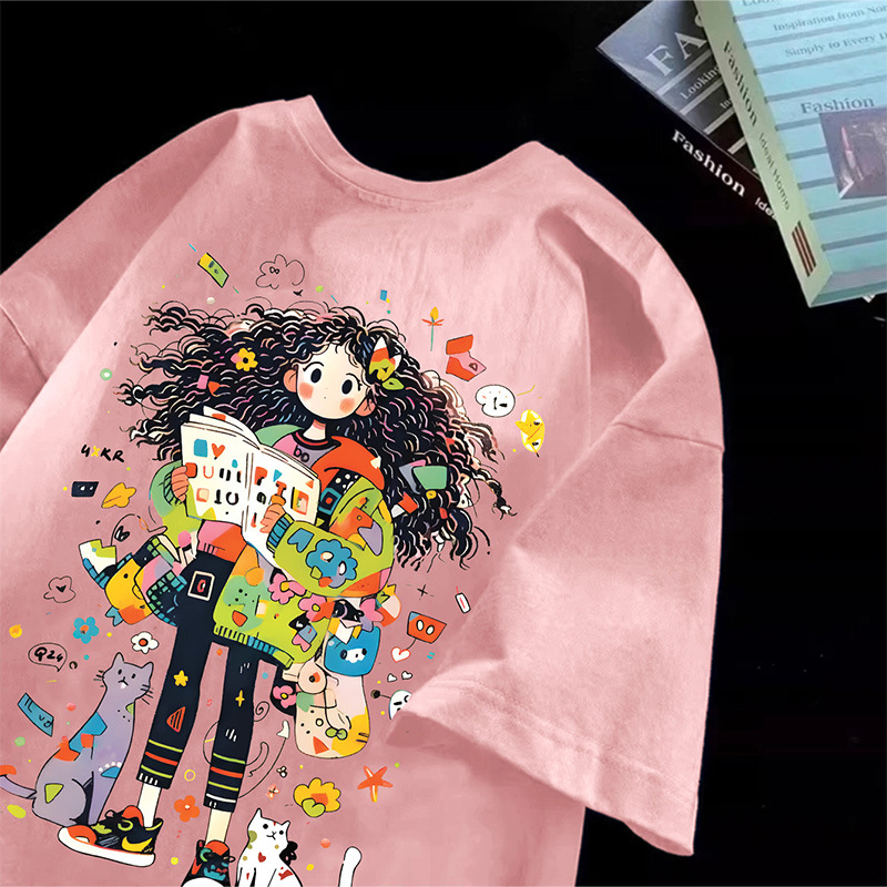 여름용 소녀용 순면 반팔 티셔츠 새로운 스타일 만화 라운드 넥 프린트 소녀 중대형 아기 유행상의