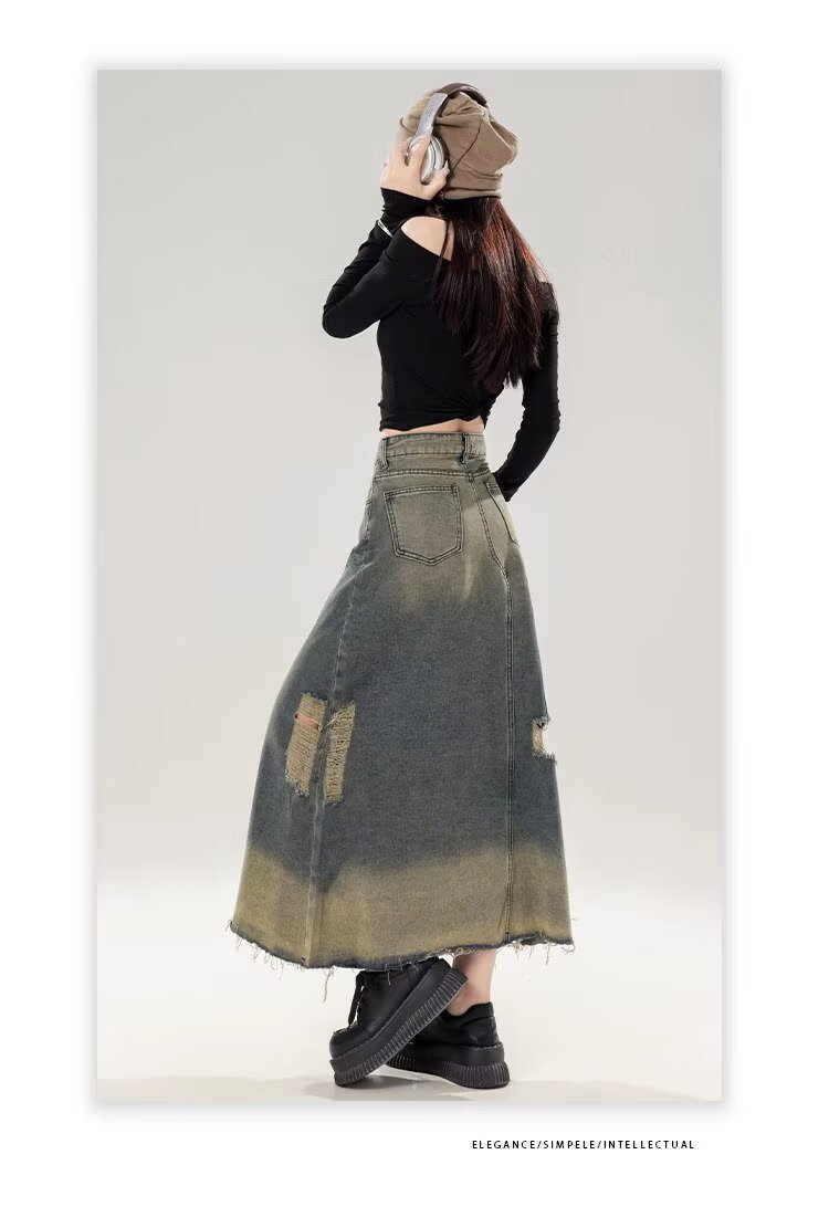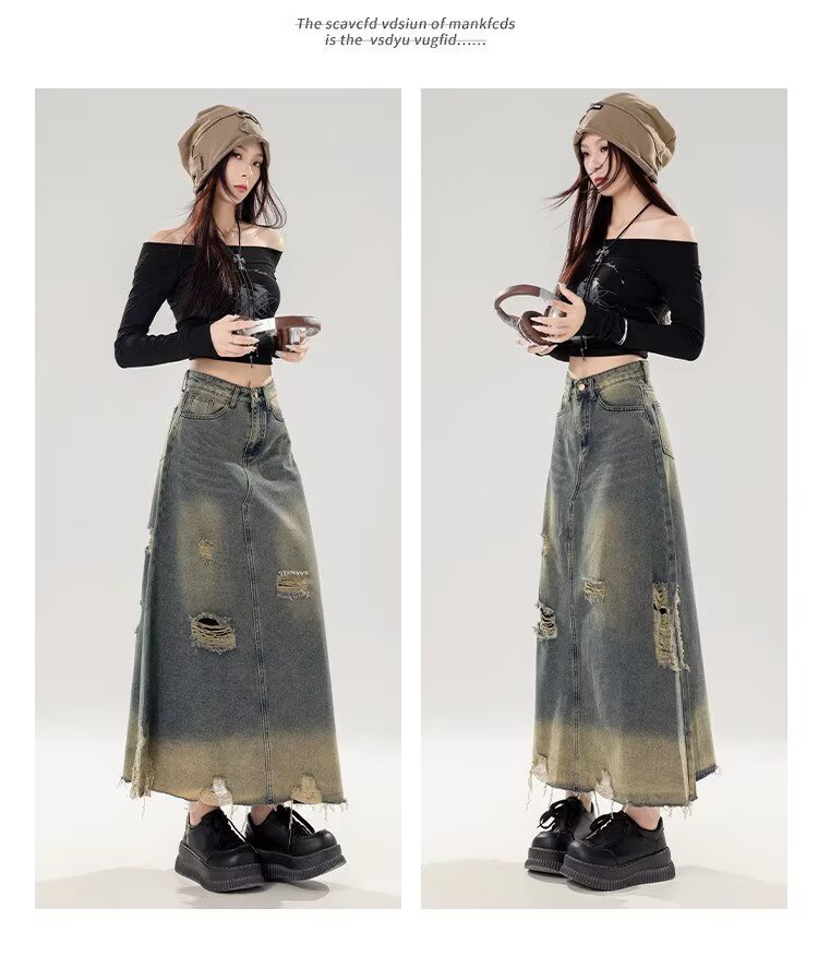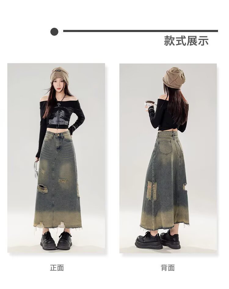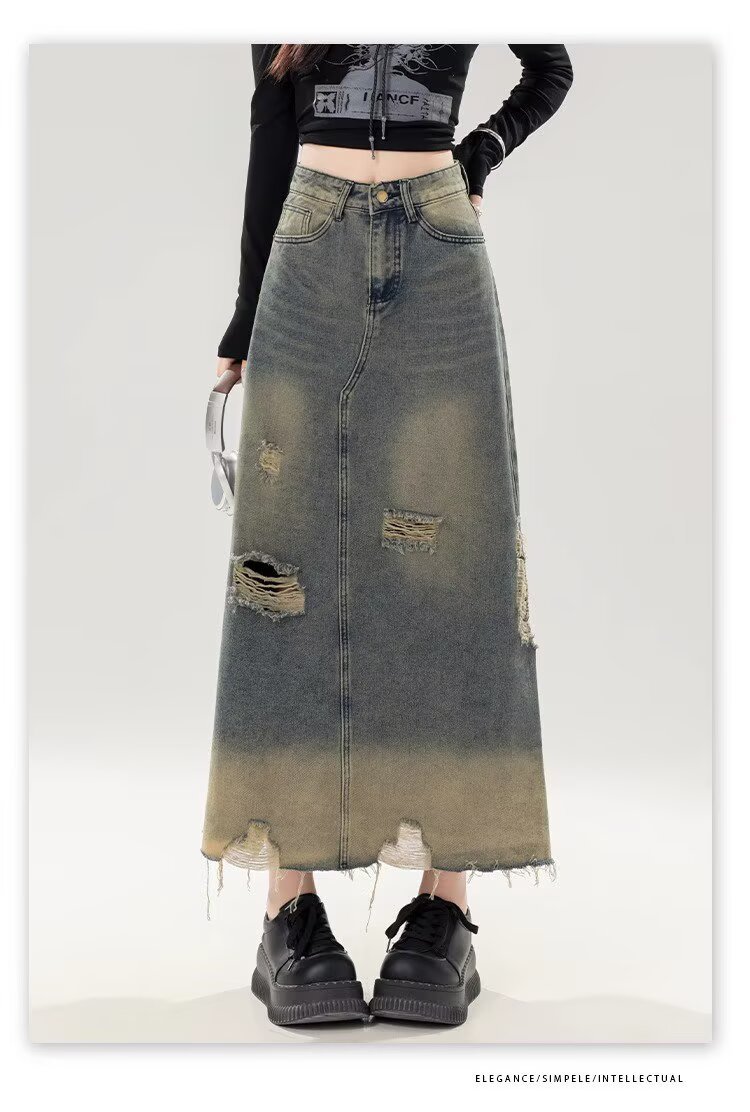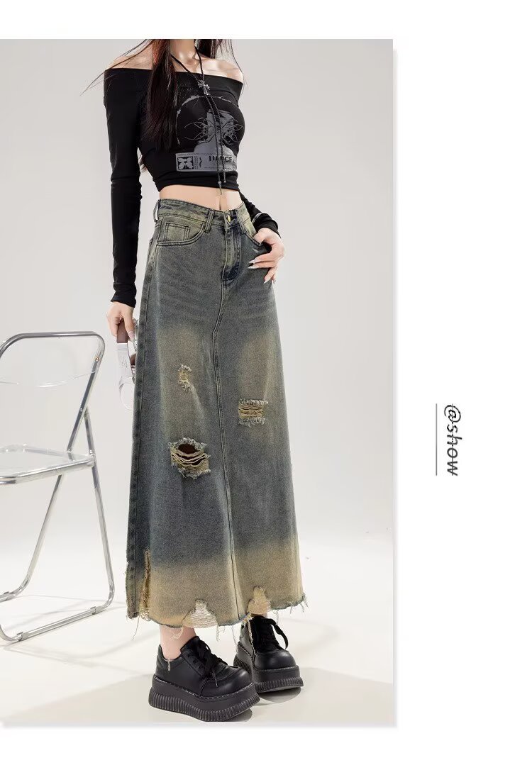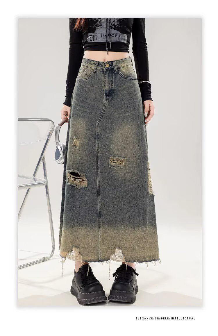 Wenwen Little Superman 워시 찢어진 로우 엣지 데님 롱 스커트 여성용 봄 신작 2025 하이 웨이스트 슬림 A 라인 스커트스토어 가기