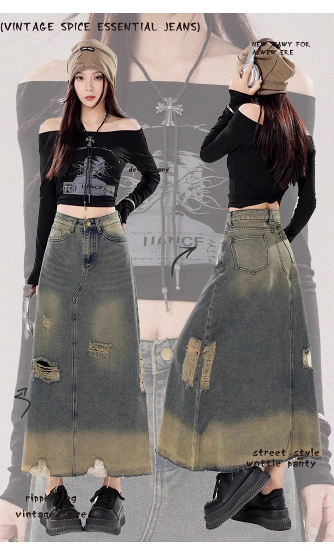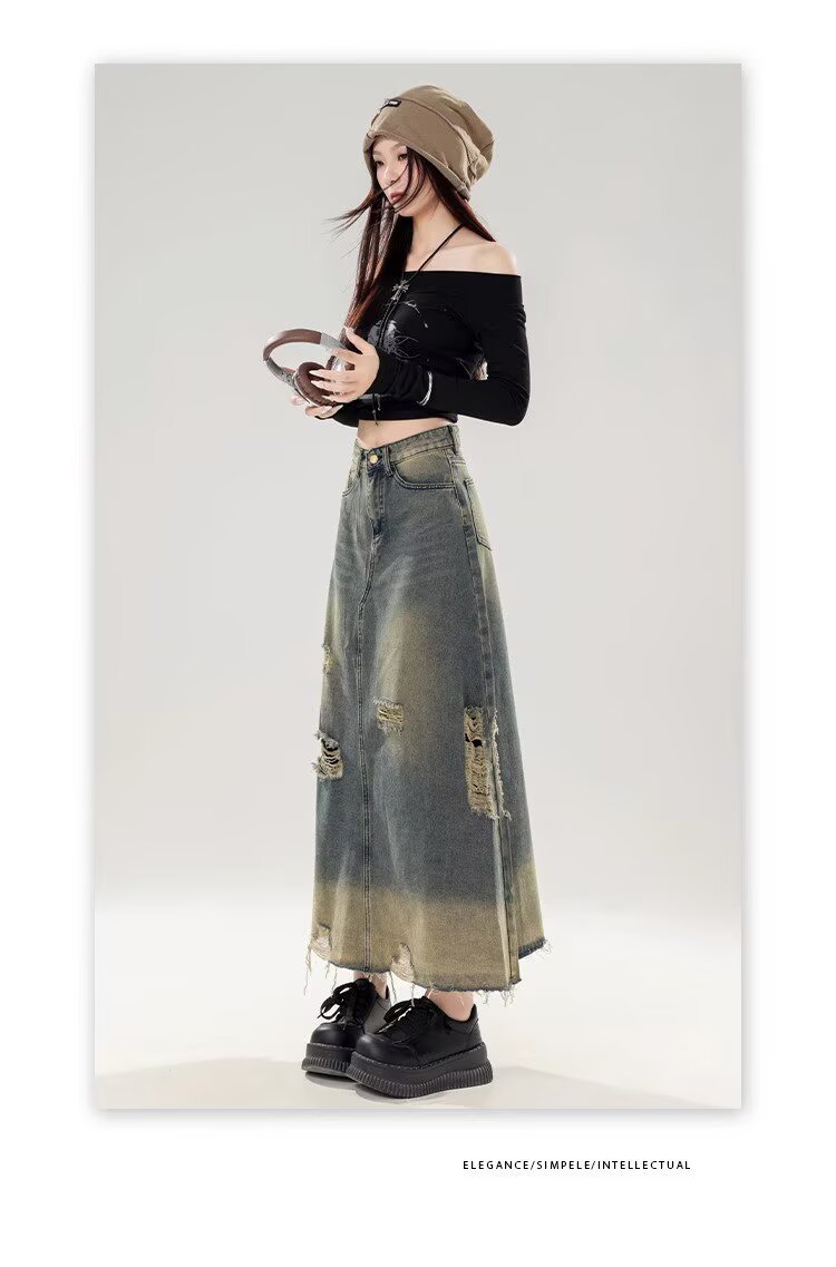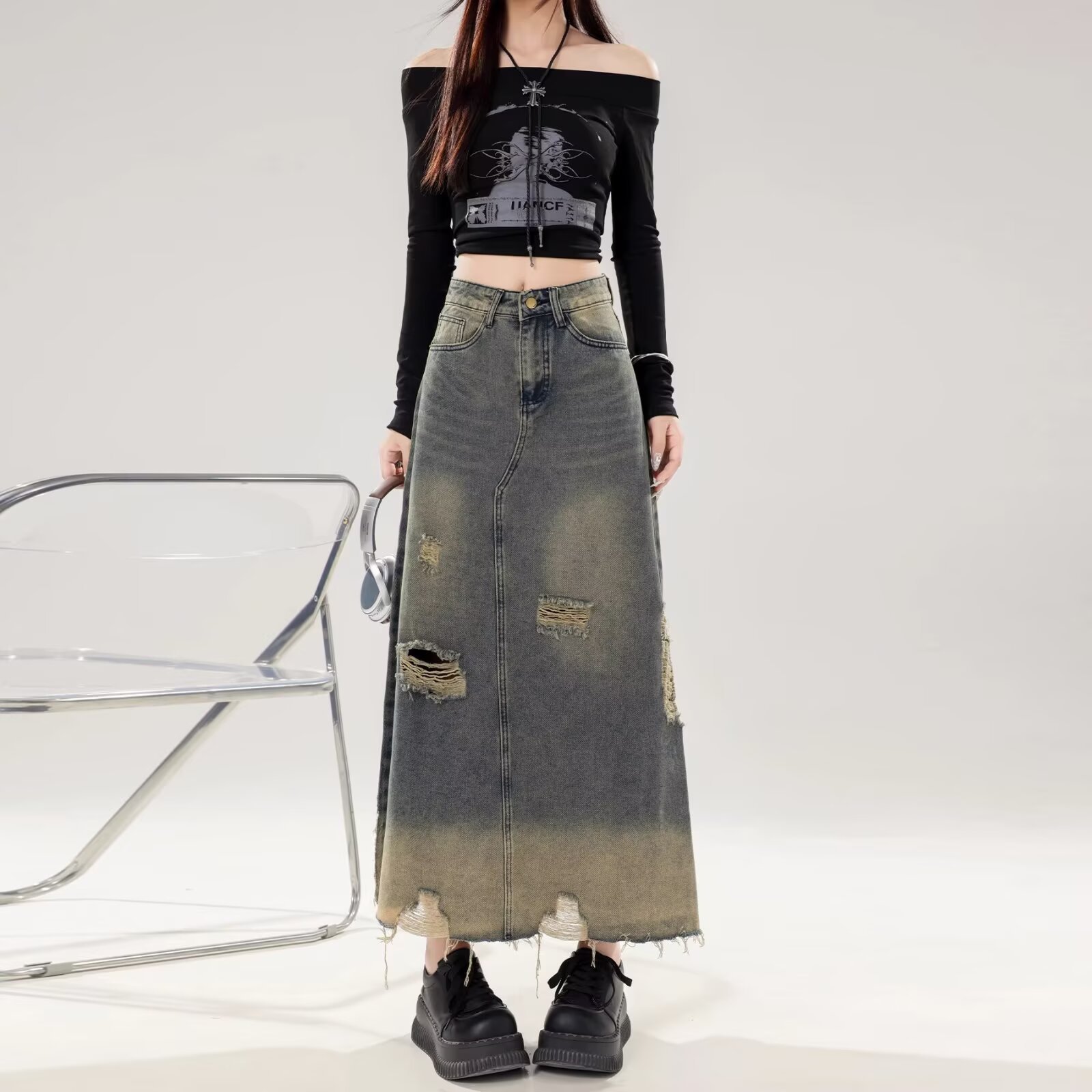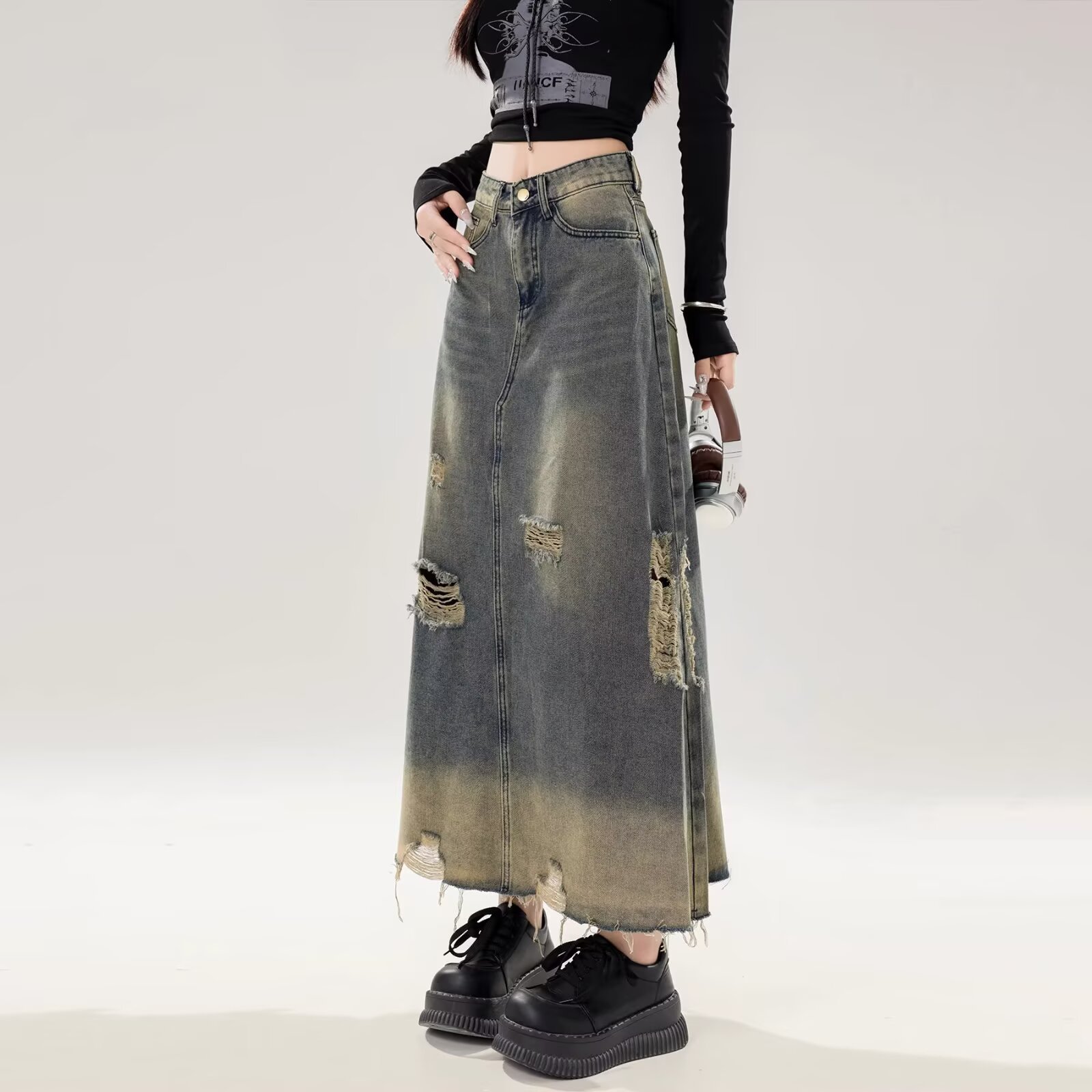 Wenwen Little Superman 워시 찢어진 로우 엣지 데님 롱 스커트 여성용 봄 신작 2025 하이 웨이스트 슬림 A 라인 스커트