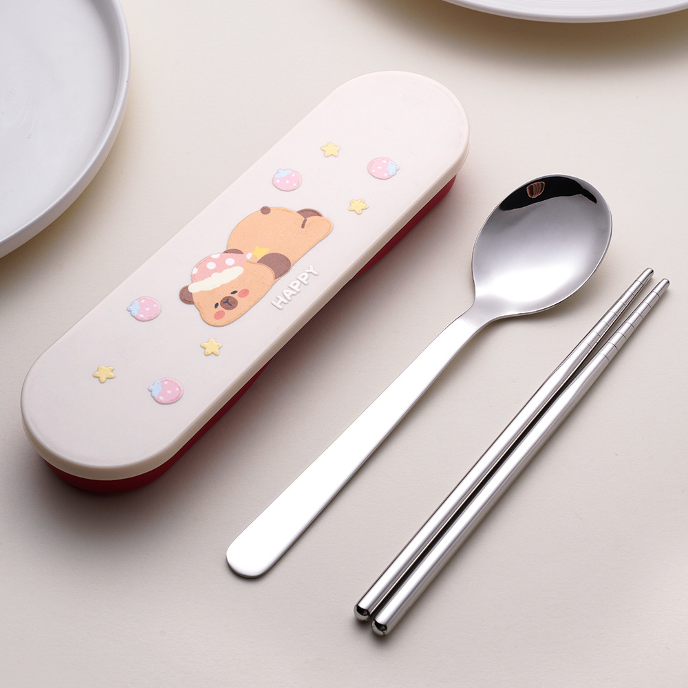 귀여운 만화 도파민 304 스테인레스 스틸 식기 스푼 젓가락 포크 세트 학생 휴대용 식사 식기스토어 가기
