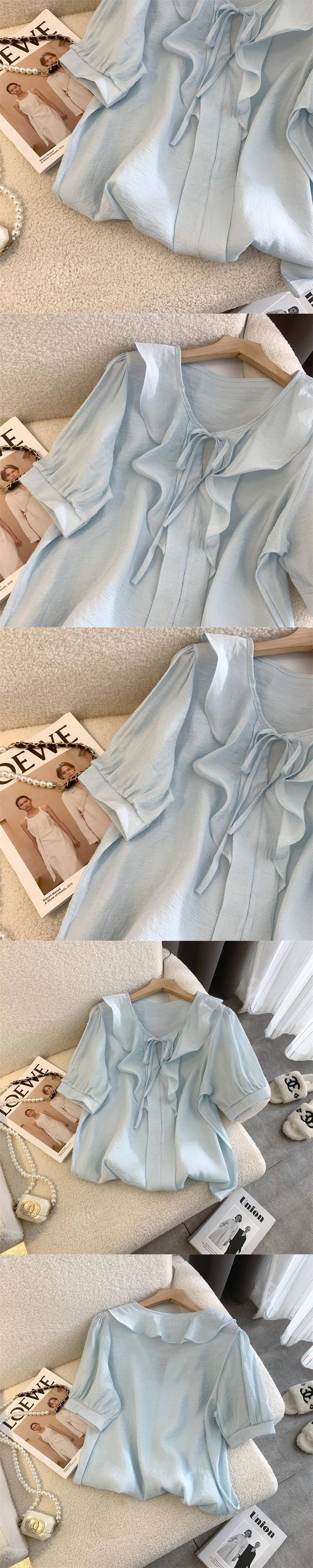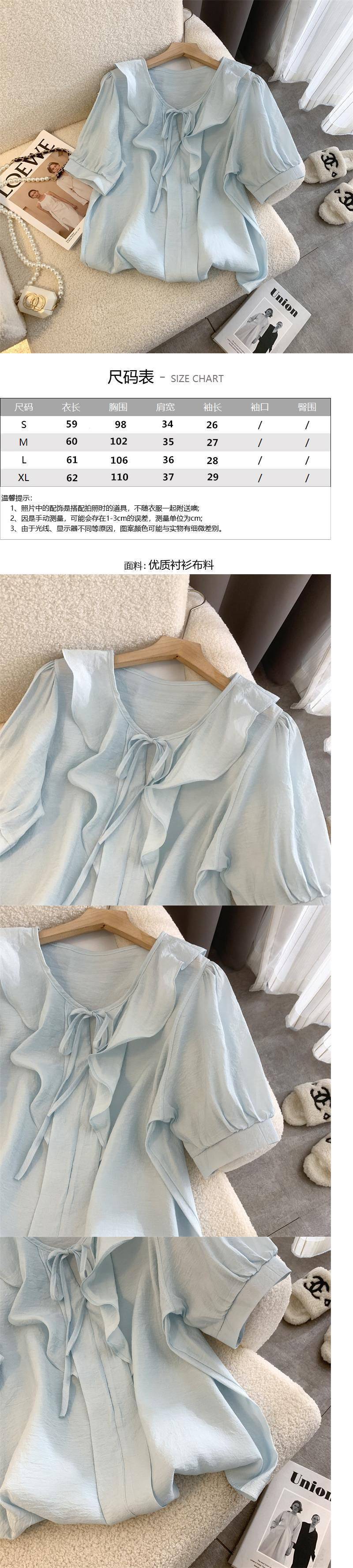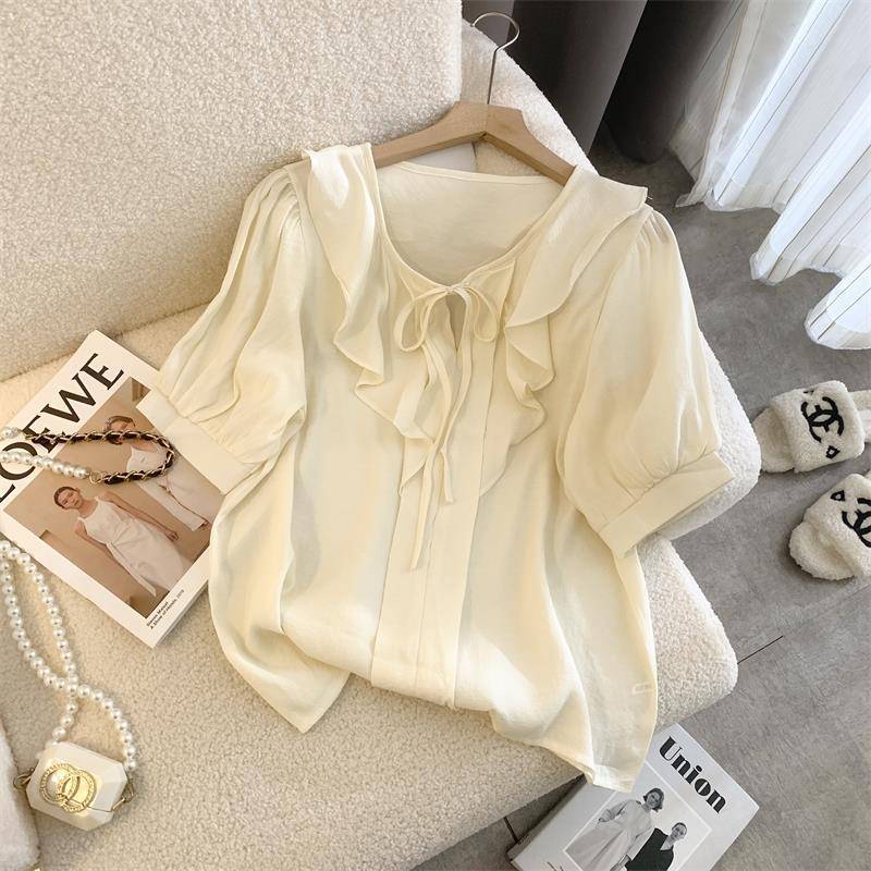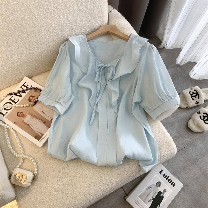 여성을 위한 프렌치 젠틀 스타일 블루 칼라 반팔 셔츠, 니치 디자인, 달콤하고 연령을 줄여주는 러플 쉬폰 탑