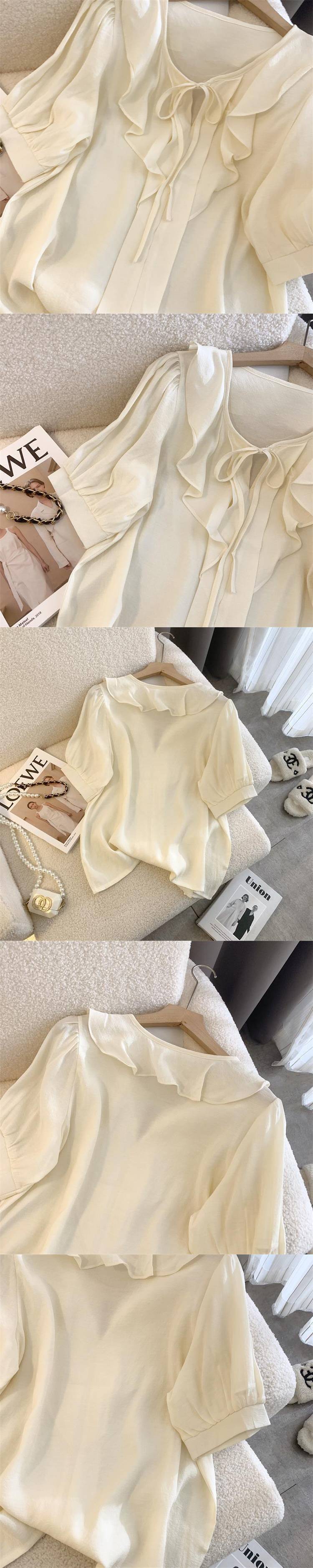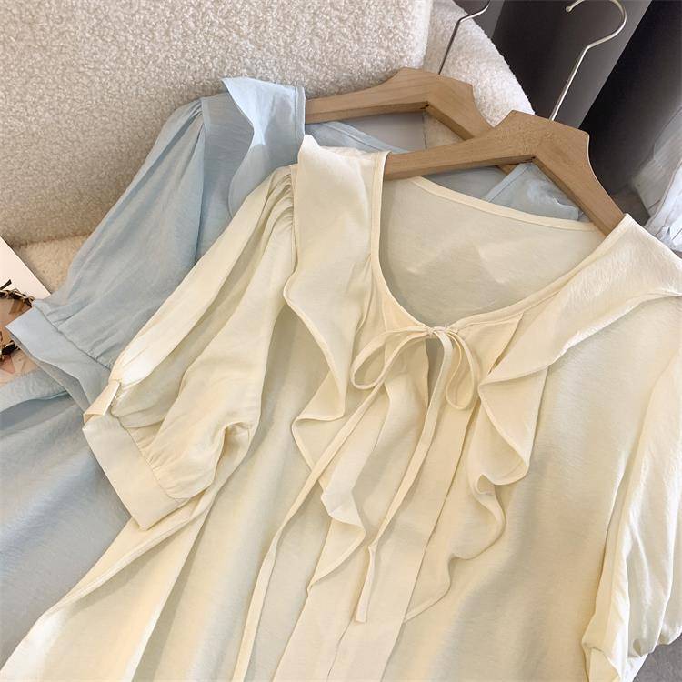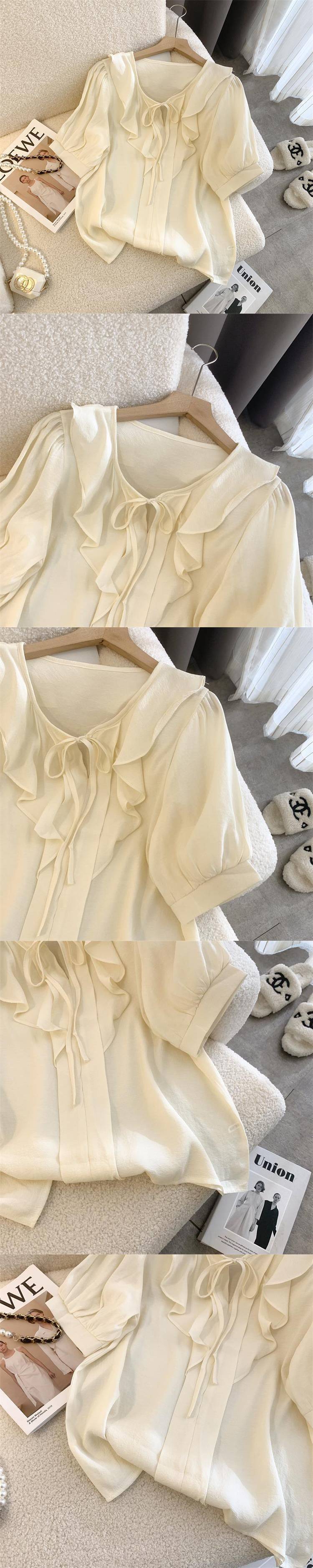 여성을 위한 프렌치 젠틀 스타일 블루 칼라 반팔 셔츠, 니치 디자인, 달콤하고 연령을 줄여주는 러플 쉬폰 탑