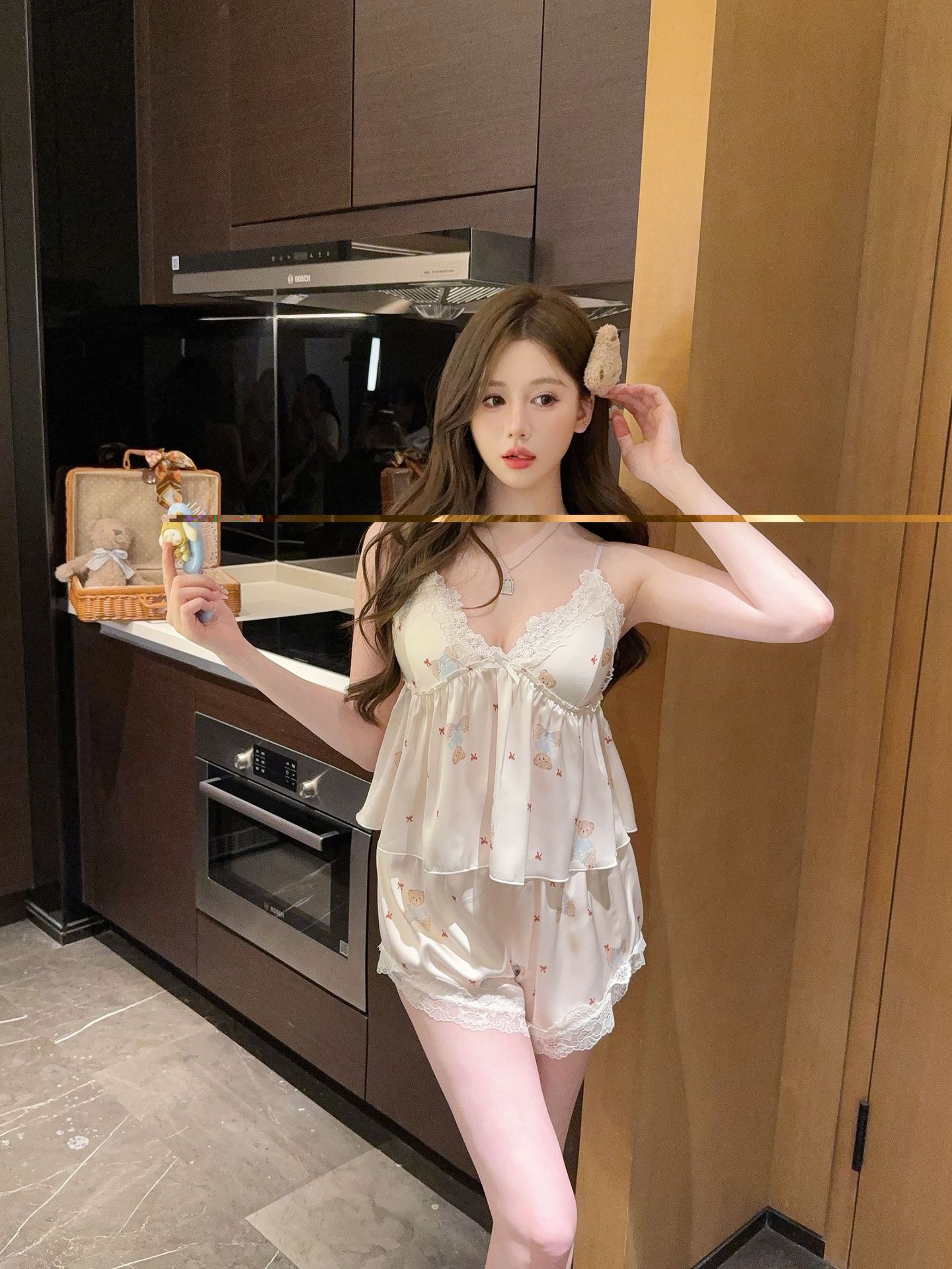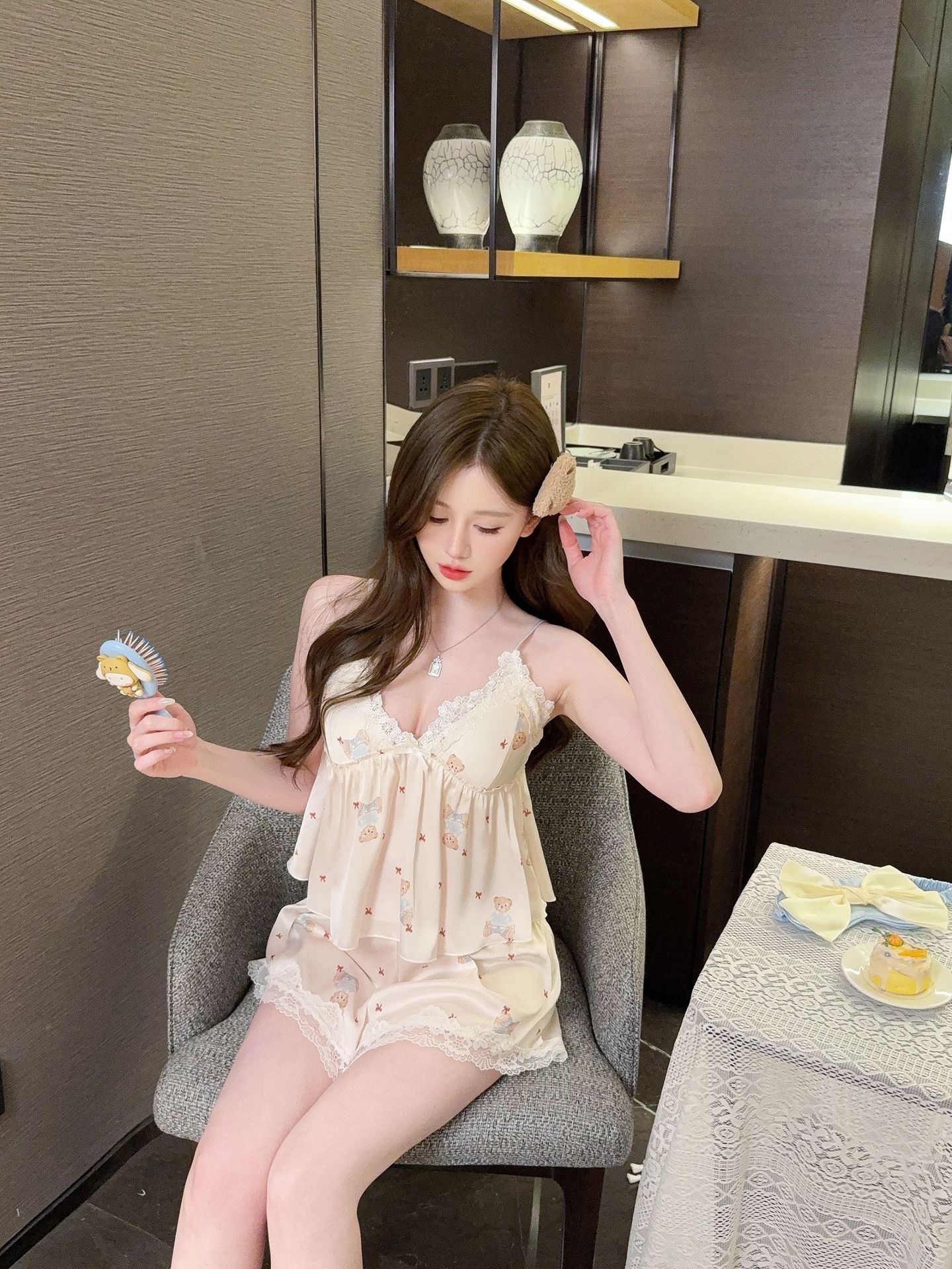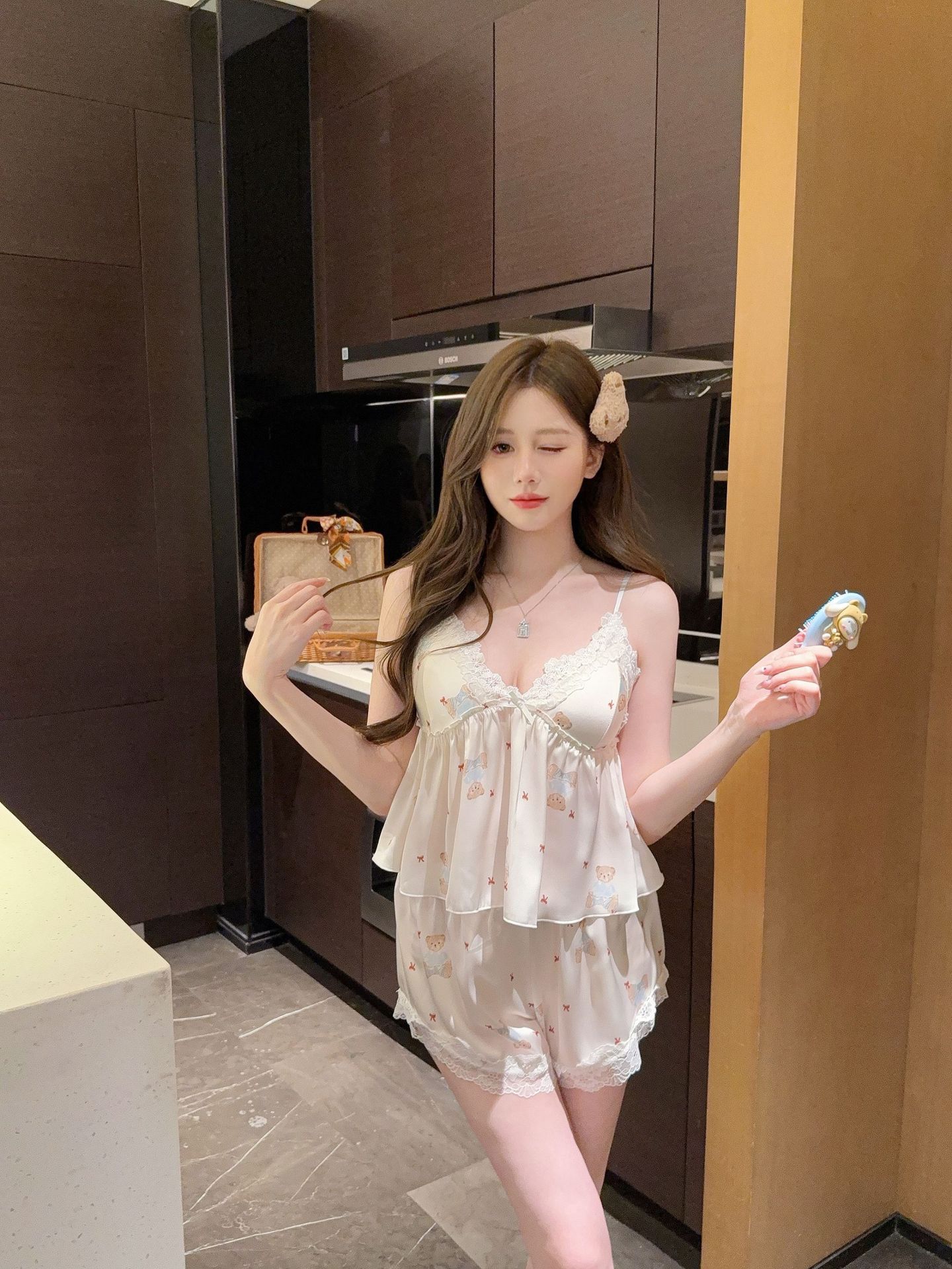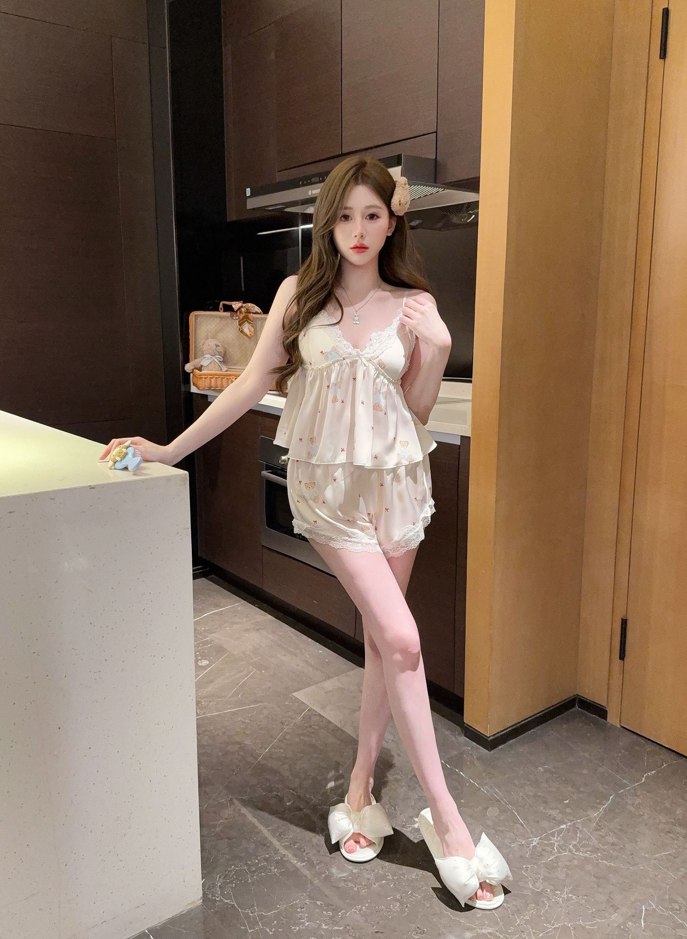 [Gummy Bears] 가슴 패드가 있는 여성용 귀여운 만화 곰 서스펜더 반바지 잠옷 여름 시원한 홈웨어 얇은스토어 가기