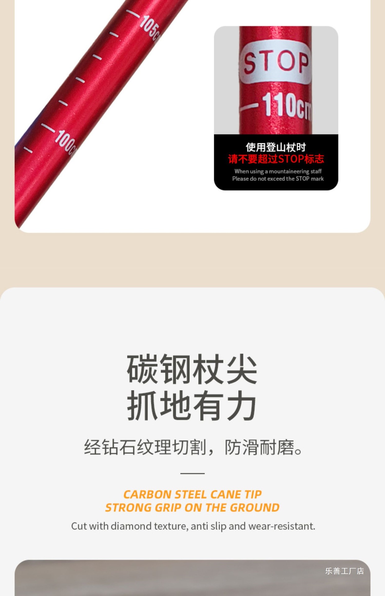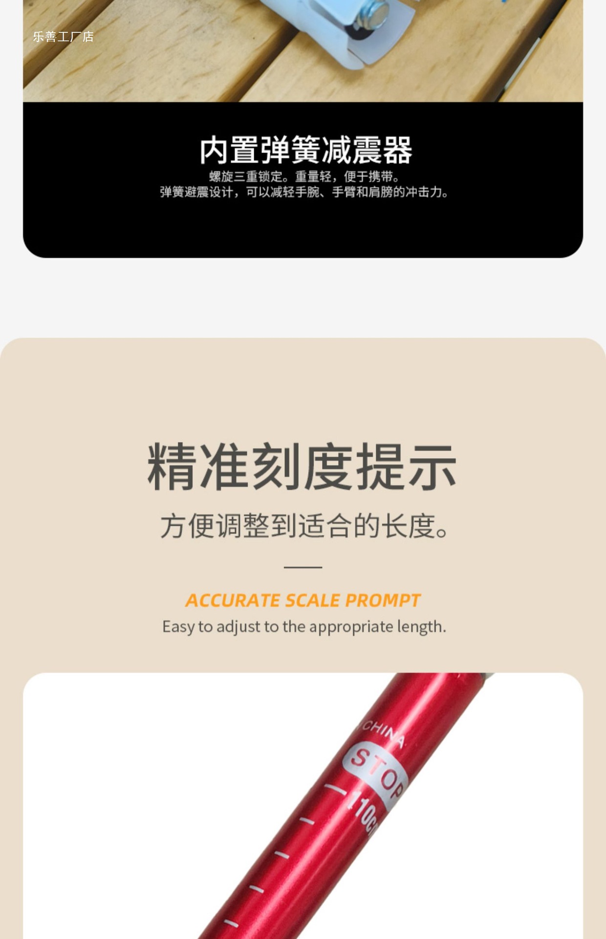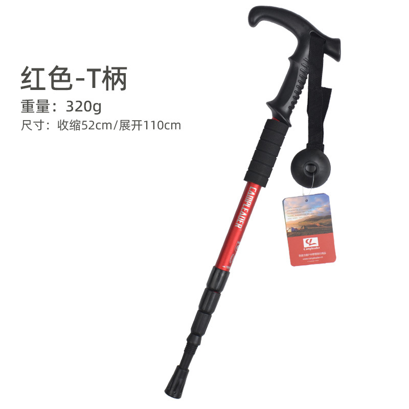 • 빨간색 T자형 손잡이 4섹션(양손잡이용) 트레킹 폴 + 예비 원형 발 덮개 1개