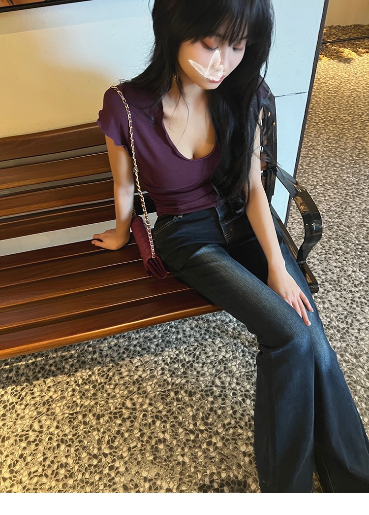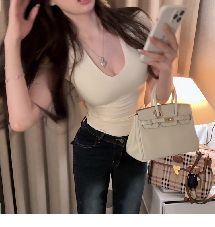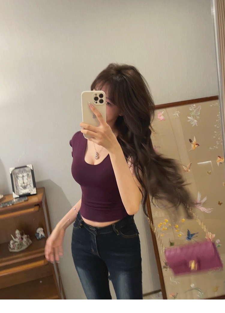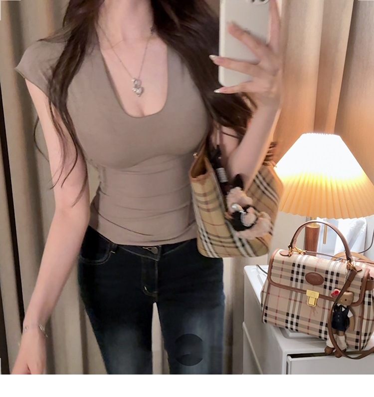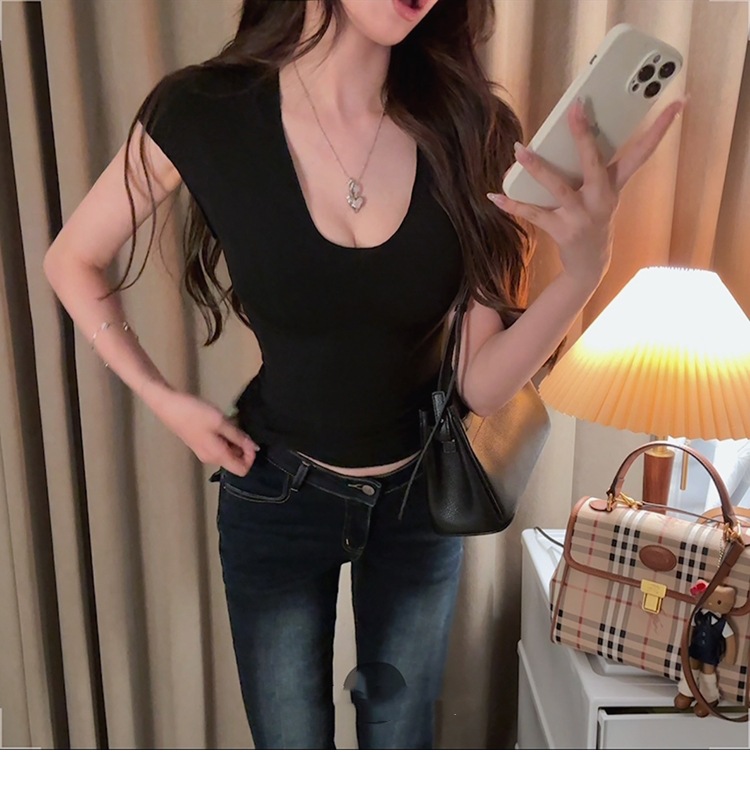 여름 여성을 위한 섹시 슬림핏 허리 빅 U넥 오른쪽 어깨 반팔 티셔츠 새로운 슬리밍 순수한 욕망 핫걸 섹시 탑 트렌디스토어 가기