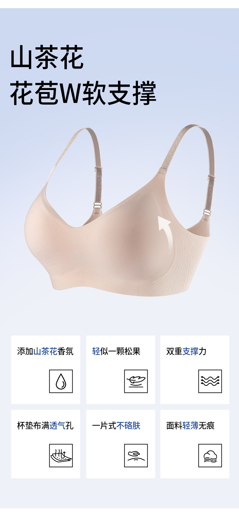 여성용 동백향 속옷, 매끄럽고 편안하며 통기성이 뛰어나고 얇은 여름 푸쉬업 처짐 방지 브라, 아름다운 등 고정 컵