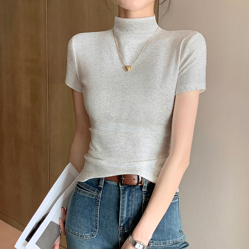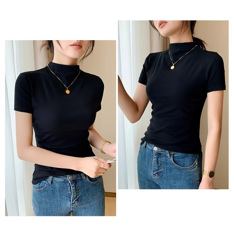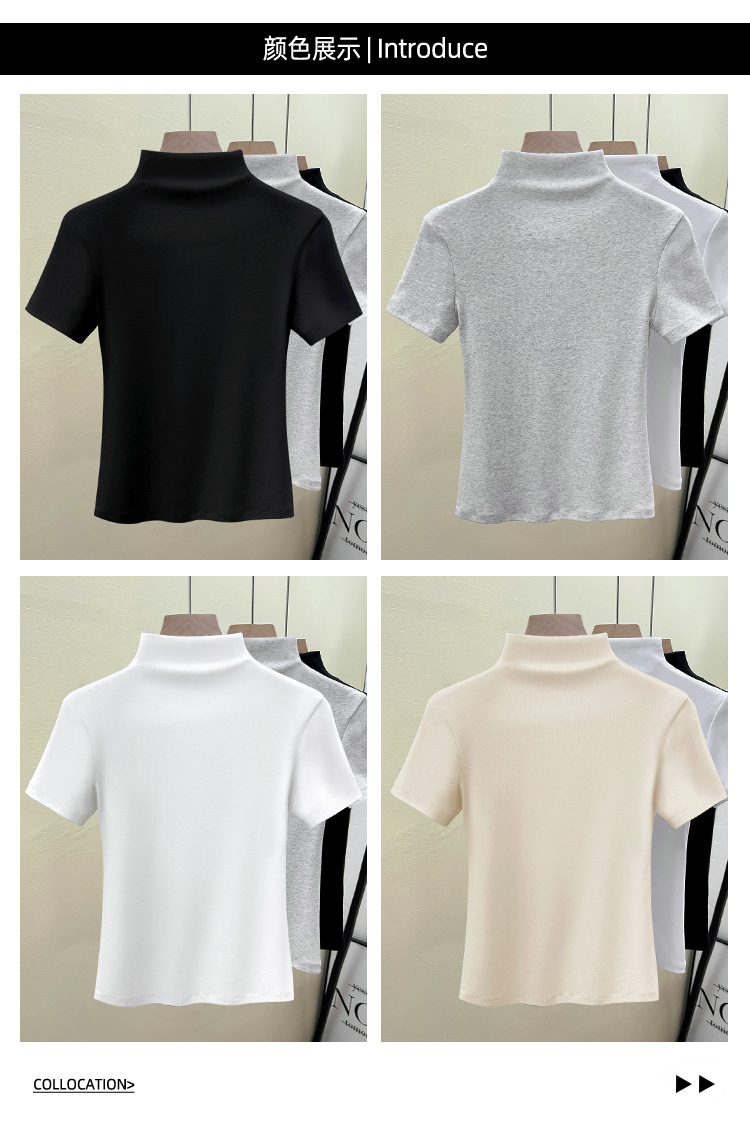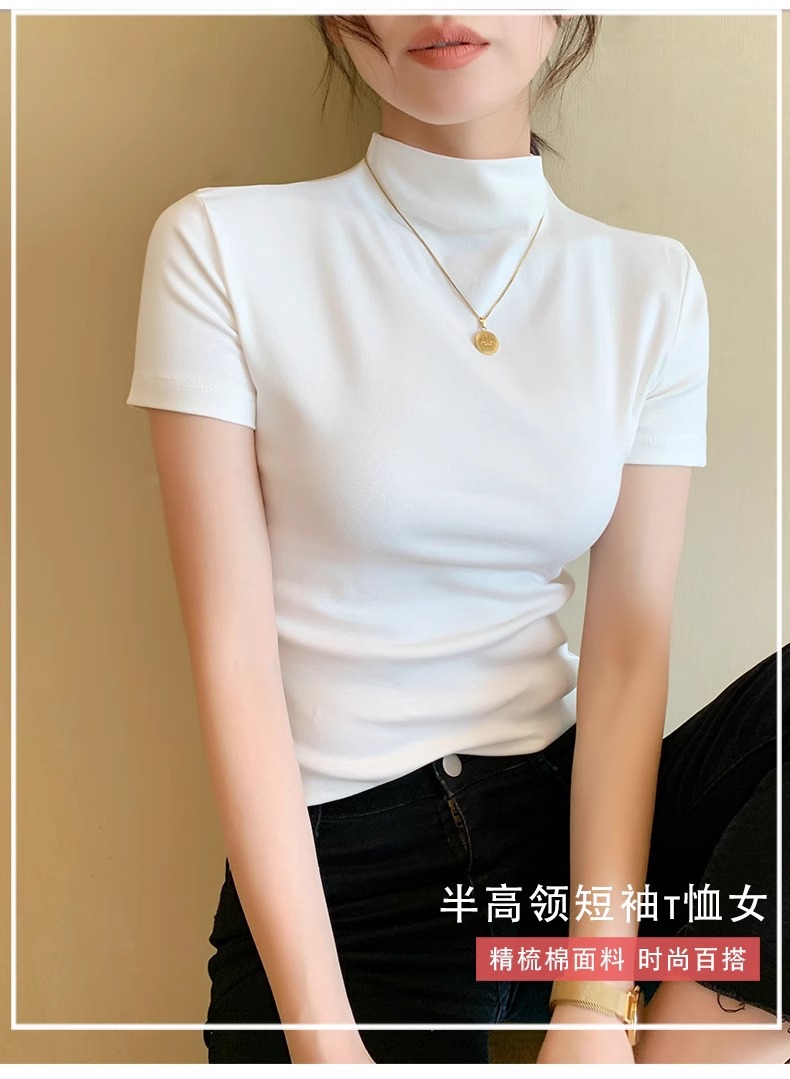 여성용 하프 터틀넥 반팔 셔츠, 봄, 여름, 가을 얇은 순면 티셔츠, 슬림핏 셔츠, 기질 있는 반팔 상의스토어 가기
