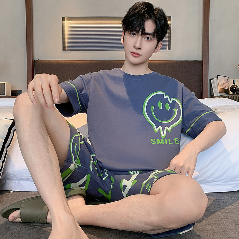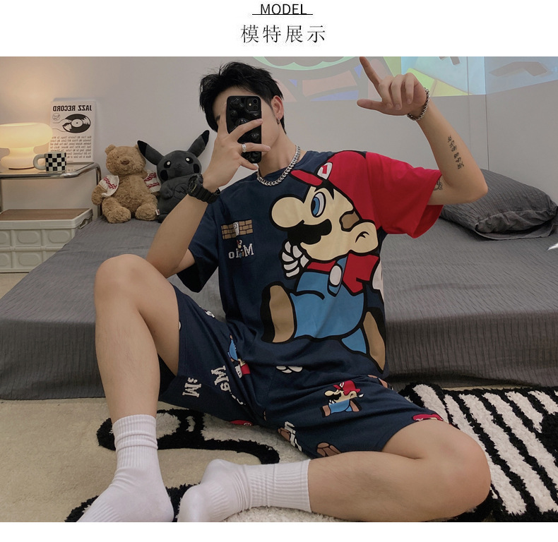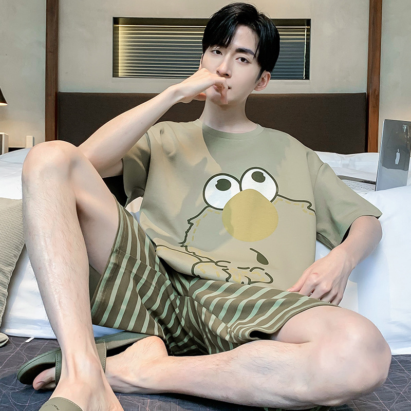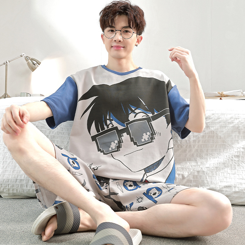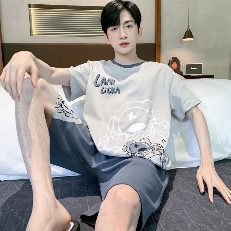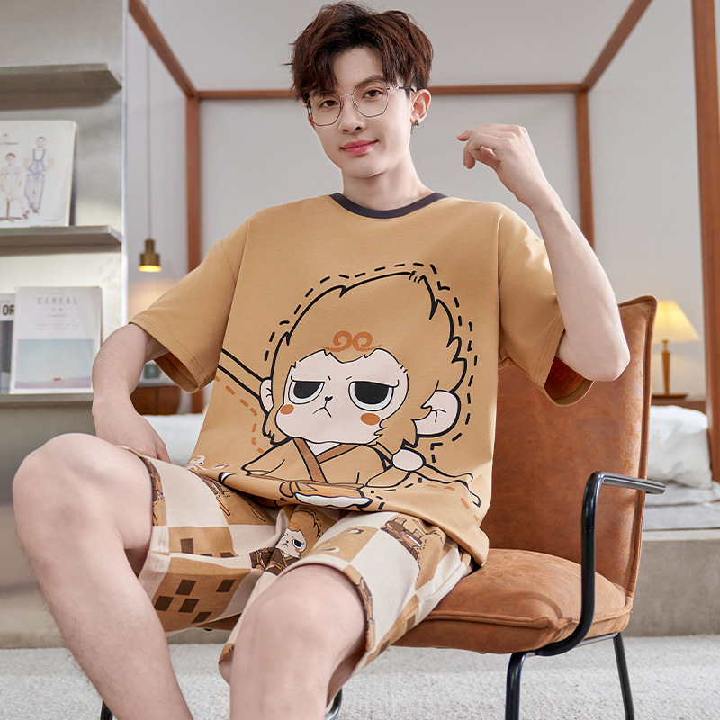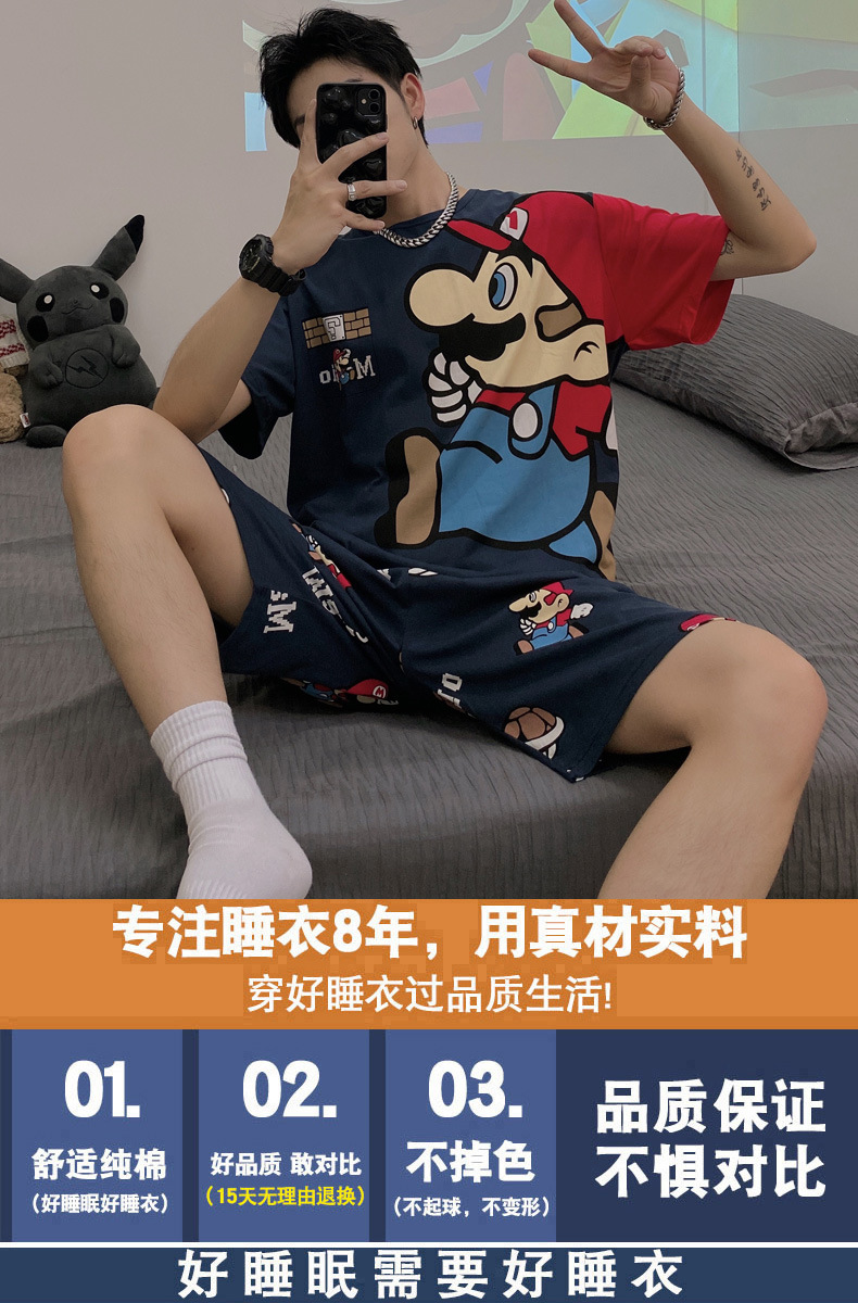 남성 잠옷 여름 순수 코튼 반팔 반바지 얇은 만화 청소년은 플러스 사이즈 홈웨어 세트 외부에서 착용 가능스토어 가기