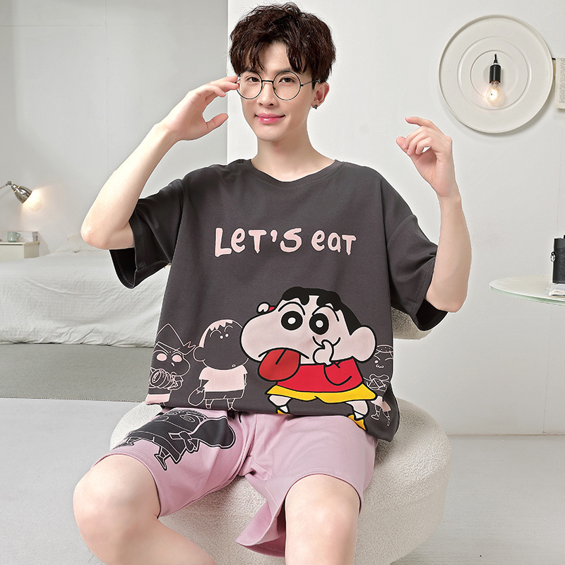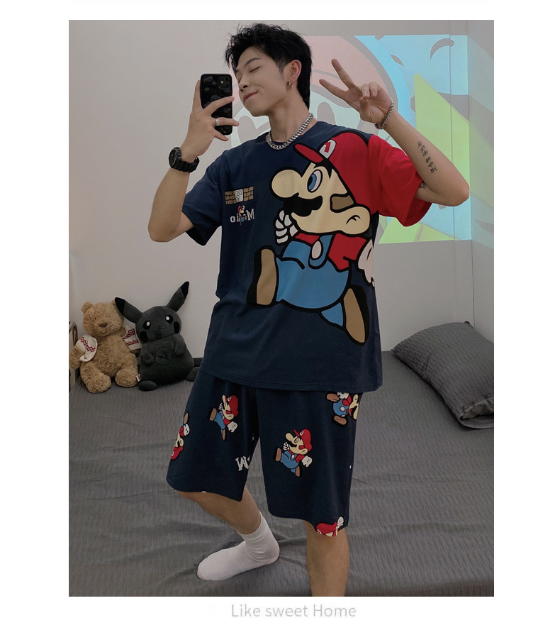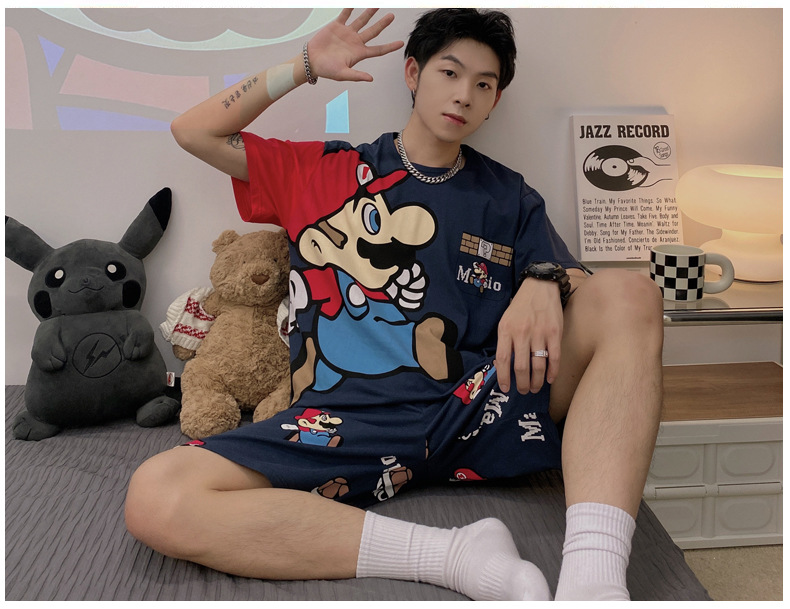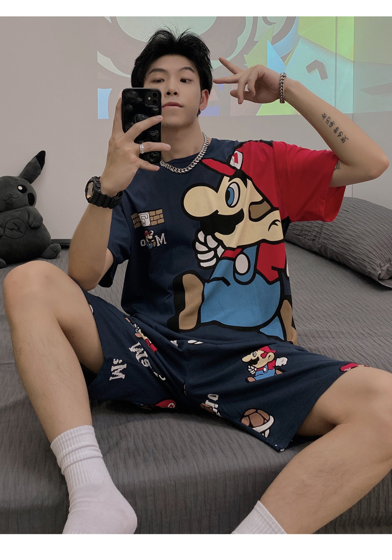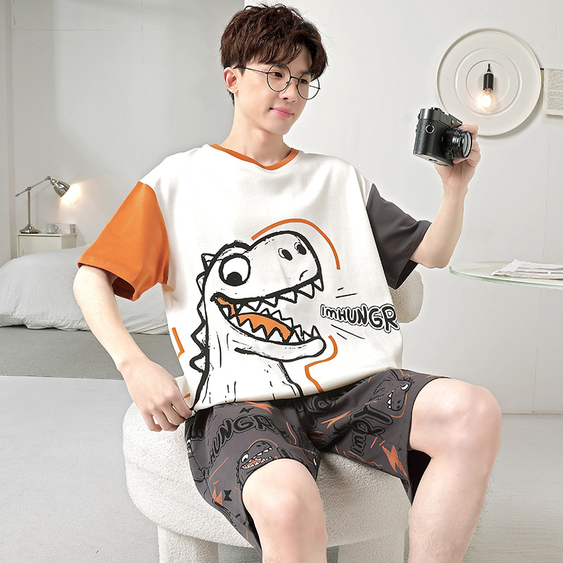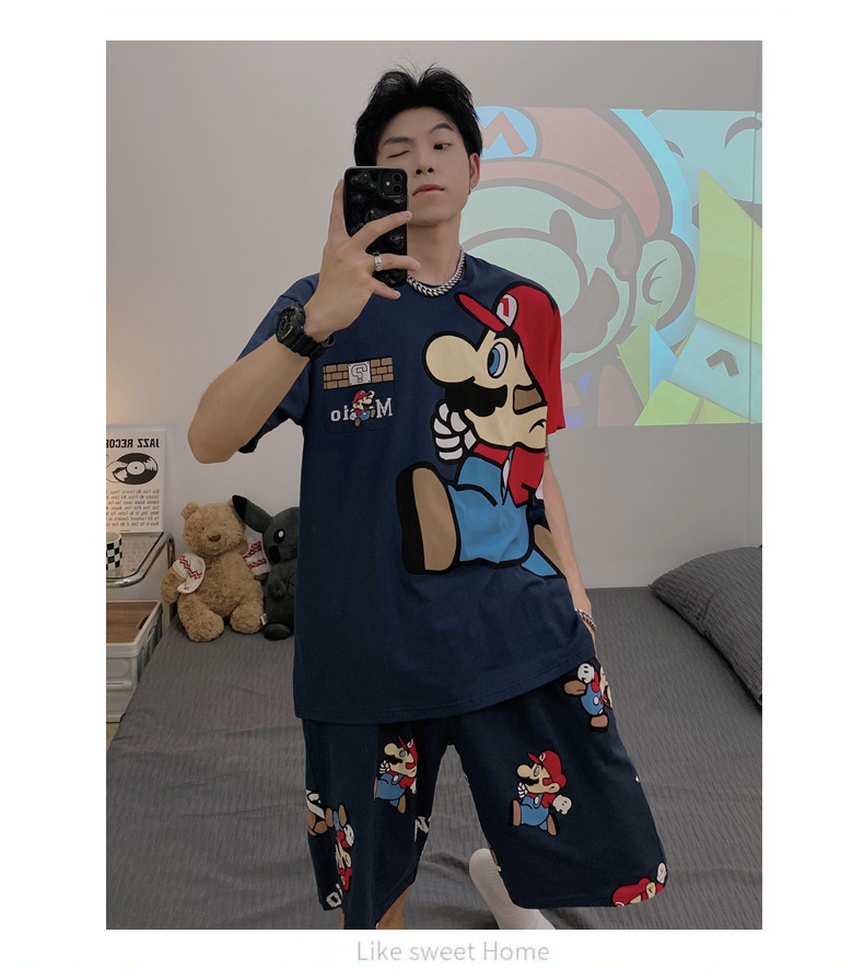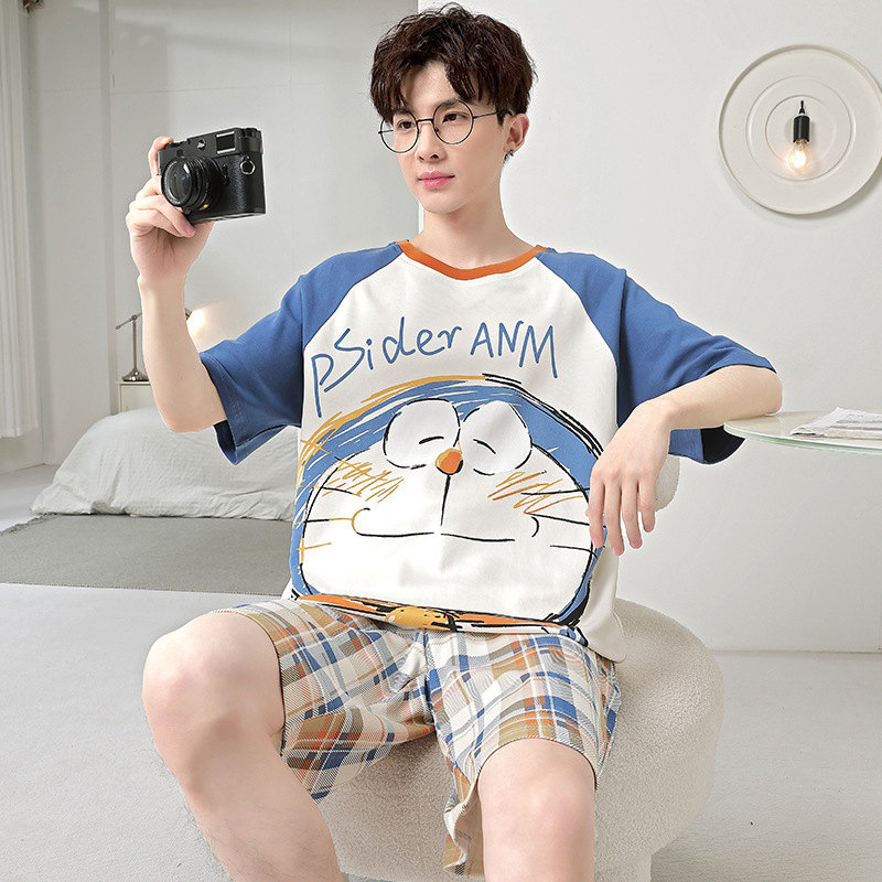 남성 잠옷 여름 순수 코튼 반팔 반바지 얇은 만화 청소년은 플러스 사이즈 홈웨어 세트 외부에서 착용 가능스토어 가기