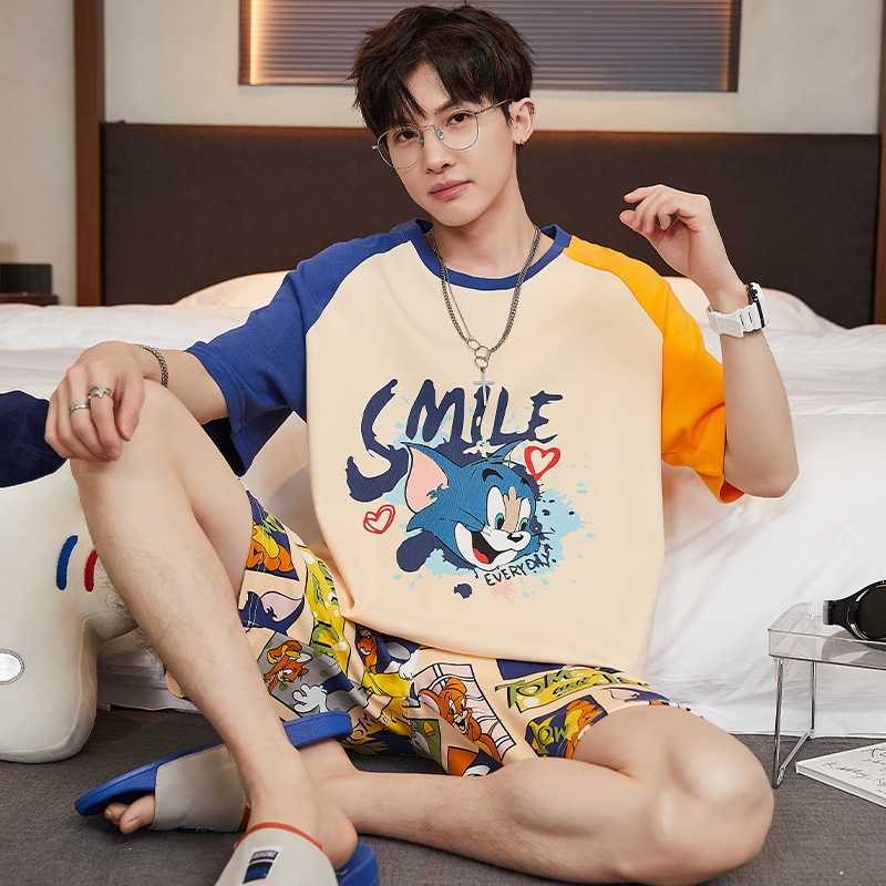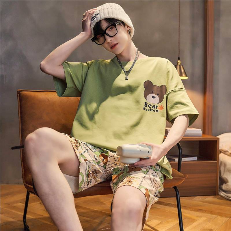 남성 잠옷 여름 순수 코튼 반팔 반바지 얇은 만화 청소년은 플러스 사이즈 홈웨어 세트 외부에서 착용 가능
