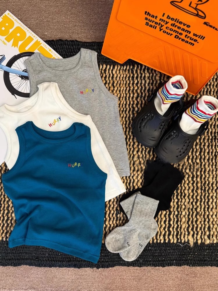 2026년 여름 유행하는 남아 여아용 아동 조끼, 캐주얼하고 다재다능한 배색 문자 자수 순면 민소매 티셔츠