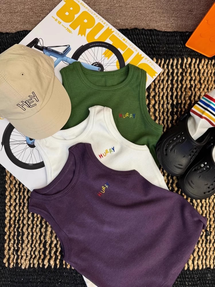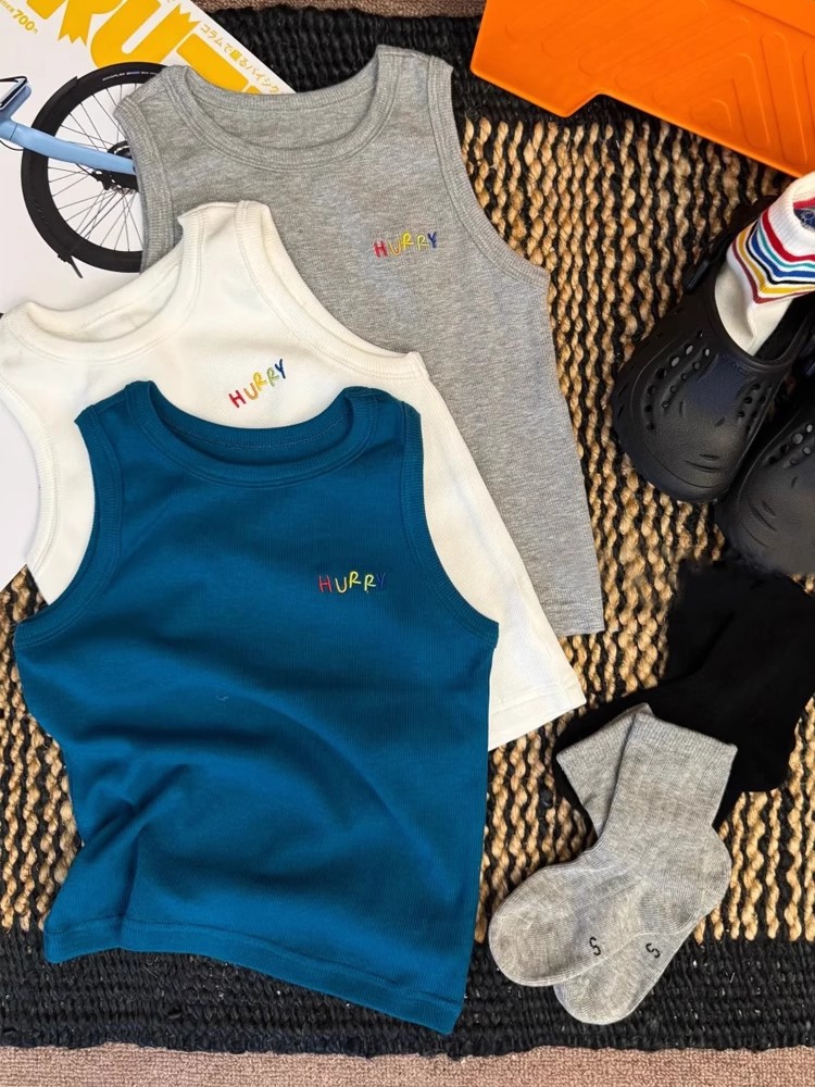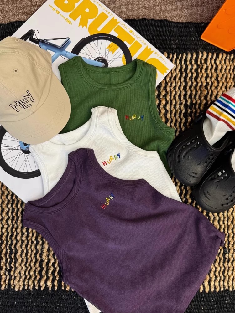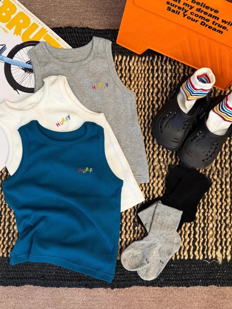 2026년 여름 유행하는 남아 여아용 아동 조끼, 캐주얼하고 다재다능한 배색 문자 자수 순면 민소매 티셔츠스토어 가기