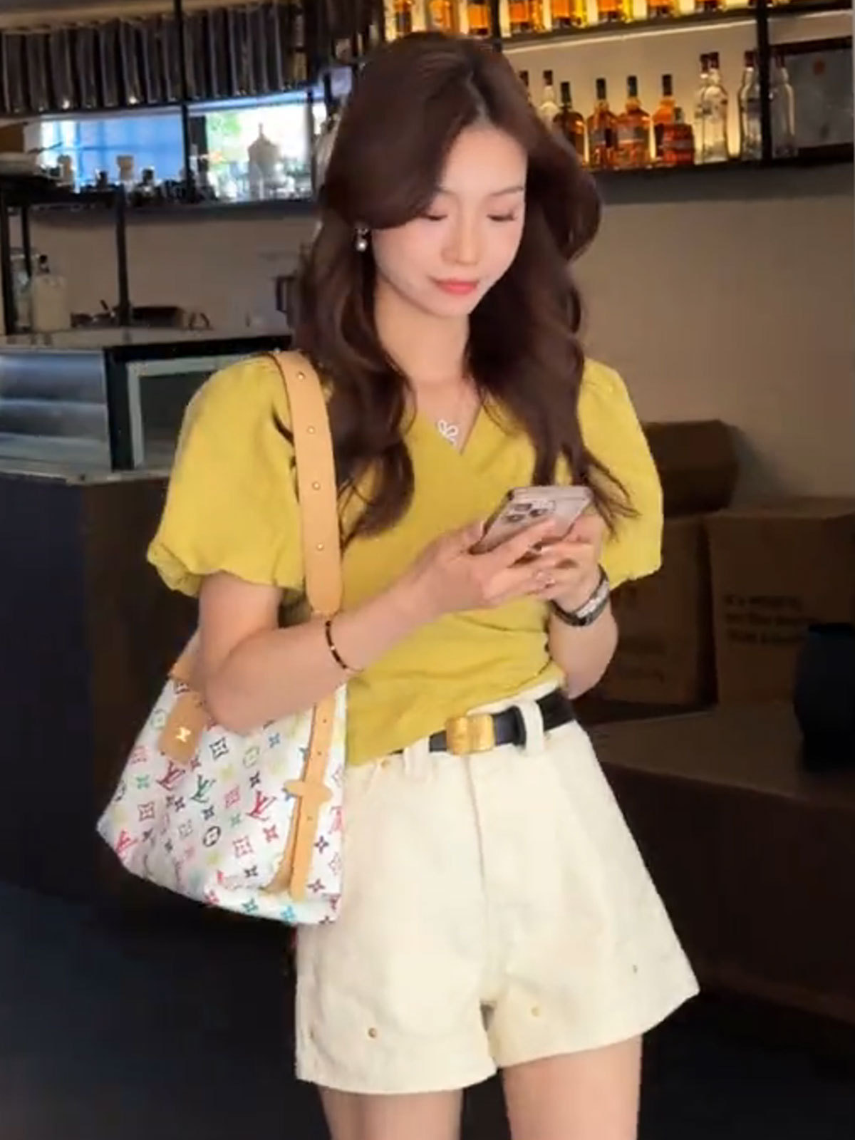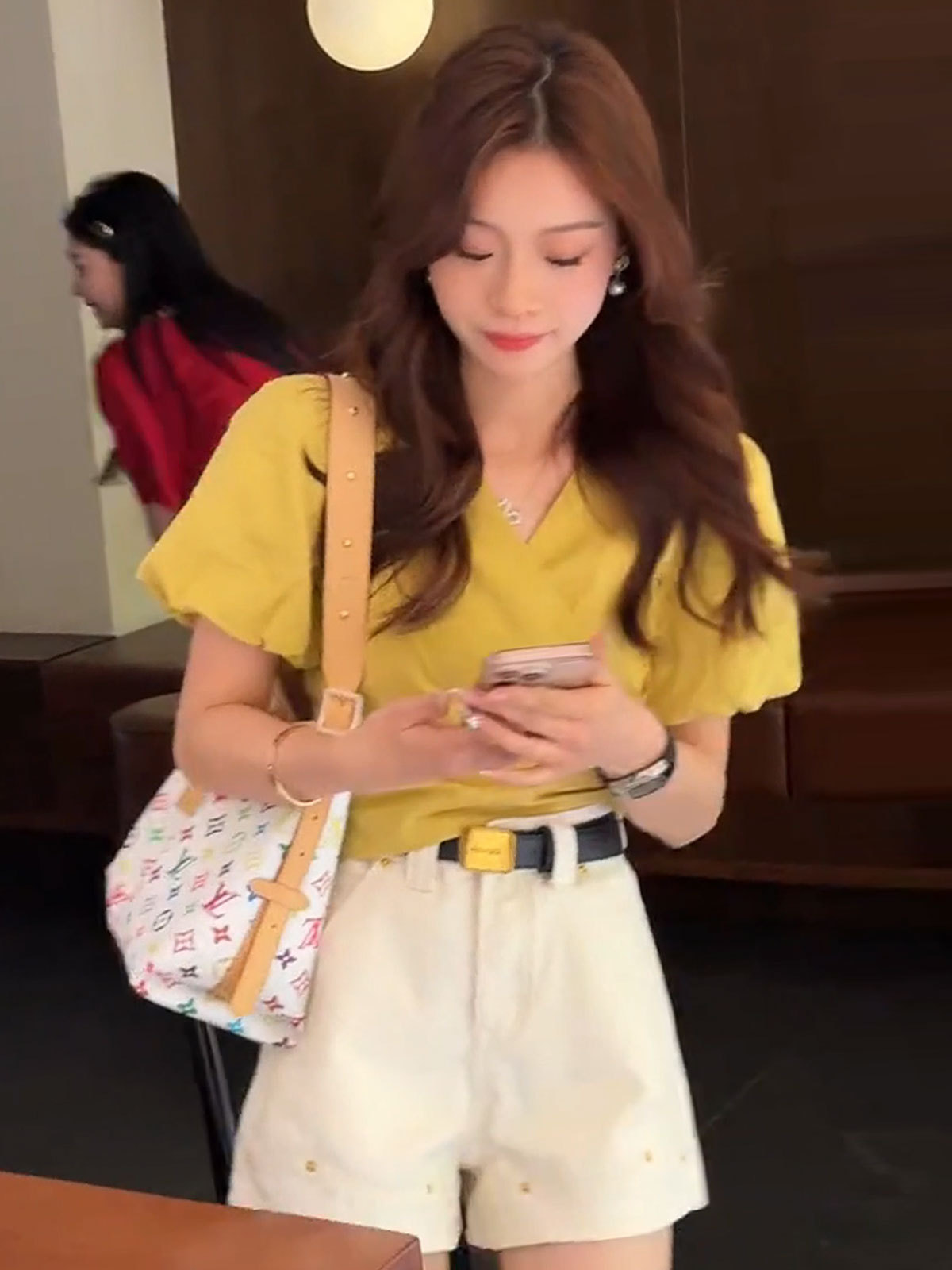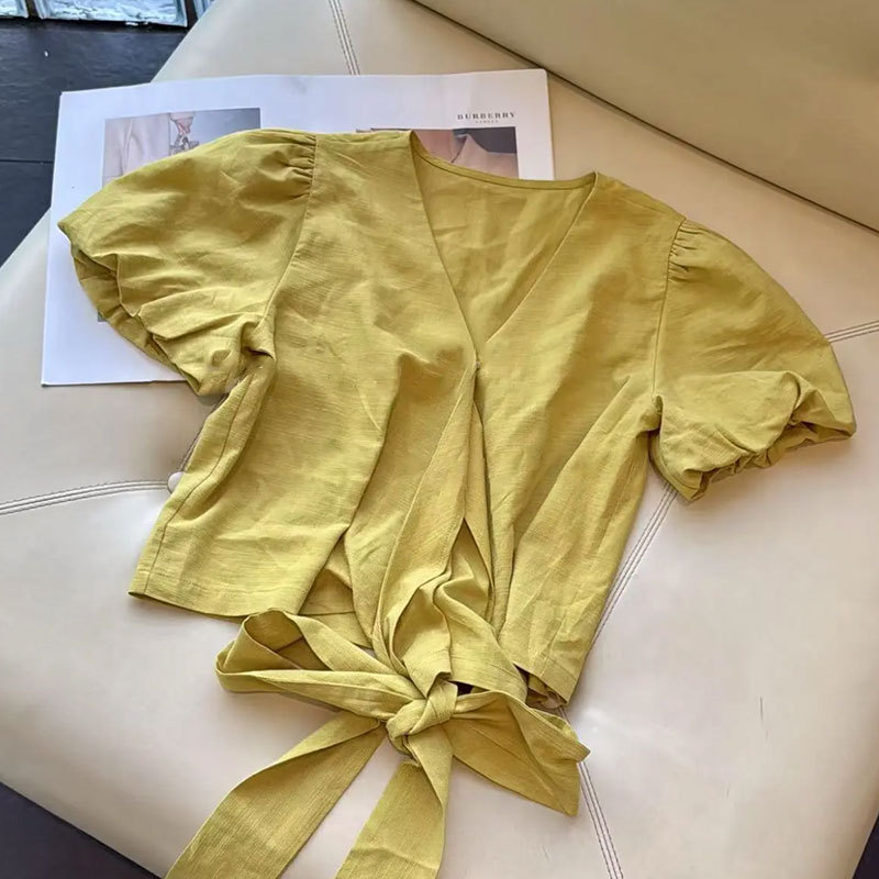 프렌치 젠틀 스타일 슬림핏 크로스 스트랩 허리 브이넥 반팔 셔츠 여성 여름 탑 퍼프 슬리브 셔츠