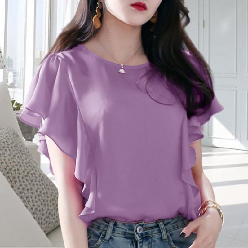 우아한 러플 쉬폰 셔츠 반팔 여름 신작 대형 루즈 슬리밍 티셔츠 여성용 배 커버 탑